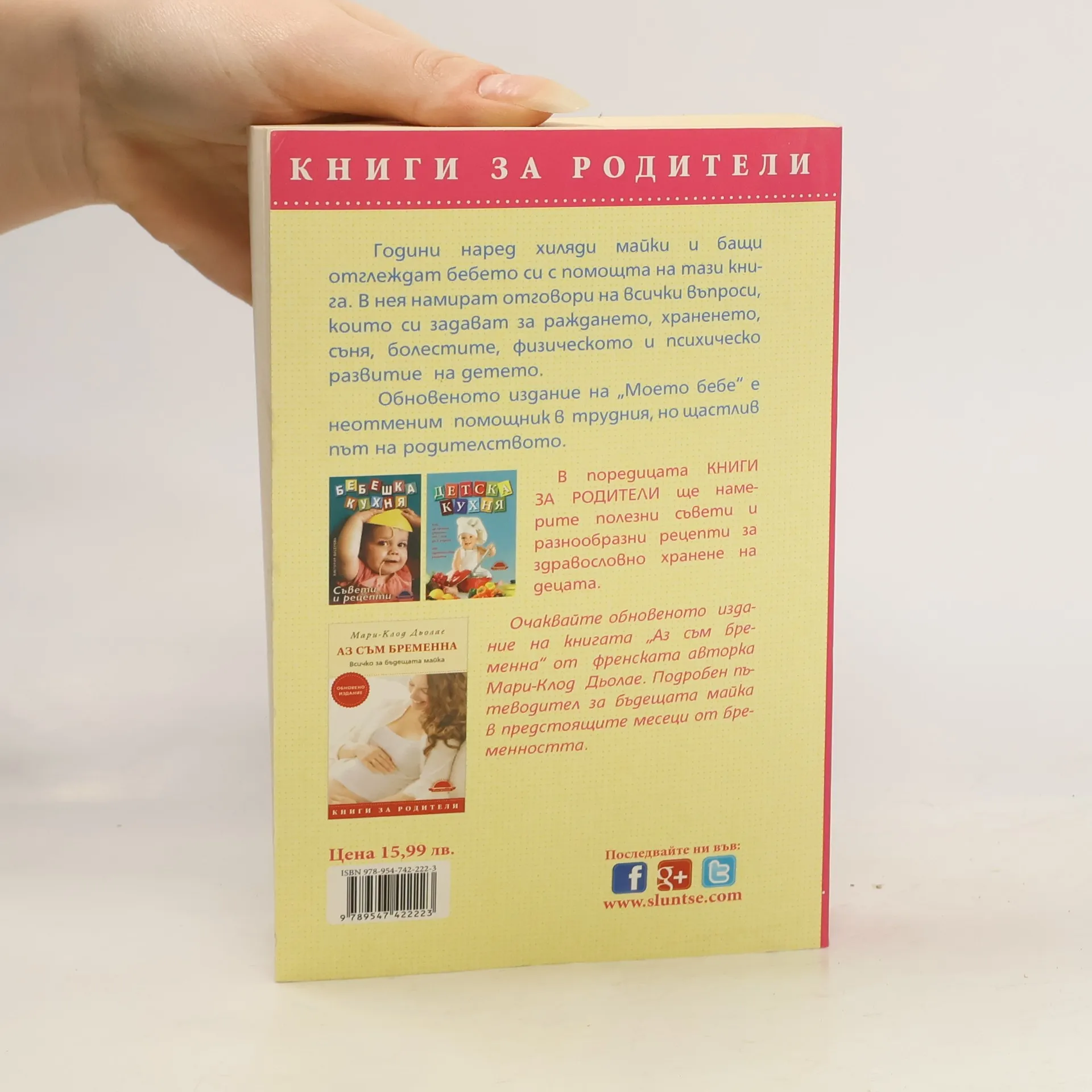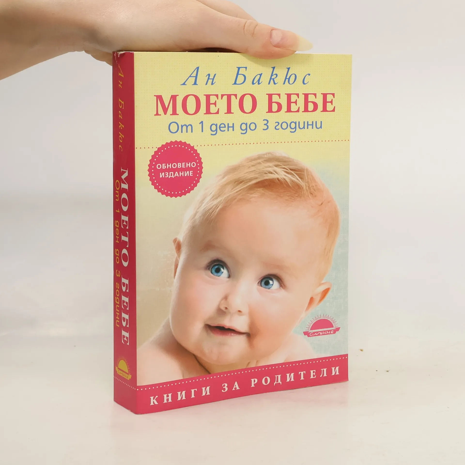 Издателство „Слънце“ предлага на читателите си, обновеното и преработено издание „Моето бебе от 1 ден до 3 години“ от френската авторка Ан Бакюс, фронтмен на поредицата „Книги за родители“. Години наред хиляди български родители отглеждат бебето си с тази книга. Тя продължава да е търсен, необходим приятел и съветник, истинска енциклопедия, за неповторимите преживявания на всички майки и бащи, които очакват рожбата си, и имат нужда от помощ и напътствия. Книгата е практичен наръчник, който придружава родителите и детето през първите 36 месеца от живота му. Какви са настъпващите промени в света на малкото бебе, етапите на хранене, какво да правят когато то плаче, каква е ролята на играчките, на родителските гласове, на четенето и пеенето, и най-вече – как да се грижат за него съобразно собствените му нужди. В книгата се предлага и специална глава с практични съвети при различни заболявания на малкото бебе, коментар на документите, които майката получава в родилното отделение и от педиатъра, задължителен и препоръчителен български имунизационен календар, полезна информация в трудните моменти от отглеждането на детето.„Моето бебе“ е основана на обичта, нежността и търпението на младите родители. Издателството изказва благодарности на проф. д-р Боряна Слънчева, завеждащ клиниката по неонатология в „Майчин Дом“, консултант на обновеното издание, която адаптира медицинската част на книгата за българските читатели. ЗА АВТОРКАТА: Ан Бакюс е световно признат авторитет в областта на детската психология и педиатрия, майка е на две деца. Дълги години с книгите си тя подготвя и българските родители за тяхната нова отговорност и ги съветва за всички проблеми, които възникват след раждането на тяхната първа рожба.„Не исках да напиша поредната книга по този въпрос, исках да предложа на читателя своеобразен наръчник за родители, които са убедени, че не трябва да робуват на модата, а да се вслушват в самото дете. Като майка писах книгата със съзнанието, че бих искала и аз да разполагах с нея по времето, когато се роди първото ми дете.“ – споделя авторката Ан Бакюс.