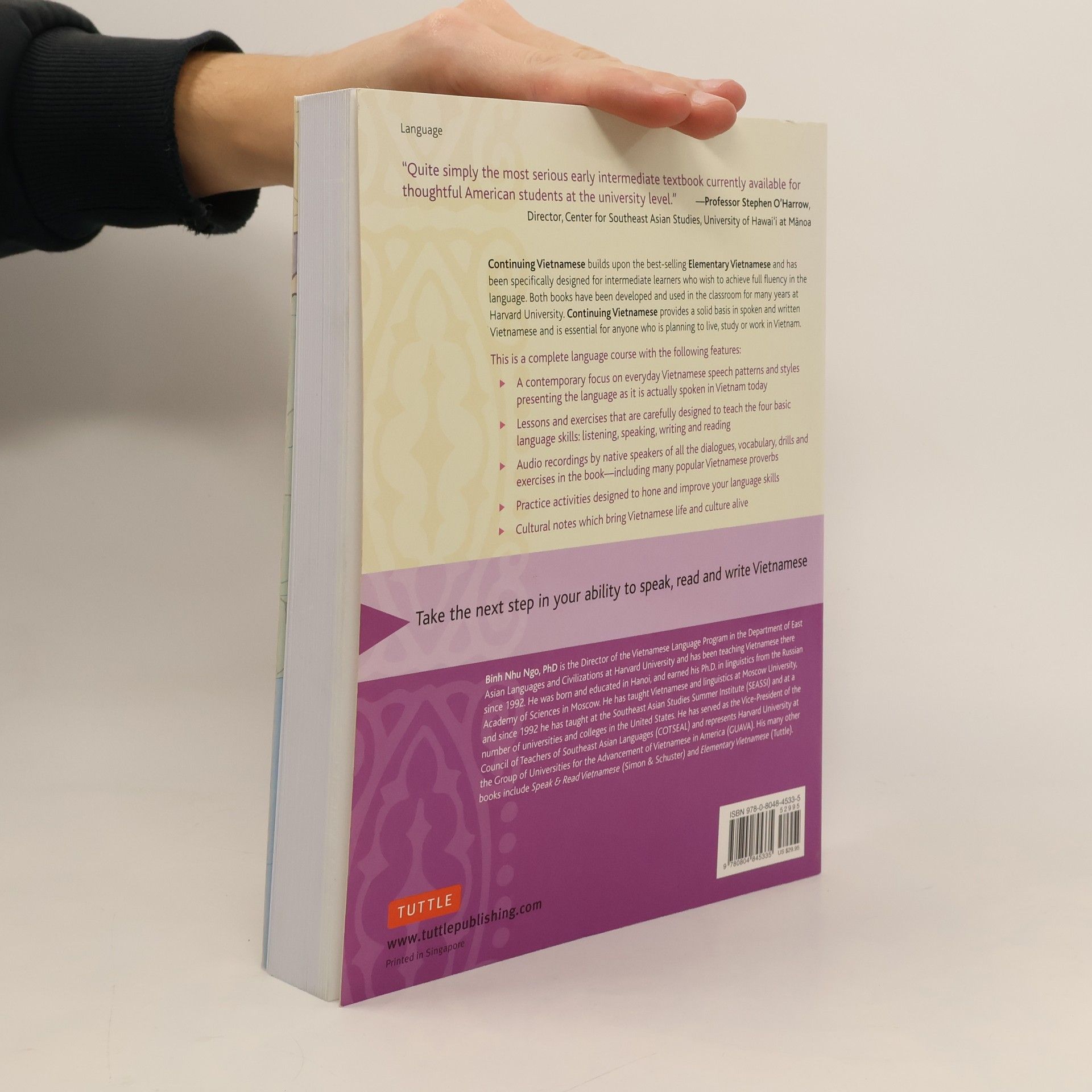 "Quite simply the most serious early intermediate textbook currently available for thoughtful American students at the university level."-- Professor Stephen O'Harrow, Director, Center for Southeast Asian Studies, University of Hawai'i at ManoaThis is a second-year, intermediate Vietnamese language course designed for high school, college or self-study.Continuing Vietnamese is your next step toward master; it follows the best-selling, linguistically-based Elementary Vietnamese , and helps you progress to an intermediate level of communicating in Vietnamese. Invaluable for anyone planning to travel, study or work in Vietnam, this complete language course has been extensively tested at Harvard University. The accompanying MP3 audio CD helps to develop listening comprehension and ensure correct pronunciation.The book contains ten lessons, each composed of two parts. Part 1, the dialogue part, introduces the learner to conversational Vietnamese as it's currently spoken in Hanoi so that the learner will be able to participate in engaging conversation on a variety of topics. Part 2, the narrative part , includes written materials that are characteristic of formal Vietnamese. It aims to develop the learner's reading and writing skills as well as speaking skills. The lessons focuse on various aspects of life in present-day Vietnam, including topics such as culture, history, geography, economy, theater, music, tourism, literature, poetry, cinema and sports. Each lesson helps you to learn Vietnamese by building your Vietnamese proficiency using several complementary elements to thoroughly develop your skills in reading, writing, listening and speaking.Key features of Continuing Vietnamese All disc content is alternatively accessible on tuttlepublishing.com/downloadable-con....