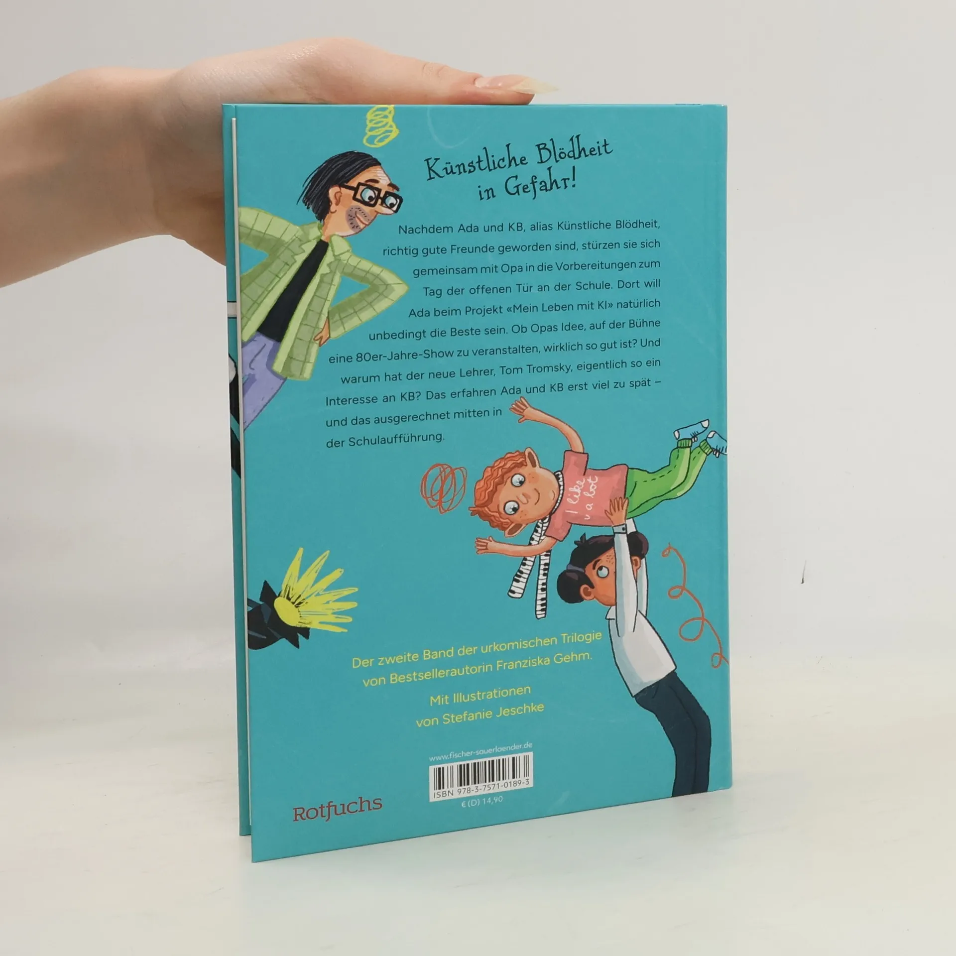 Ada und ihre künstliche Blödheit stürzen sich ins nächste urkomische Abenteuer: Eine ungewöhnliche Robotergeschichte für Kinder ab 10 Jahren und alle, die sich gern schieflachen! Nachdem Ada und KB, alias Künstliche Blödheit, richtig gute Freunde geworden sind, stürzen sie sich gemeinsam mit Opa in die Vorbereitungen zum Tag der offenen Tür an der Schule. Dort will Ada beim Projekt «Mein Leben mit KI» natürlich unbedingt die Beste sein . Obwohl Opas Idee, auf der Bühne eine 80er-Jahre-Show zu veranstalten, möglicherweise das Gegenteil bewirkt. Und warum hat der neue Lehrer, Tom Tromsky, eigentlich so ein besonderes Interesse an KB? Das erfahren Ada und KB erst viel zu spät – denn ein Angriff von KI-Gegnern mitten in der Schulaufführung bringt alles durcheinander. Und Tom Tromsky in große Gefahr. Eine rasante und irrwitzige Kinderbuchreihe um eine besondere Freundschaft für Kinder ab 10 Jahren. Franziska Gehm begeistert Kinder mit Abenteuern voller Witz und Herz, die zum Selberlesen und Lachen einladen. Mit lustigen Schwarz-Weiß-Bildern von Stefanie Jeschke.