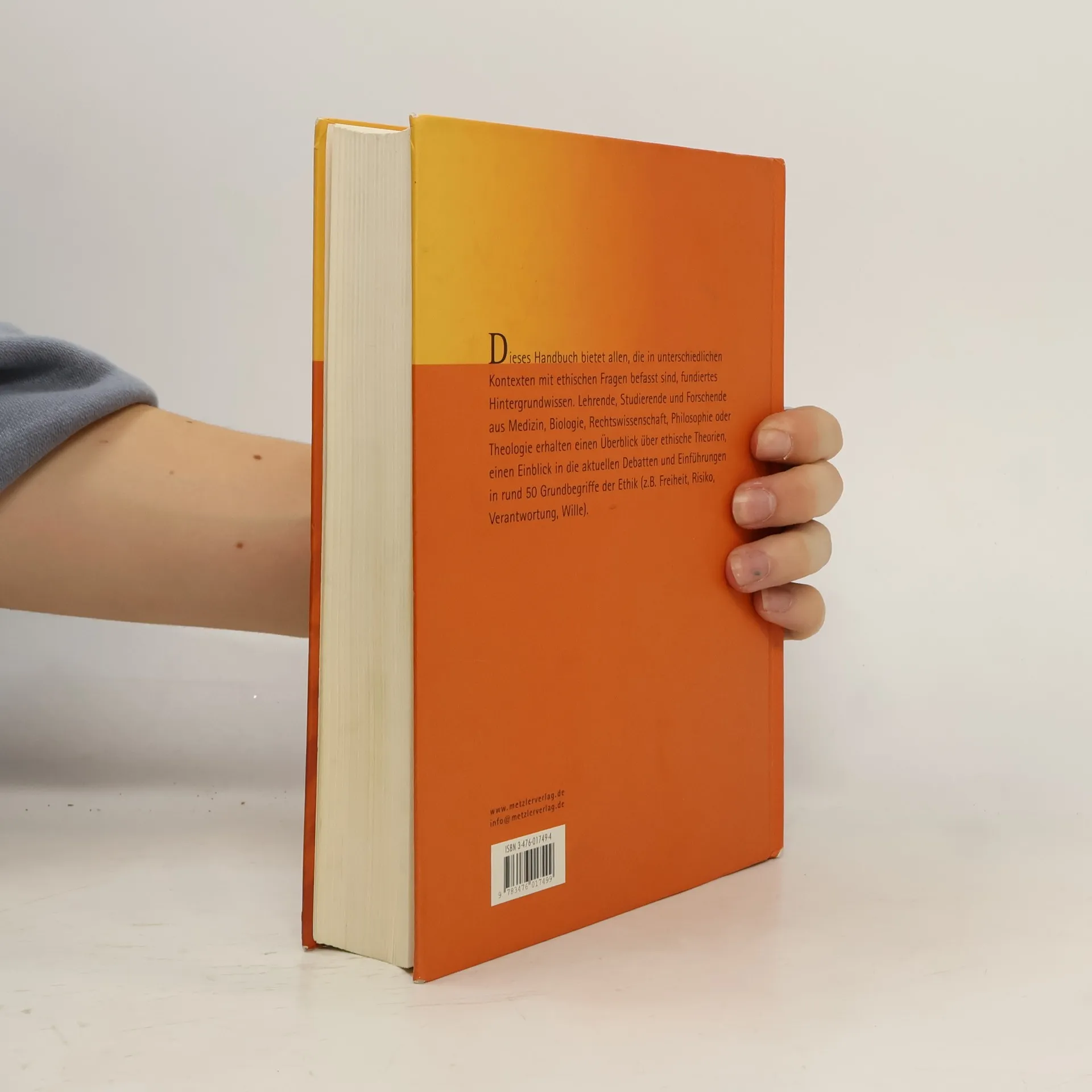 Dieses Handbuch bietet allen, die in unterschiedlichen Kontexten mit ethischen Fragen befasst sind, fundiertes Hintergrundwissen. Lehrende, Studierende und Forschende aus Medizin, Biologie, Rechtswissenschaft, Philosophie oder Theologie erhalten einen Überblick über ethische Theorien, einen Einblick in die aktuellen Debatten und Einführungen in rund 50 Grundbegriffe der Ethik, darunter Freiheit, Risiko, Verantwortung, Wille.