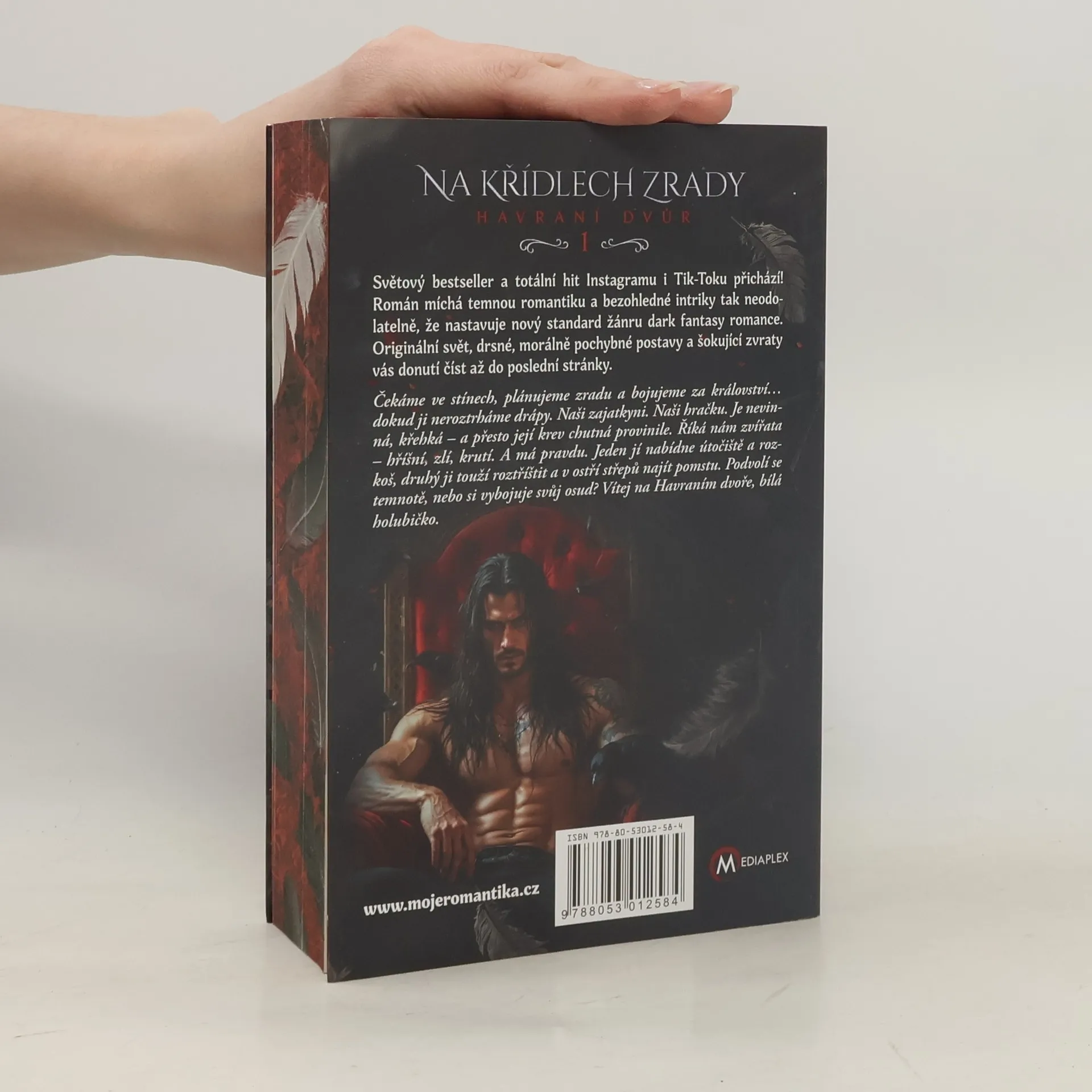 Na křídlech zrady, první díl z duologie Havraní dvůr, je fantasy příběh o dvou morálně zkažených havraních měničích a mladé ženě v pasti jejich stínů. Tento svět je plný násilí, posedlosti a antihrdinů. Co tato kniha neobsahuje, je kladný hrdina – protože padouši to umí lépe. A dva to umí lépe než jeden… Světový bestseller a totální hit Instagramu i Tik-Toku přichází! Román míchá temnou romantiku a bezohledné intriky tak neodolatelně, že nastavuje nový standard žánru dark fantasy romance. Originální svět, drsné, morálně pochybné postavy a šokující zvraty vás donutí číst až do poslední stránky. Čekáme ve stínech, plánujeme zradu a bojujeme za království… dokud ji neroztrháme drápy. Naši zajatkyni. Naši hračku. Je nevinná, křehká – a přesto její krev chutná provinile. Říká nám zvířata – hříšní, zlí, krutí. A má pravdu. Jeden jí nabídne útočiště a rozkoš, druhý ji touží roztříštit a v ostří střepů najít pomstu. Podvolí se temnotě, nebo si vybojuje svůj osud? Vítej na Havraním dvoře, bílá holubičko.