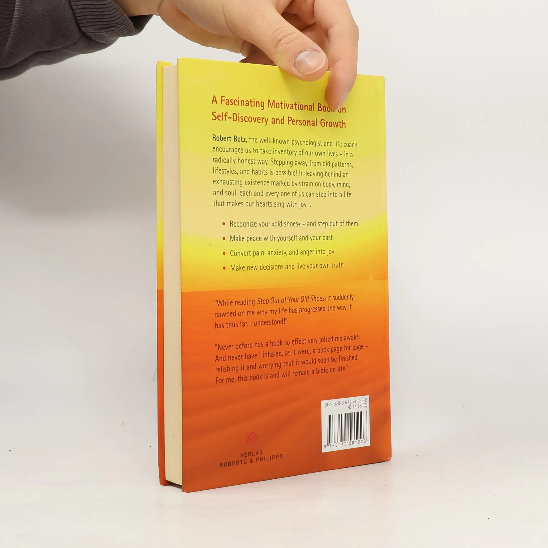 A Fascinating Motivational Book on Self-Discovery and Personal Growth Robert Betz, the well-known psychologist and life coach, encourages us to take inventory of our own lives – in aradically honest way. Stepping away from old patterns, lifestyles, and habits is possible! In leaving behind an exhausting existence marked by strain on body, mind, and soul, each and every one of us can step into a life that makes our hearts sing with joy … • Recognize your 'old shoes' – and step out of themy • Make peace with yourself and your past • Convert pain, anxiety, and anger into joy • Make new decisions and live your own truth “While reading Step Out of Your Old Shoes! it suddenly dawned on me why my life has progressed the way it has thus far. I understood!” “Never before has a book so effectively jolted me awake. And never have I inhaled, as it were, a book page for page – relishing it and worrying that it would soon be finished. For me, this book is and will remain a bible on life.”