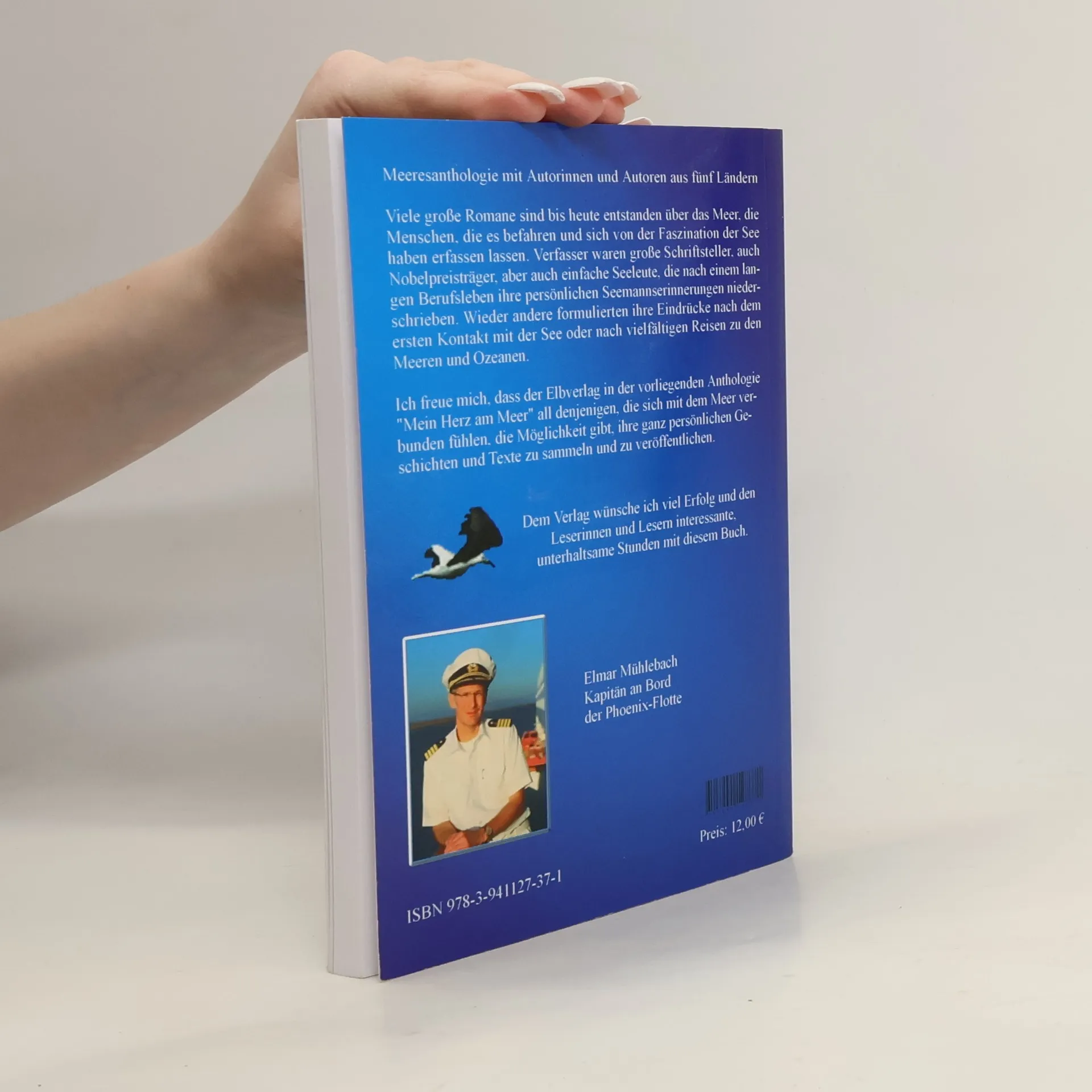 Mein Herz am Meer, eine Anthologie mit Geschichten, Haiku, Elfchen und Gedichten von > 100 Autorinnen und Autoren aus fünf Ländern und einem Buchklappentext von Kapitän zur See Elmar Mühlebach