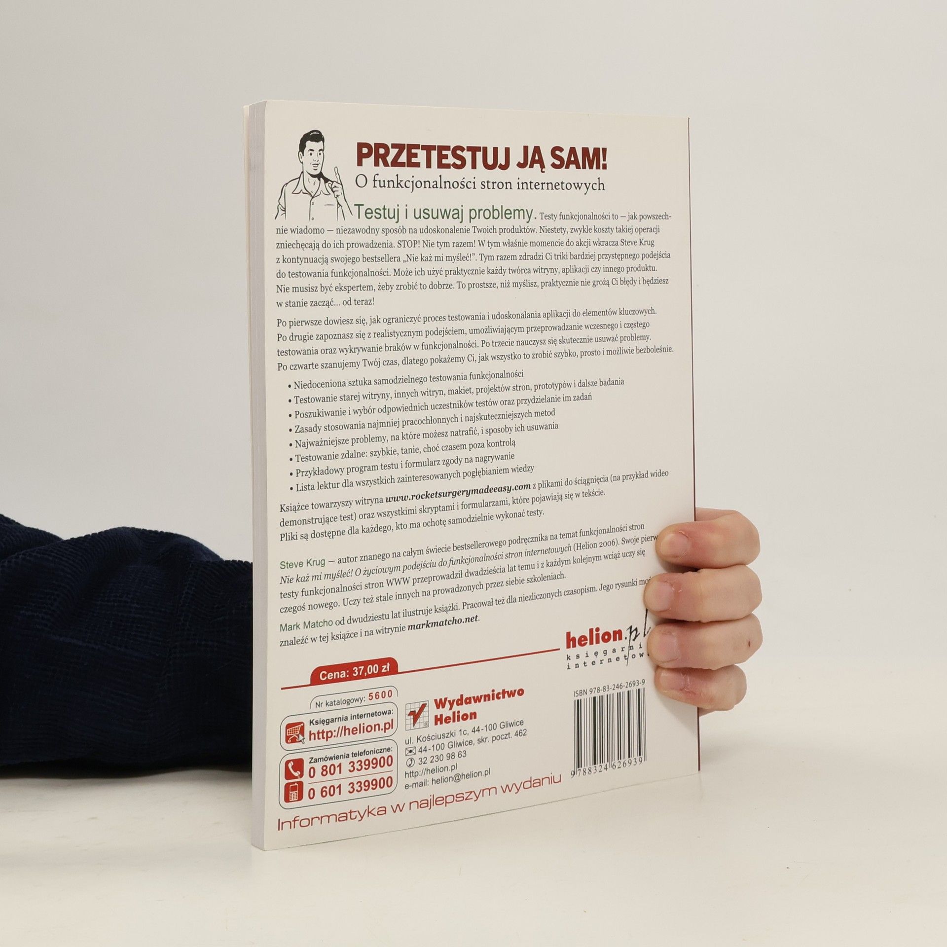 Testy funkcjonalności to — jak powszechnie wiadomo — niezawodny sposób na udoskonalenie Twoich produktów. Niestety, zwykle koszty takiej operacji zniechęcają do ich prowadzenia. STOP! Nie tym razem! W tym właśnie momencie do akcji wkracza Steve Krug z kontynuacją swojego bestsellera "Nie każ mi myśleć". Tym razem zdradzi Ci triki bardziej przystępnego podejścia do testowania funkcjonalności. Może ich użyć praktycznie każdy twórca witryny, aplikacji czy innego produktu. Nie musisz być ekspertem, żeby zrobić to dobrze. To prostsze, niż myślisz, praktycznie nie grożą Ci błędy i będziesz w stanie zacząć ….od teraz!