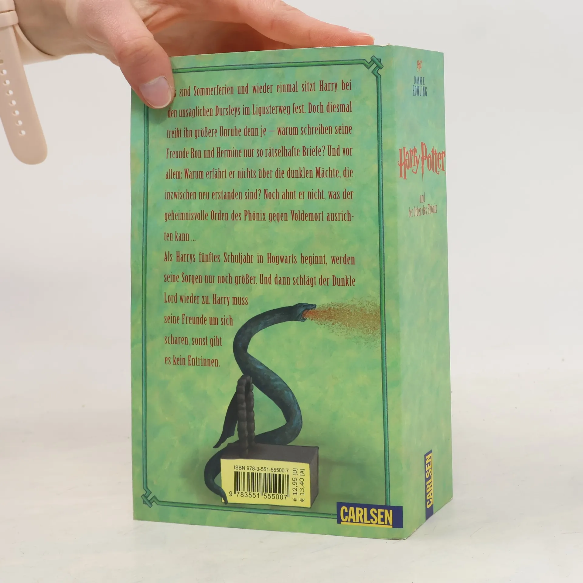 Es sind Sommerferien und wieder einmal sitzt Harry bei den unmöglichen Dursleys im Ligusterweg fest. Doch diesmal treibt ihn größere Unruhe denn je - Warum schreiben seine Freunde Ron und Hermine nur so rätselhafte Briefe? Und vor allem: Warum erfährt er nichts über die dunklen Mächte, die inzwischen neu erstanden sind und sich unaufhaltsam über Harrys Welt verbreiten? Noch weiß er nicht, was der geheimnisvolle Orden des Phönix gegen Du-weißt-schon-wen ausrichten kann ... Als Harrys fünftes Schuljahr in Hogwarts beginnt, werden seine Sorgen nur noch größer. Die neue Lehrerin Dolores Umbridge macht ihm das Leben zur Hölle. Sie glaubt Harry einfach nicht, dass Voldemort zurück ist. Doch bald schlägt der Dunkle Lord wieder zu. Nun muss Harry seine Freunde um sich scharen, sonst gibt es kein Entrinnen.