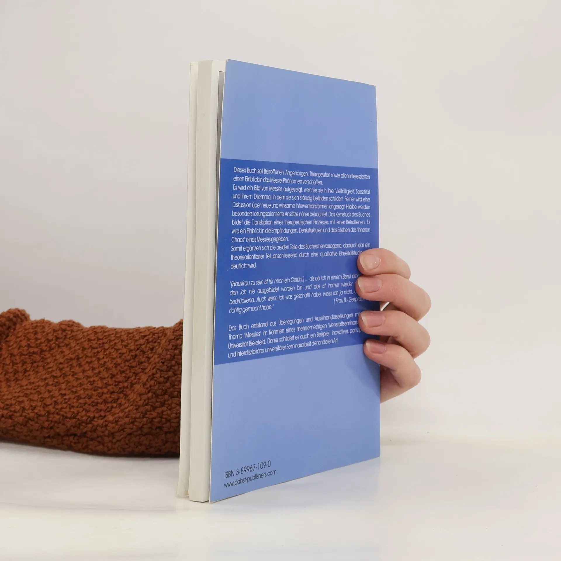 Dieses Buch soll Betroffenen, Angehörigen, Therapeuten sowie allen Interessierten einen Einblick in das Messie-Phänomen verschaffen. Es wird ein Bild von Messies aufgezeigt, welches sie in ihrer Vielfältigkeit, Spezifität und ihrem Dilemma, in dem sie sich ständig befinden schildert. Ferner wird eine Diskussion über neue und wirksame Interventionsformen angeregt. Hierbei werden besonders lösungsorientierte Ansätze näher betrachtet. Das Kernstück des Buches bildet die Transkiption eines therapeutischen Prozesses mit einer Betroffenen. Es wird ein Einblick in die Empfindungen, Denkstrukturen und das Erleben des „inneren Chaos“ eines Messies gegeben. Somit ergänzen sich die beiden Teile des Buches hervorragend, dadurch das ein theorieorientierter Teil anschliessend durch eine qualitative Einzelfallstudie ver-deutlicht wird. „(Hausfrau zu sein ist für mich ein Gefühl,). als ob ich in einem Beruf arbeite, für den ich nie ausgebildet worden bin und das ist immer wieder furchtbar bedrückend. Auch wenn ich was geschafft habe, weiss ich ja nicht, ob ich es richtig gemacht habe.“ (Frau B.- Gespräch 4-) Das Buch entstand aus Überlegungen und Auseinandersetzungen mit dem Thema „Messies“ im Rahmen eines mehrsemestrigen Werkstattseminars an der Universität Bielefeld. Daher schildert es auch ein Beispiel inovativer, partizipativer und interdiszipliärer universitärer Seminararbeit der anderen Art.