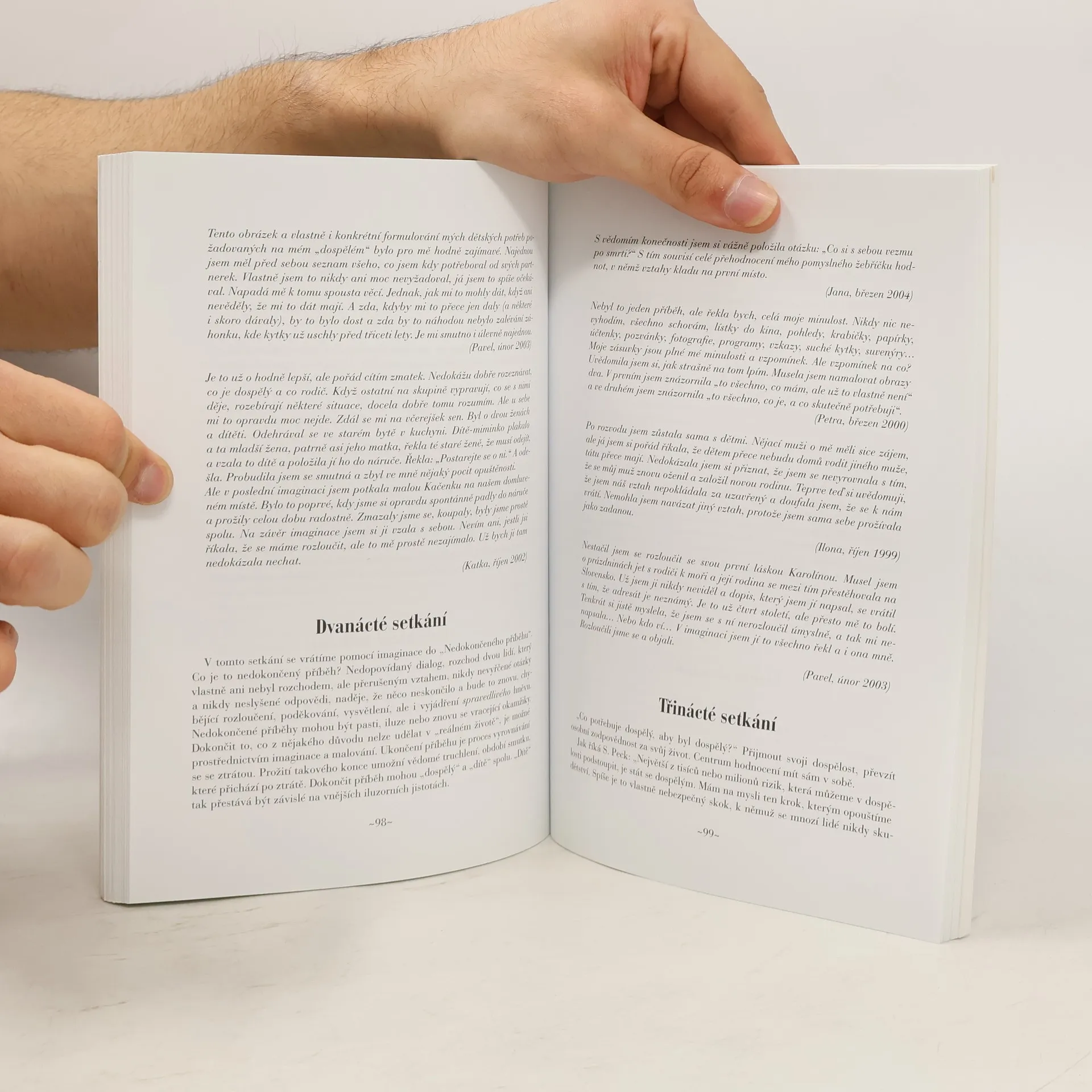 Proces sebevyjádření pomocí výtvarných technik Autorka čerpá ze svých osobních bohatých zkušeností a popisuje čtenářsky přístupnou formou proces práce ve výtvarném ateliéru, kam dochází lidé pracovat v uzavřených skupinách a přibližuje možnosti procesu sebevyjádření pomocí výtvarných technik. Vysvětluje rámce a postupy práce v ateliéru, naznačuje hlavní principy složení struktury osobnosti člověka a inspiruje čtenáře k vlastní práci na sebepoznání popisem jednotlivých bloků a imaginací. V knize je za pomocí autentických výpovědí členů skupin barvitě popsán způsob tvorby, sebevyjádření, sebepřijetí, sebepochopení a následného zpracovávání životní cesty jako tvůrčího a proměnného procesu.