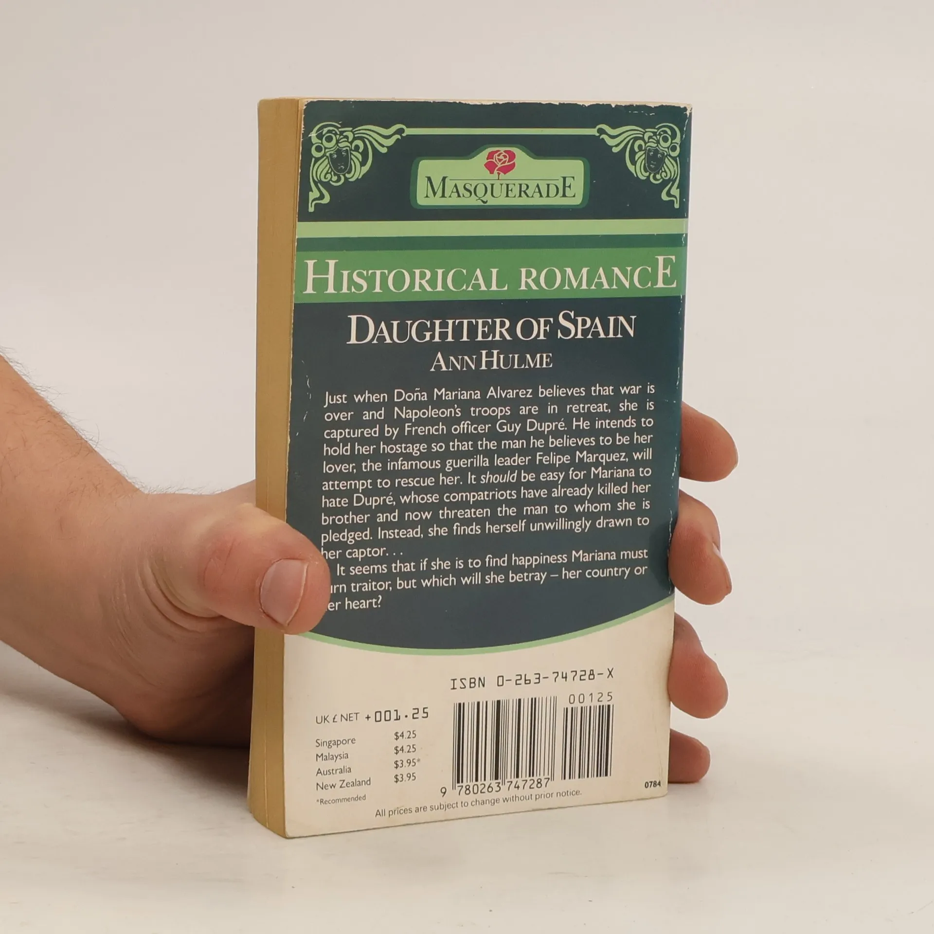Just when Dona Marian Alvarez believes that war is over and Napoleon's troops are in retreat, she is captured by French officer Guy Dupre. He intends to hold her hostage so that the man he believes to be her lover, the infamous guerrilla leader Felipe Marquez, will attempt to rescue her. It should be easy for Mariana to hate Dupre, whose compatriots have already killed her brother and now threaten the man to whom she is pledged. Instead, she finds herself unwillingly drawn to her captor... It seems that if she is to find happiness Mariana must turn traitor, but which will she betray her country or her heart?
