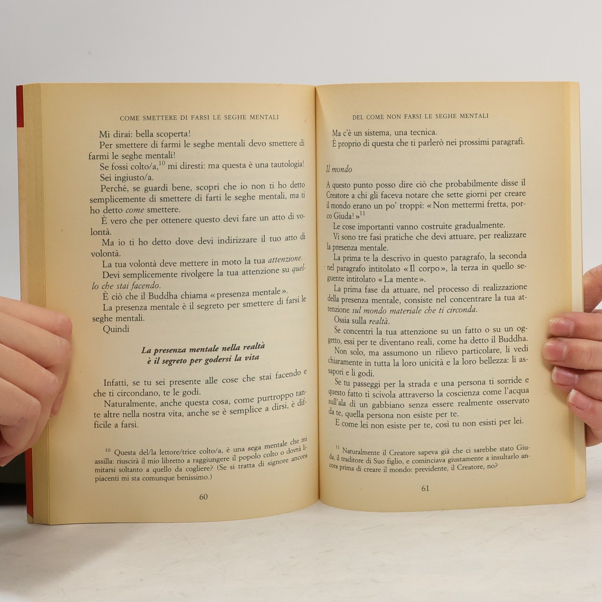 Dietro a questo titolo provocatorio si nasconde un manuale "prêt-à-porter" che i nevrotici, o aspiranti tali, dovrebbero tenere in tasca. Esso utilizza tecniche yoga, buddhiste e zen, praticate da secoli dagli orientali (evidentemente anche loro nevrotici) ma esportabili anche a noi poveri uomini e donne dell'occidente. La nevrosi ci sommerge di ansie e di paure che ci impediscono di gioire della vita e dei rapporti con gli altri. Eliminando il pensiero nevrotico (le seghe mentali) e ritornando a quella realtà da cui esso ci allontana, possiamo imparare a godere delle vita e delle cose che ci stanno intorno. L'autore insegna Fondamenti delle discipline psicologiche orientali all'Università di Genova.