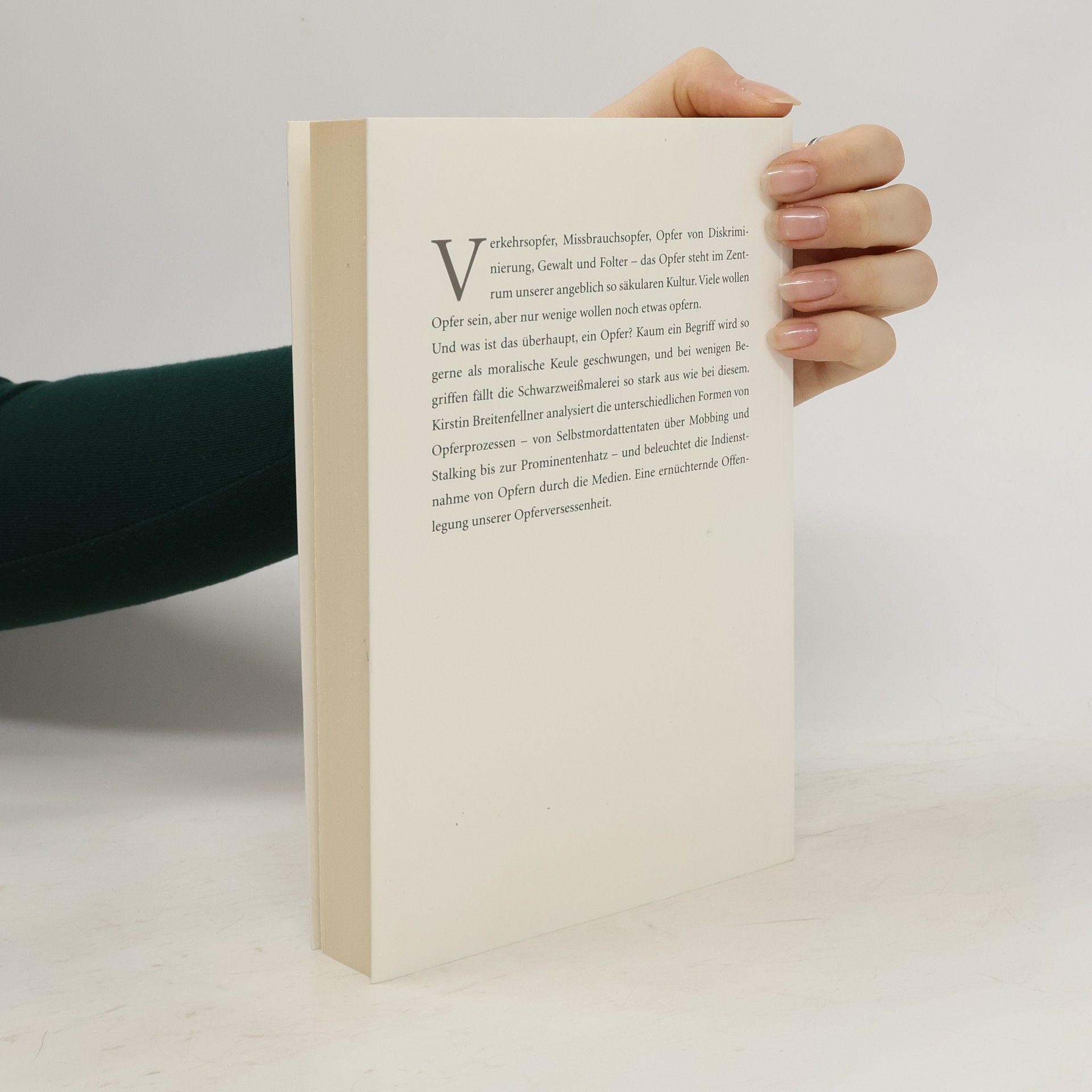 Verkehrsopfer, Missbrauchsopfer, Opfer von Diskriminierung, Gewalt und Folter – das Opfer steht im Zentrum unserer angeblich so säkularen Kultur. Dabei wiegt kaum ein Begriff so tonnenschwer und ist dabei gleichzeitig so vertrackt. Auf keinen anderen Umstand stürzen Medien sich so bereitwillig wie auf den, ein Opfer gefunden zu haben. Kirstin Breitenfellner legt die Wahrnehmung von Opferprozessen in der Öffentlichkeit dar, und analysiert die Interpretation und die Indienstnahme von Opfern für unterschiedlichste Zwecke. Eine ernüchternde Offenlegung unserer Opferversessenheit.