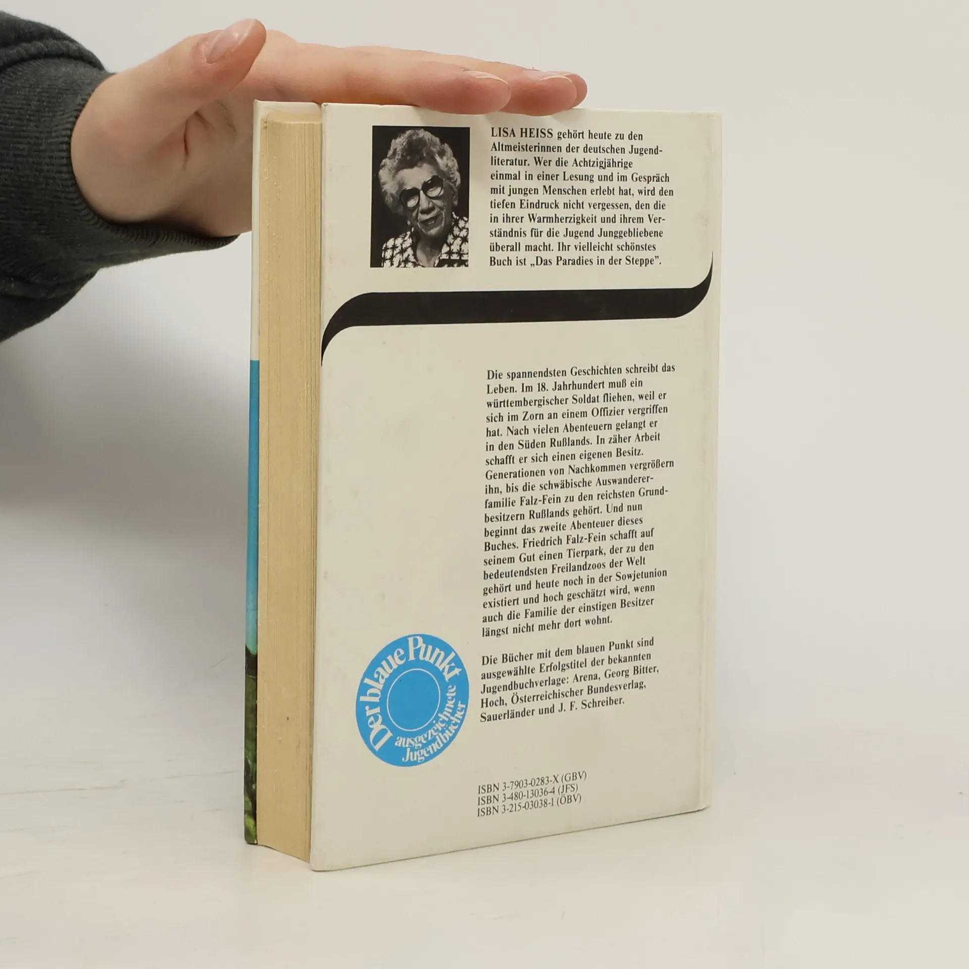 Einbandtext:LISA HEISS gehört heute zu den Altmeisterinnen der deutschen Jugendliteratur. Wer die Achtzigjährige einmal in einer Lesung und im Gespräch mit jungen Menschen erlebt hat, wird den tiefen Eindruck nicht vergessen, den die in ihrer Warmherzigkeit und ihrem Verständnis für die Jugend Junggebliebene überall macht. Ihr vielleicht schönstes Buch ist „Das Paradies in der Steppe".Die spannendsten Geschichten schreibt das Leben. Im 18. Jahrhundert muß ein württembergischer Soldat fliehen, weil er sich im Zorn an einem Offizier vergriffen hat. Nach vielen Abenteuern gelangt er in den Süden Rußlands. In zäher Arbeit schafft er sich einen eigenen Besitz. Generationen von Nachkommen vergrößern ihn, bis die schwäbische Auswandererfamilie Falz-Fein zu den reichsten Grundbesitzern Rußlands gehört. Und nun beginnt das zweite Abenteuer dieses Buches. Friedrich Falz-Fein schafft auf seinem Gut einen Tierpark, der zu den bedeutendsten Freilandzoos der Welt gehört und heute noch in der Sowjetunion existiert und hoch geschätzt wird, wenn auch die Familie der einstigen Besitzer längst nicht mehr dort wohnt.