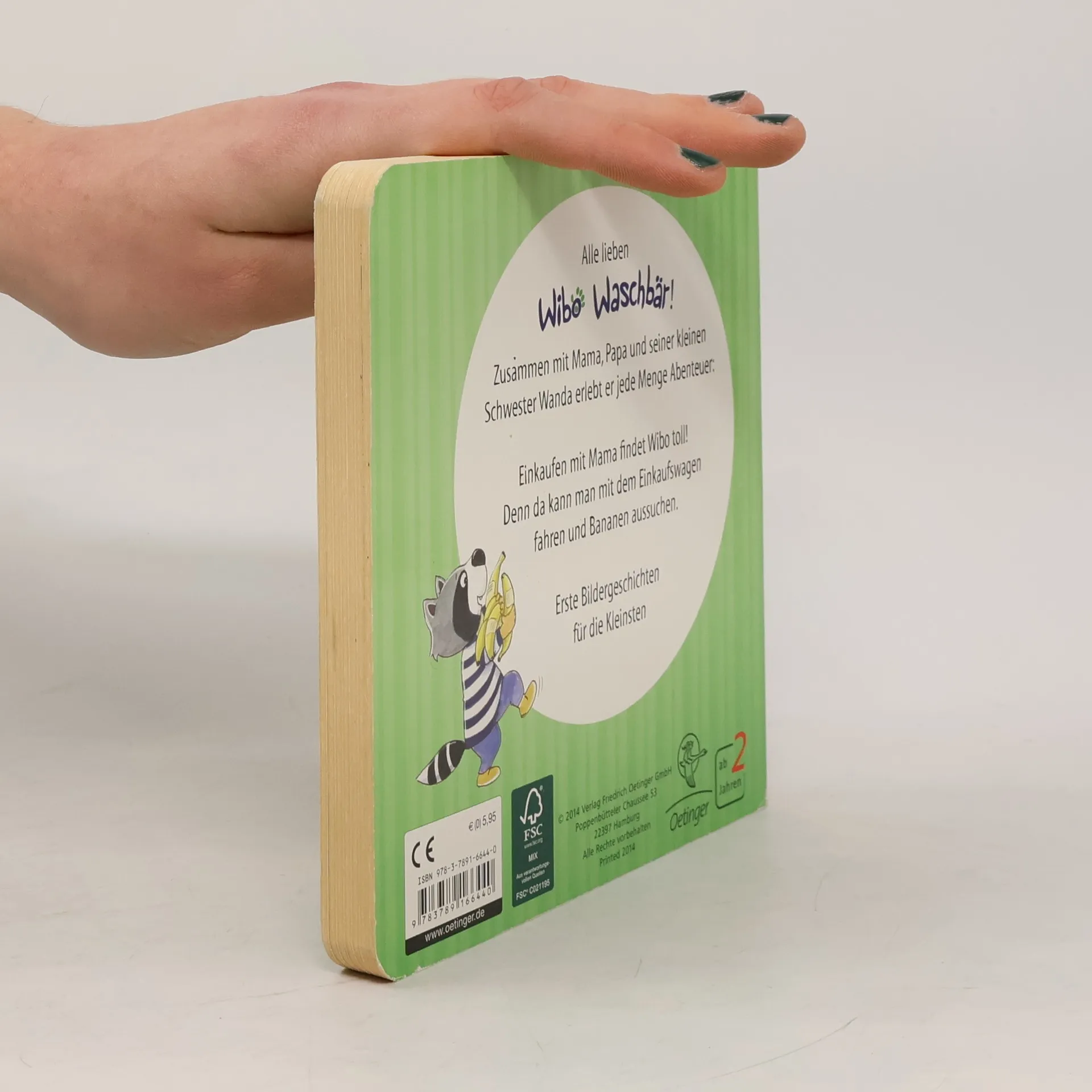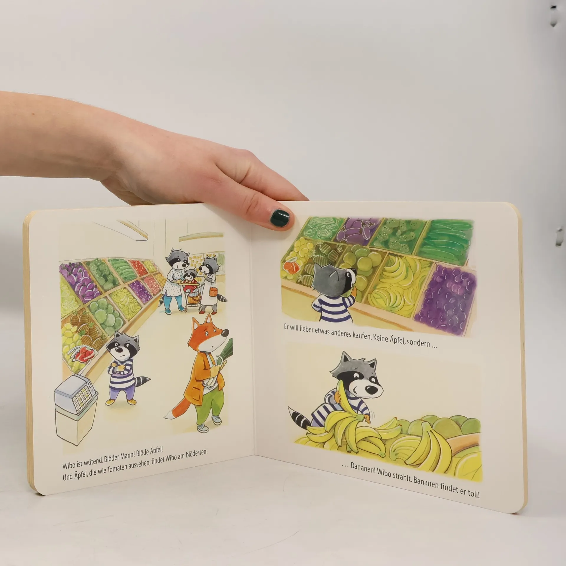 Wibo Waschbär geht mit Mama und Wanda einkaufen und hat viel Spaß dabei. Besonders liebt er es, Bananen zu wiegen, was dazu führt, dass Mama immer Bananen kaufen muss. Eine charmante Bildergeschichte aus dem Kinderalltag, ergänzt mit einem Wimmelbild.