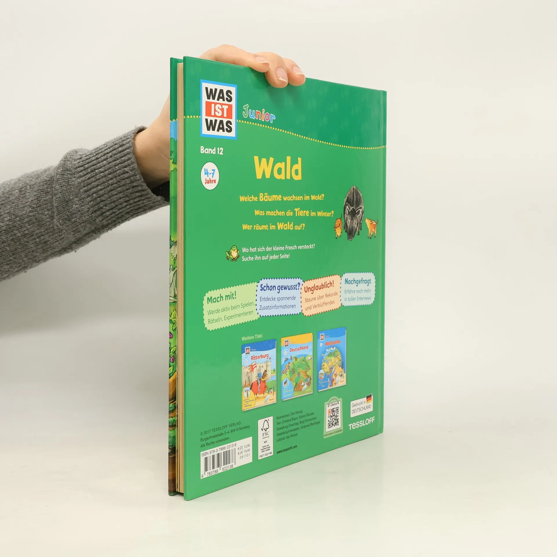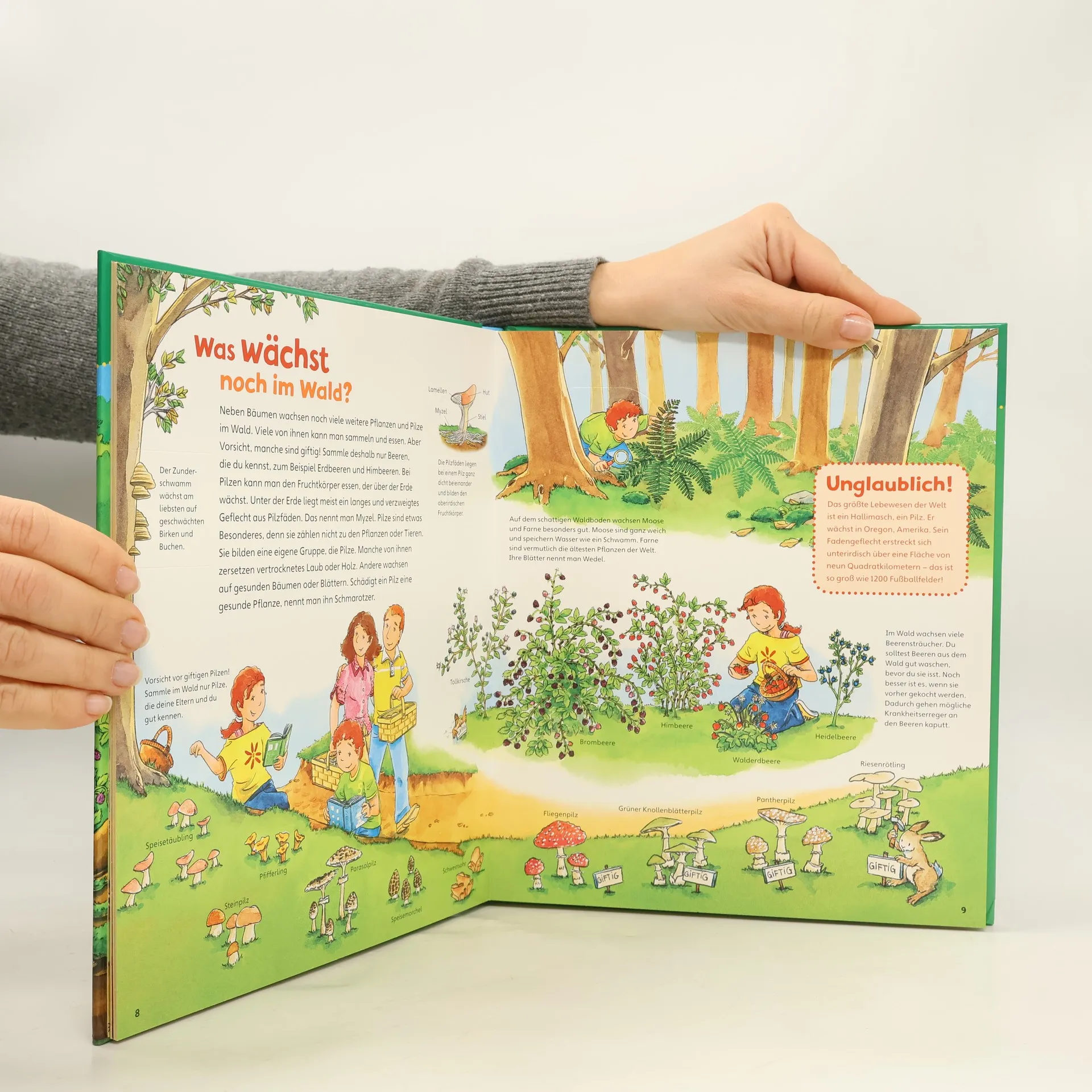 Nur wer genau hinschaut erkennt: Ein Wald besteht aus viel mehr als nur aus Bäumen. Die Vielfalt der Pflanzen und Tiere ist nahezu unerschöpflich, und jede Jahreszeit hat ihre Reize. Wälder produzieren, wie alle grünen Pflanzen, den für uns so wichtigen Sauerstoff. Gleichzeitig bauen sie dabei das schädliche Kohlendioxid ab. Außerdem festigen Bäume mit ihren Wurzeln den Boden und sie bremsen starke Winde ab. Dieses erste Sachbuch begleitet Kinder ab 4 Jahren in die Natur und regt zum Entdecken und Differenzieren an. Farbenfrohe Illustrationen und kurze altersgerechte Texte, Entdecker-Klappen, kleine Spiele und Rätsel sorgen für Wissen, Spaß und Abwechslung: „Unglaublich!“ Das größte Lebewesen der Welt ist ein Hallimasch, ein Pilz! „Schon gewusst?“ Die höchsten Bäume der Welt sind die Mammutbäume! „Mach mit!“ Im Schnee haben Waldbewohner Spuren hinterlassen. Zu welchen Tieren gehören sie?