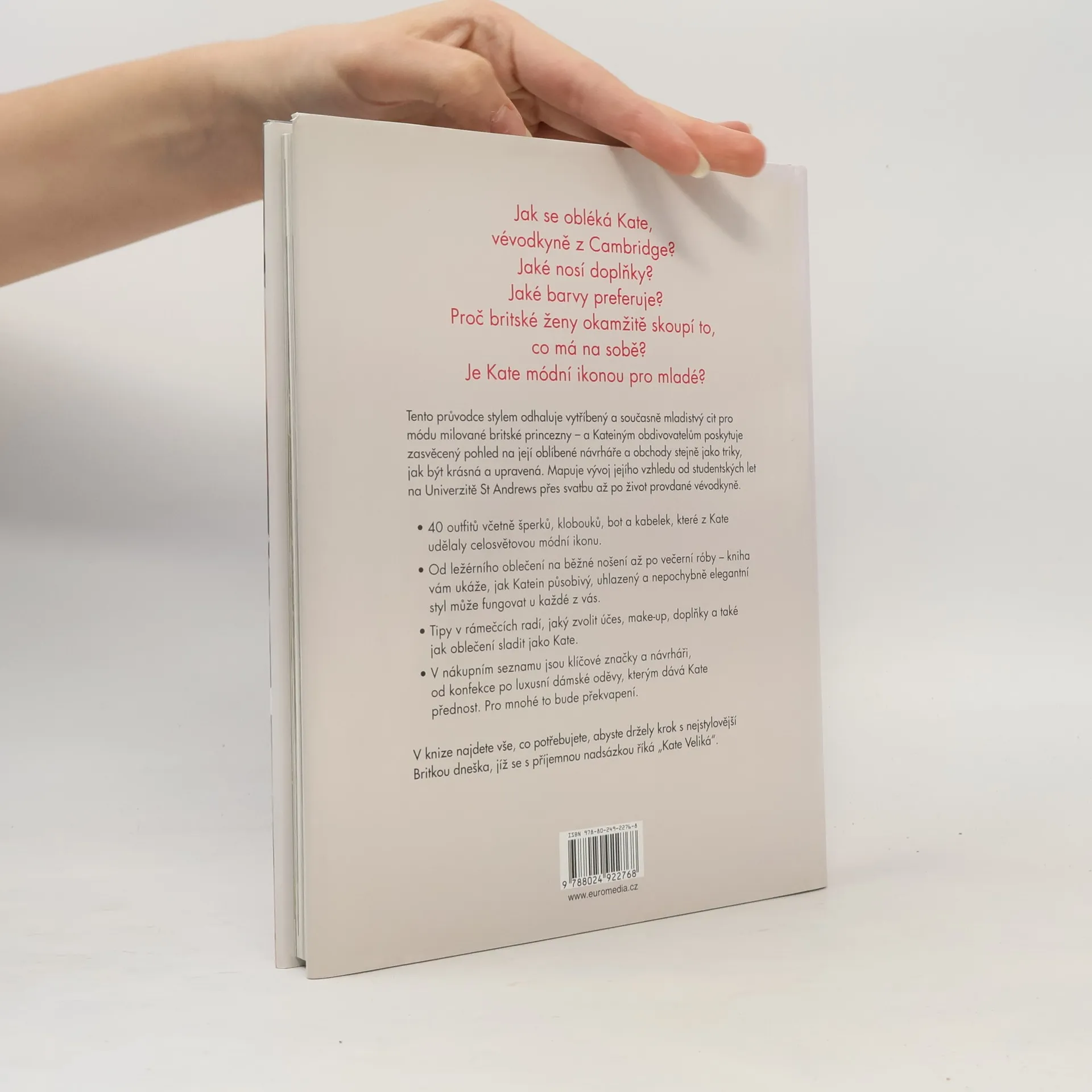 Vévodkyně Kate se stala jednou z největších ikon módy. Průvodce jejím šatníkem, doplňky, účesy a make-upem ukazuje přirozený půvab a eleganci mladé ženy. Seznámíte se detailně se 40 outfity od sportovních oděvů po velké večerní, jak šel čas od studentských dob přes svatbu až po roli královské manželky. Kniha obsahuje praktické tipy pro každý rozpočet. Poradí, jak vybrat sako stejně dokonalé jako Kateino, nebo jak správně nosit tělové lodičky na podpatku. V knize najdete vše, co potřebujete, abyste držely krok s nejstylovější Britkou současnosti.