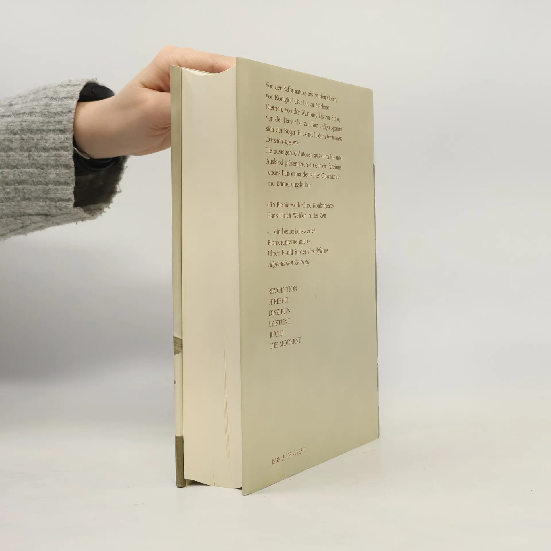 Vergangenheit lebt durch die Erinnerung und stirbt durch das Vergessen. In allen Gesellschaften besteht die Gefahr, Vergangenheit selektiv zu verformen und Erinnerungspolitik zu betreiben. Die Geschichte der Deutschen ist hierfür ein lehrreiches Beispiel, das in vielen Beiträgen des zweiten Bands der Reihe Deutsche Erinnerungsorte behandelt wird. Die Beiträge gruppieren sich um Begriffe wie "Revolution", "Disziplin" oder "Leistung", die typisch deutsche Konnotationen aufweisen. Die "ordnungsgemäße" Abwicklung von Revolutionen ist in der deutschen Geschichte besonders ausgeprägt, mit einer Ausnahme: "Achtundsechzig". Heinz Bude, Soziologie-Professor, entblößt den Mythos dieser Bewegung und ordnet sie in den Kontext sozialer Bewegungen ein. Dennoch bleibt 1968 ein "sicherer Erinnerungsort im Kollektivgedächtnis". Auch die Fußball-Bundesliga spielt eine Rolle in der Mythenbildung und reflektiert die Entwicklung der Gesellschaft. Gunter Gebauer, Sportwissenschaftler, zeigt diese Institution als Spiegel der bundesdeutschen und gesamtdeutschen Gesellschaft. Ute Frevert demonstriert in ihrem Artikel "Pflicht" den Wandel von Begriffen: "Pflicht" war einst hoch dekoriert, wurde aber zwischen 1933 und 1945 pervertiert und 1982 von Oskar Lafontaine als "Sekundärtugend" abgewertet. Kontinuitäten bestehen jedoch, insbesondere in der Wahrnehmung von Wehrpflicht und Steuerpflicht.