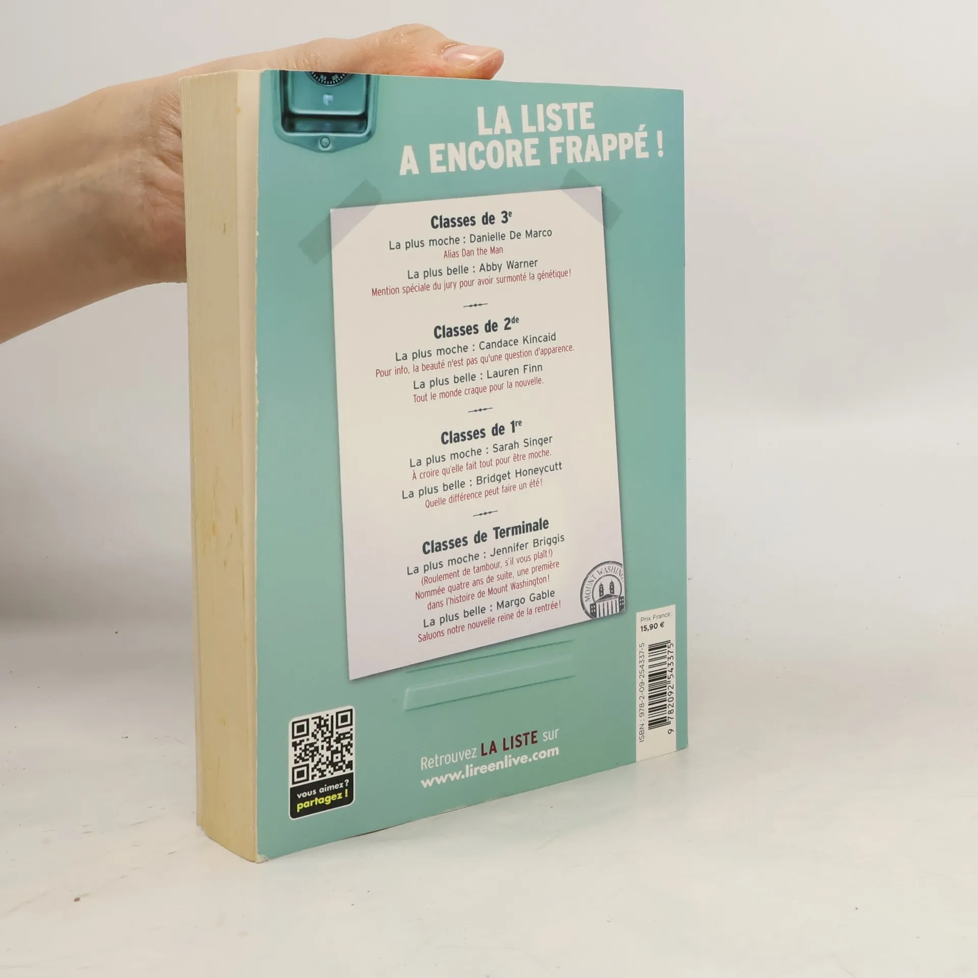 La liste nomme 8 filles chaque année Les 4 plus belles et les 4 plus laides du lycée Et si votre nom s’y trouvait ? Une tradition odieuse sévit au lycée de Mount Washington : tous les ans, une semaine avant le bal de début d’année, une liste est placardée dans les couloirs. Personne ne sait qui établit cette liste. Et personne n’a jamais réussi à empêcher qu’elle soit publiée. Invariablement, chaque année, la plus belle et la plus laide des troisièmes, des secondes, des premières et des terminales sont désignées. 8 filles en tout. 8 filles qui se retrouvent sous les projecteurs impitoyables du lycée. 8 filles qui vont voir leur vie brusquement changer… pour le meilleur ou pour le pire ?