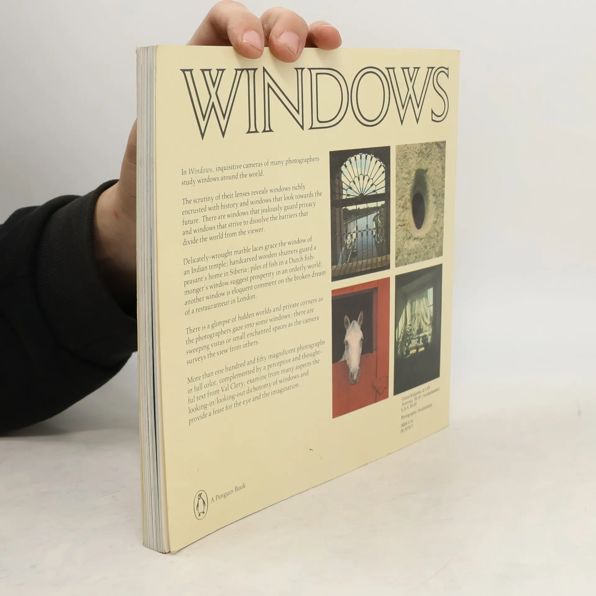 Inquisitive cameras of many photographers study windows around the world. The scrutiny of their lenses reveals windows richly encrusted with history and windows that look toward the future. There are windows that jealously guard privacy and windows that strive to dissolve the barriers that divide the world from the viewer. Delicately-wrought marble laces grace the window of an Indian temple; handcarved wooden shutters guard a peasant's home in Siberia; piles of fish in a Dutch fishmonger's window suggest prosperity in an orderly world. There is a glimpse of hidden worlds and private corners. There are sweeping vistas or small enchanted spaces. More than 150 magnificent photographs in color, complemented by a perceptive and thoughtful text by Val Clery.
