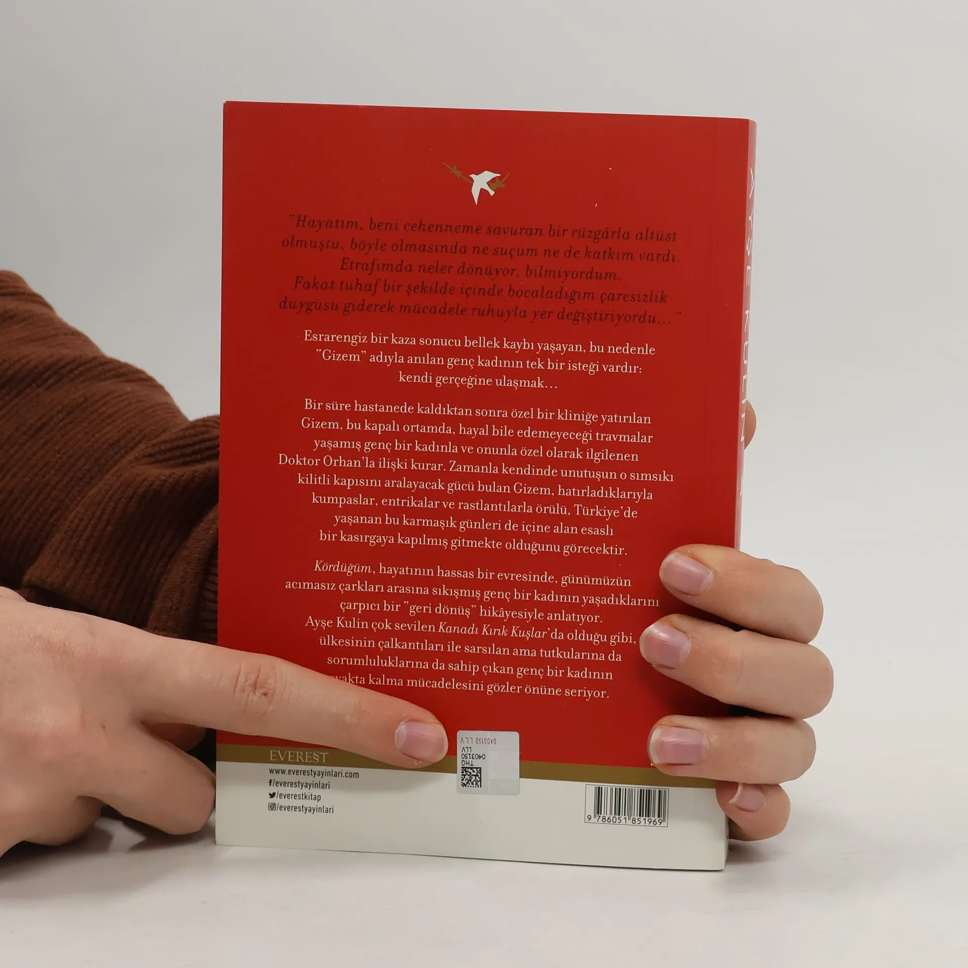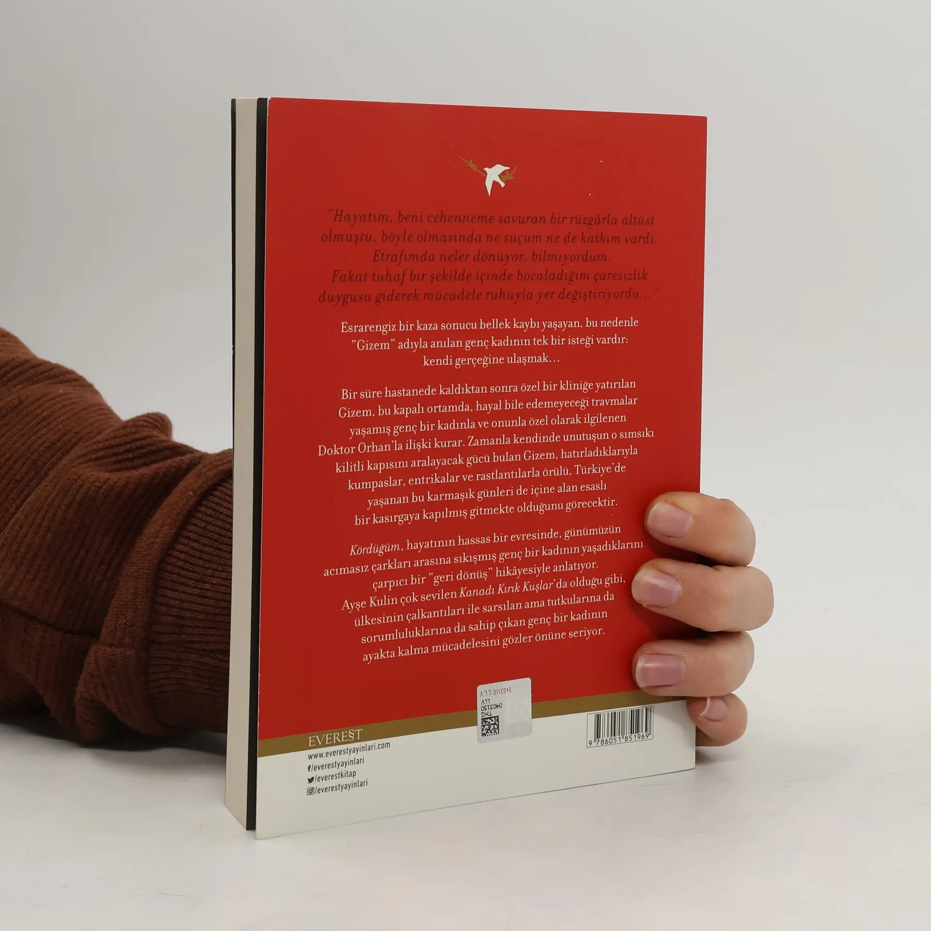 “Hayatım, beni cehenneme savuran bir rüzgârla altüst olmuştu, böyle olmasında ne suçum ne de katkım vardı. Etrafımda neler dönüyor, bilmiyordum. Fakat tuhaf bir şekilde içinde bocaladığım çaresizlik duygusu giderek mücadele ruhuyla yer değiştiriyordu…” Esrarengiz bir kaza sonucu bellek kaybı yaşayan, bu nedenle “Gizem” adıyla anılan genç kadının tek bir isteği vardır: kendi gerçeğine ulaşmak… Bir süre hastanede kaldıktan sonra özel bir kliniğe yatırılan Gizem, bu kapalı ortamda, hayal bile edemeyeceği travmalar yaşamış genç bir kadınla ve onunla özel olarak ilgilenen Doktor Orhan’la ilişki kurar. Zamanla kendinde unutuşun o sımsıkı kilitli kapısını aralayacak gücü bulan Gizem, hatırladıklarıyla kumpaslar, entrikalar ve rastlantılarla örülü, Türkiye’de yaşanan bu karmaşık günleri de içine alan esaslı bir kasırgaya kapılmış gitmekte olduğunu görecektir. Kördüğüm, hayatının hassas bir evresinde, günümüzün acımasız çarkları arasına sıkışmış genç bir kadının yaşadıklarını çarpıcı bir “geri dönüş” hikayesiyle anlatıyor. Ayşe Kulin çok sevilen Kanadı Kırık Kuşlar’da olduğu gibi, ülkesinin çalkantıları ile sarsılan ama tutkularına da sorumluluklarına da sahip çıkan genç bir kadının ayakta kalma mücadelesini gözler önüne seriyor.