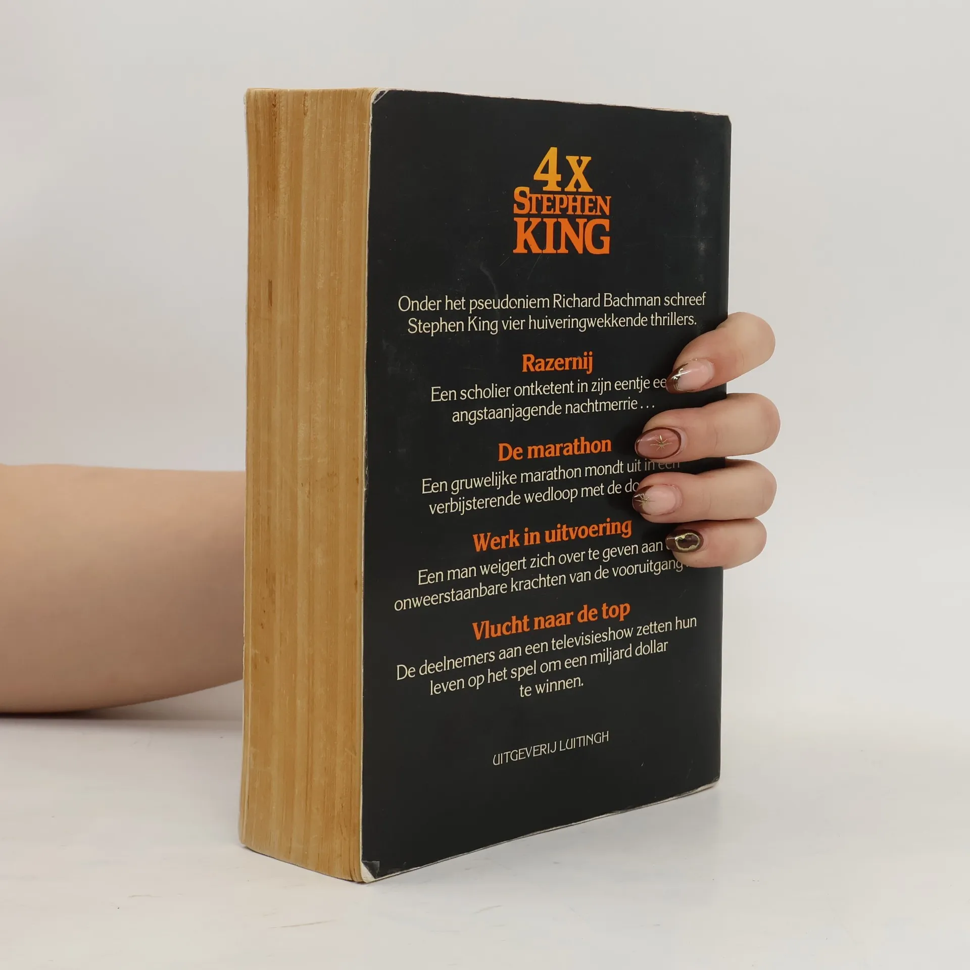 Onder het pseudoniem Richard Bachman schreef Stephen King vier huiveringwekkende thrillers. Razernij: Een scholier ontketent in zijn eentje een angstaanjagende nachtmerrie... De marathon: Een gruwelijke marathon mondt uit in een verbijsterde wedloop met de dood... Werk in uitvoering: Een man weigert zich over te geven aan de onweerstaanbare krachten van de vooruitgang... Vlucht naar de top: De deelnemers aan een televisieshow zetten hun leven op het spel om een miljard dollar te winnen.