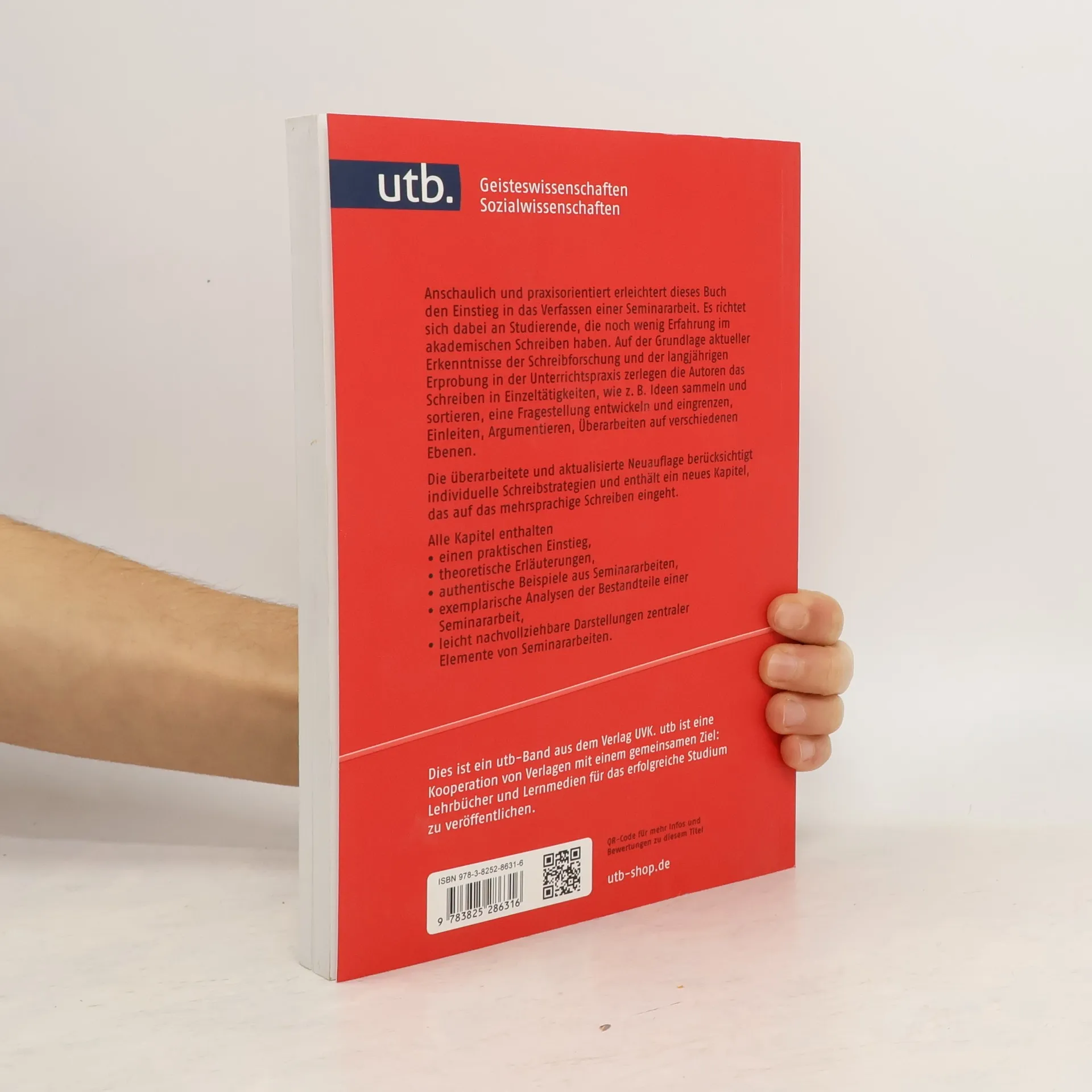 Gegenstand des einführenden Lehrbuchs ist das Erstellen einer Seminararbeit in den Geistes- und Sozialwissenschaften. An den Ergebnissen der Schreibprozessforschung orientiert und auf der Basis langjähriger Unterrichtspraxis wurde ein Konzept entwickelt, bei dem das Schreiben in Einzeltätigkeiten untergliedert wird, wie z. B. Einleiten, Gliedern, Argumentieren, Überarbeiten etc. Alle Kapitel enthalten: o theoretische Erläuterungen, o authentische Beispiele aus Seminararbeiten, o exemplarische Analysen der Bestandteile einer Seminararbeit, o tabellarische Übersichten wichtiger Merkmale des Textaufbaus, o leicht nachzuvollziehende Darstellungen zentraler Elemente von Seminararbeiten.