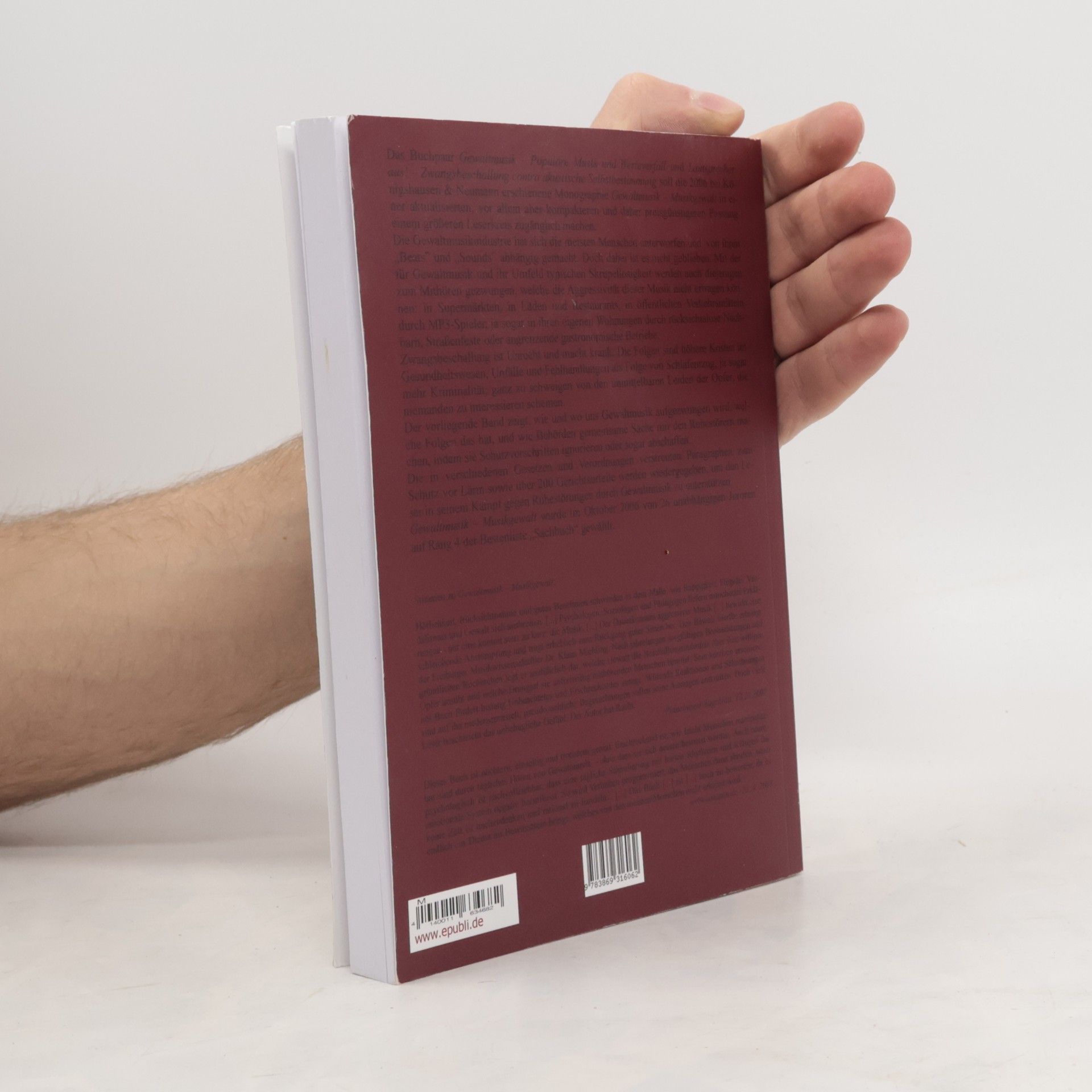 Das Buchpaar "Gewaltmusik – Populäre Musik und Werteverfall" und "Lautsprecher aus! – Zwangsbeschallung contra akustische Selbstbestimmung" bietet eine kompaktere Fassung der Monographie von 2006. Es thematisiert die Auswirkungen von Gewaltmusik und Zwangsbeschallung auf die Gesellschaft und dokumentiert rechtliche Schutzmaßnahmen gegen Lärm.
