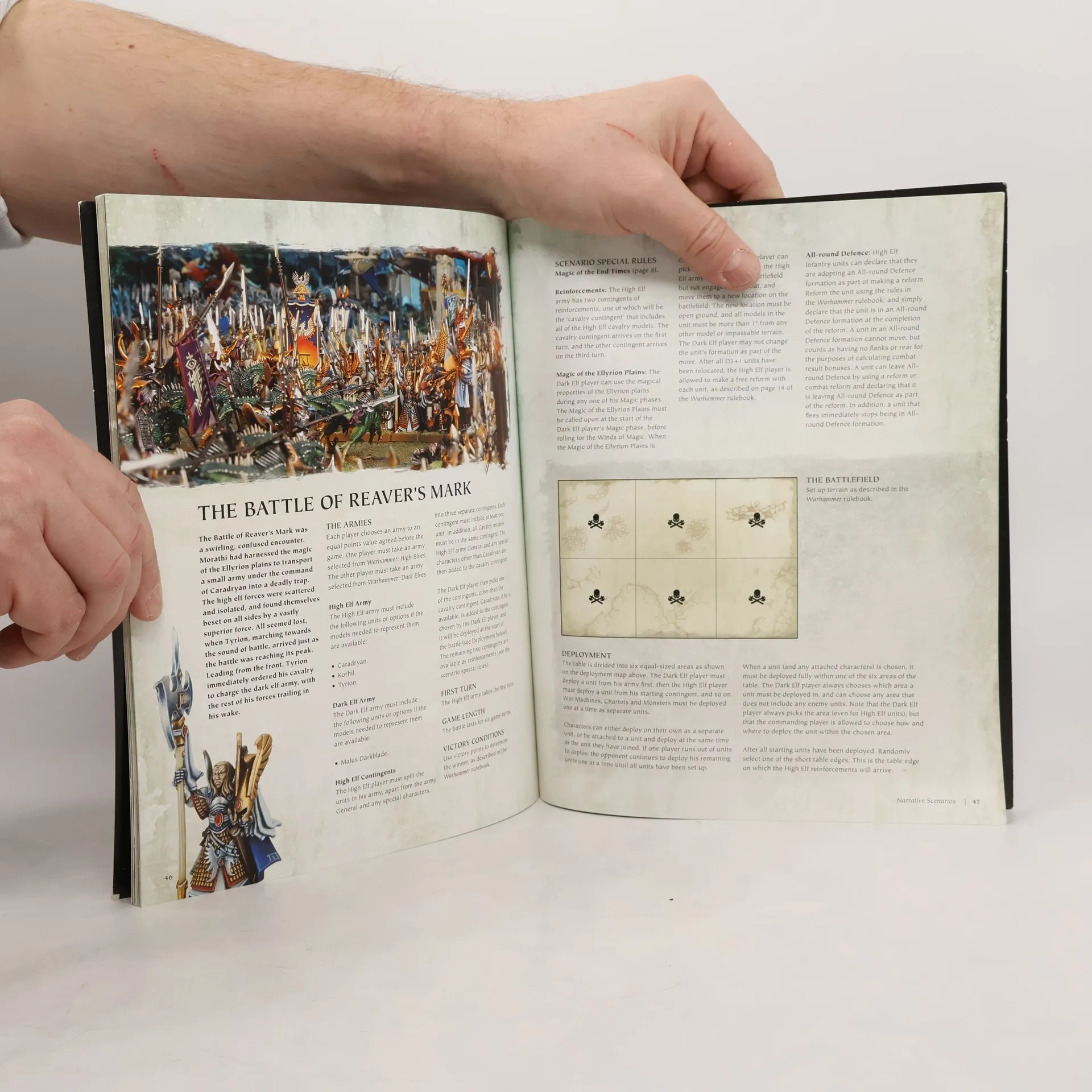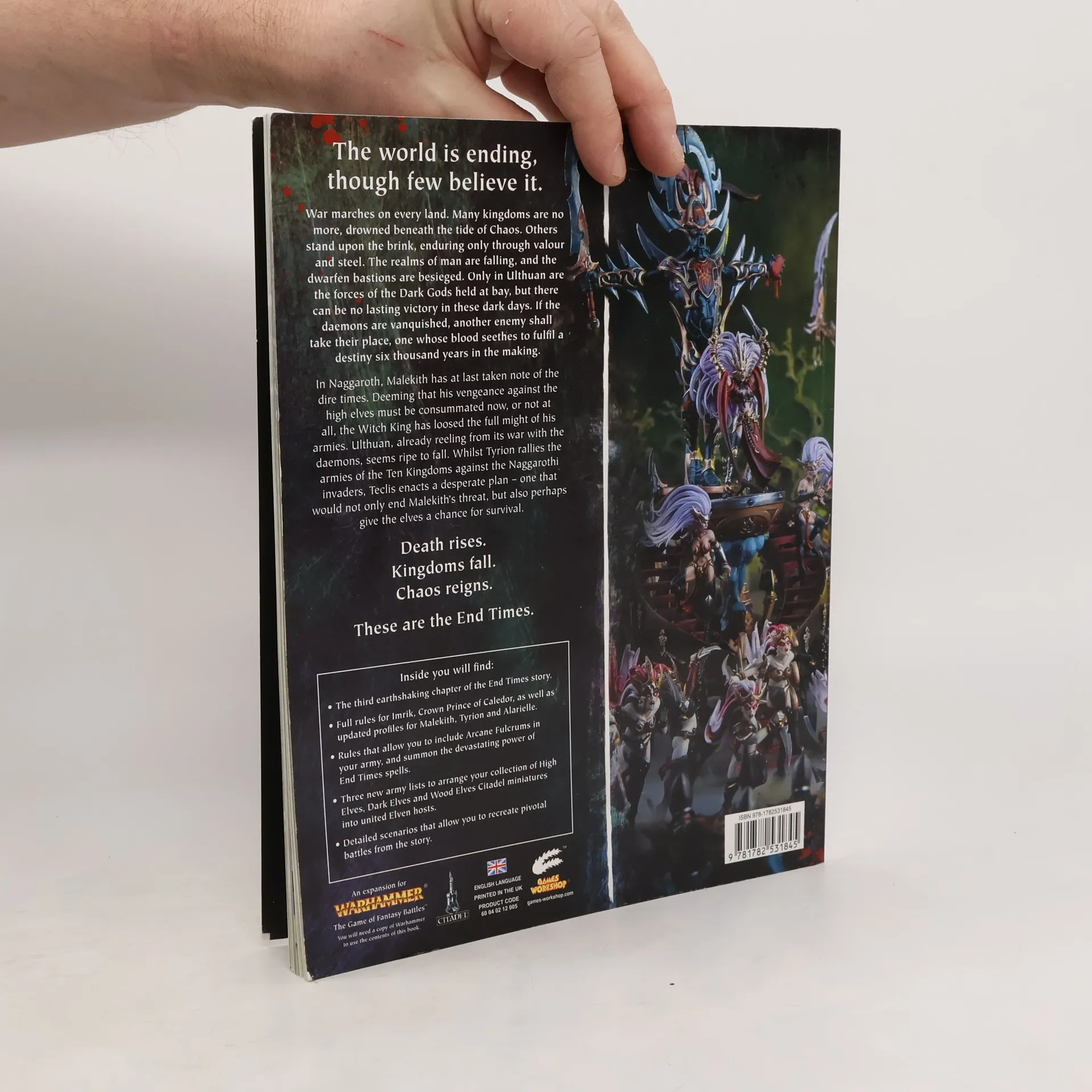 Ulthuan teeters on the brink of ruin as Daemons run rampant across its Ten Kingdoms. Meanwhile, in the grim north of Naggaroth, Malekith the Witch King prepares to face his destiny once and for all. Everything you think you know about the Elves of Warhammer is changing. Warhammer: Khaine continues the epic saga of The End Times. The fate of Ulthuan is described over two softback books. Warhammer: Khaine Book 1 is a 144-page book which details the third chapter of the End Times,the final reckoning between the Elven races. Warhammer: Khaine Book 2 is a 48-page rules book that contains six new scenarios and orders of battle based on the events in Warhammer: Khaine Book 1. It includes Magic of the End Times, a new spell lore available to all armies, and new army lists, allowing customers to field a unified Elven army drawn from Wood Elves, High Elves and Dark Elves to match different parts of the narrative. It also includes newly updated special character rules for Malekith the Eternity King; Tyrion Avatar of Khaine; Imrik Crown Prince of Caledor; and Alarielle Incarnate of Life.