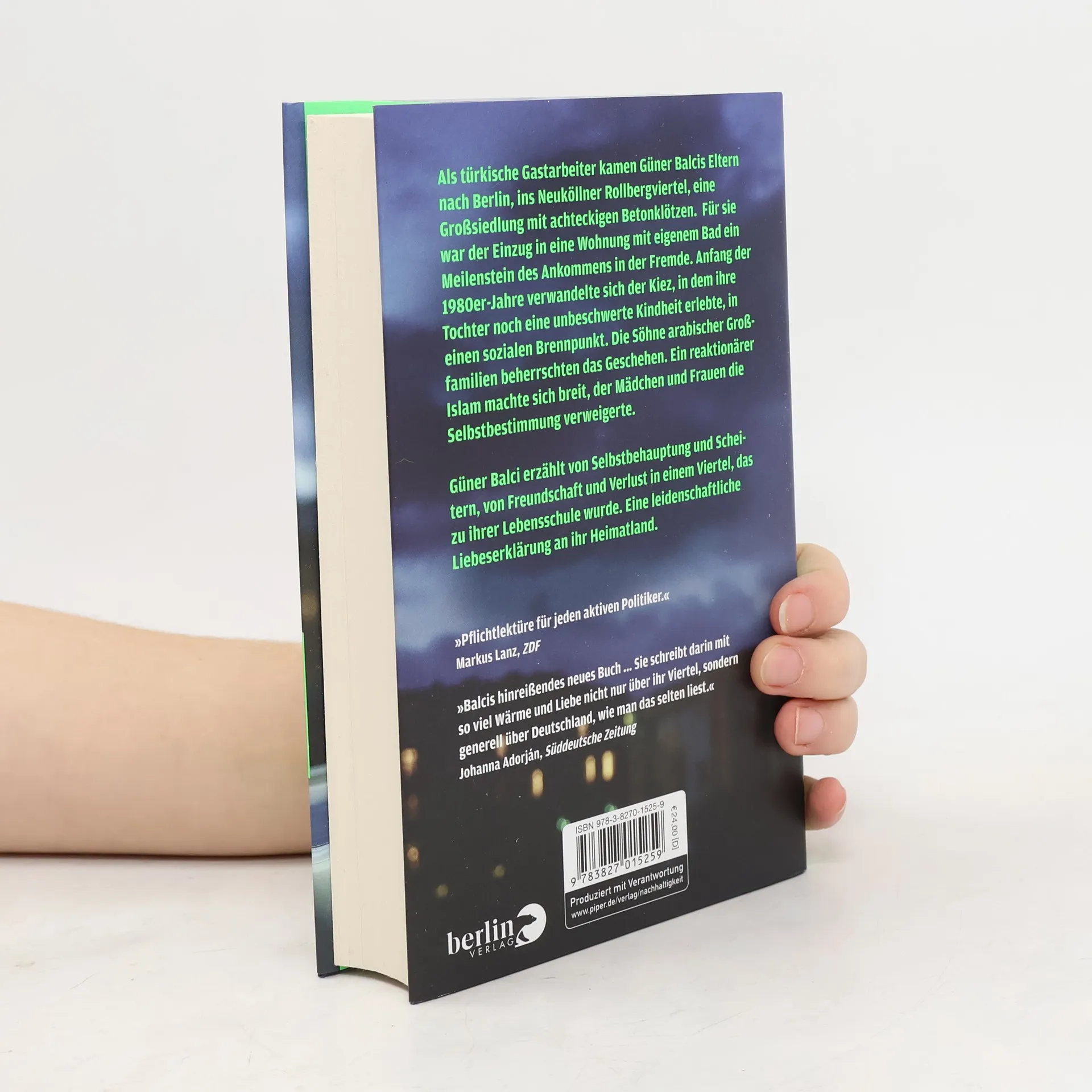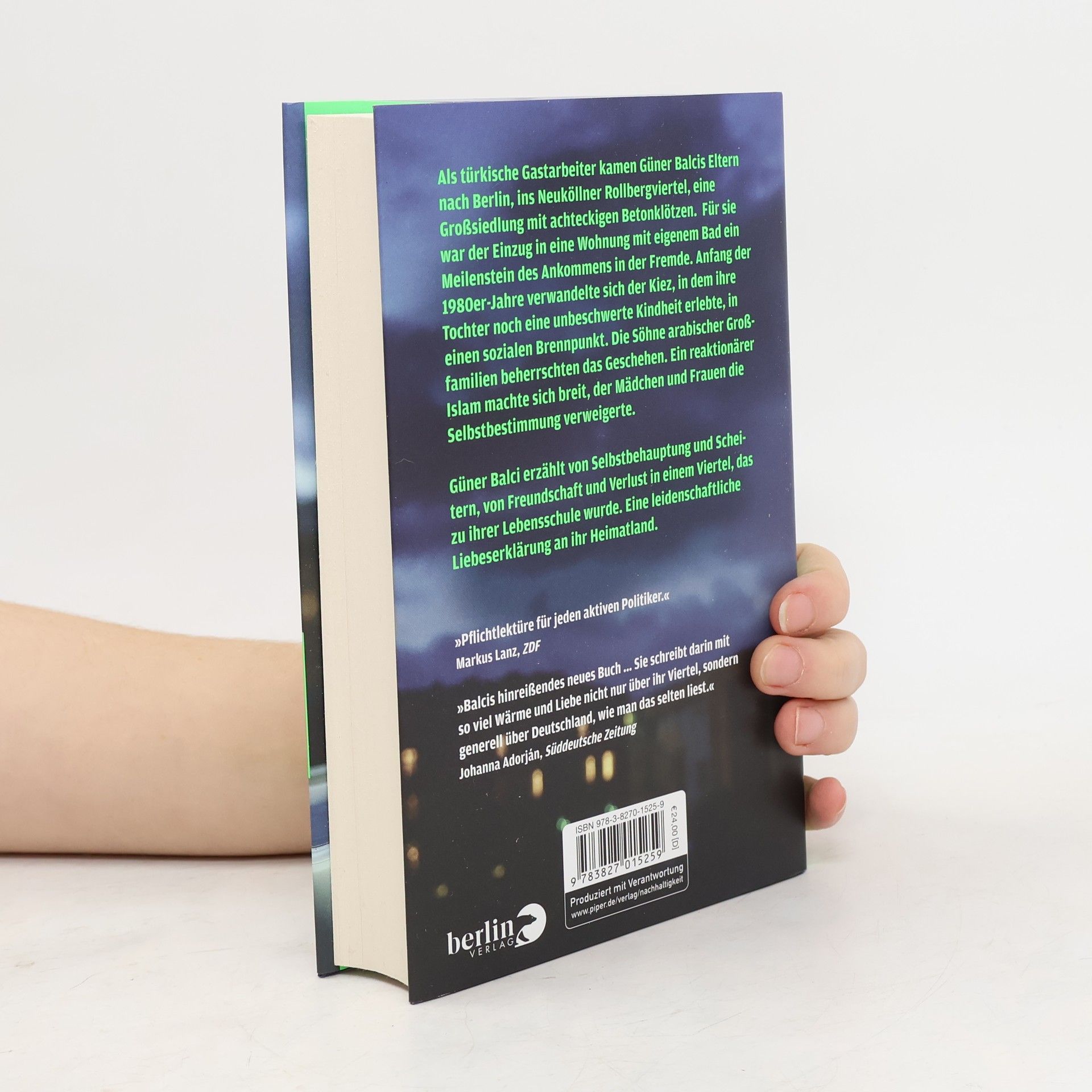 Als türkische Gastarbeiter kamen Güner Balcis Eltern nach Berlin-Neukölln. Der Einzug in eine Wohnung mit eigenem Bad im Rollbergviertel war für sie ein Meilenstein des Ankommens in einer ihnen fremden Welt. Aber das einstige Arbeiterviertel, in dem ihre Tochter eine unbeschwerte Kindheit erlebte, verwandelte sich Anfang der 1980er-Jahre zunehmend in einen sozialen Brennpunkt. Die Söhne arabischer Großfamilien beherrschten das Geschehen. Ein reaktionärer Islam machte sich breit, der Mädchen und Frauen die Selbstbestimmung verweigerte. Güner Balci erzählt von Selbstbehauptung und Scheitern, von Freundschaft und Verlust in einem Viertel, das zu ihrer Lebensschule wurde. Eine leidenschaftliche Liebeserklärung an ihr Heimatland.