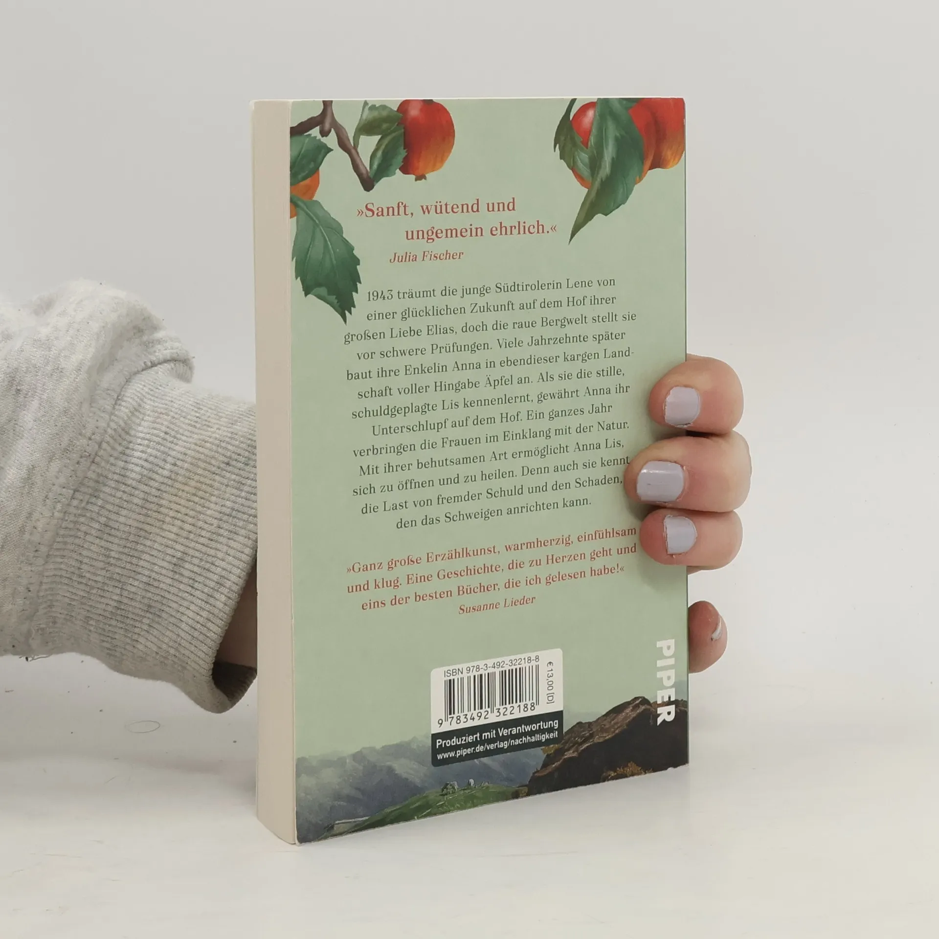 »Nicole Wellemins Texte sind so klar wie ein Bergsee und so präzise wie ein Scherenschnitt.« Martina Bogdahn. Wer sind wir, wenn uns alles genommen wird? Im Jahr 1943 träumt die junge Südtirolerin Lene von einer glücklichen Zukunft mit Elias. Doch das Schicksal, das in der rauen Bergwelt auf sie wartet, ist hart. Jahrzehnte später kultiviert ihre Enkelin Anna in dieser kargen Landschaft alte Apfelsorten. Als sie Lis trifft, die eine schwere Schuld trägt, gewährt Anna ihr Unterschlupf. Ein Jahr verbringen die Frauen im Einklang mit der Natur, wobei Anna Lis behutsam hilft, sich zu öffnen und zu heilen. Auch sie kennt die Last von fremder Schuld und die Schäden, die Schweigen anrichten kann. Der Roman thematisiert die heilende Kraft der Natur und die Befreiung von vererbter Schuld. Die Autorin beschreibt, was sie zu diesem besonderen Werk inspiriert hat: Ein Südtiroler, der auf über 1.000 Höhenmetern sortenreine Apfelsäfte keltert, faszinierte sie. Die Landschaft, die sie aus ihrer Kindheit kennt, wirkte auf sie wie eine Grenze zwischen Hier und Dort. So entstand eine Geschichte über unausgesprochene Dinge, die Menschen entzweien können, über besondere Äpfel und die Schuld, die jede Generation weitergibt.