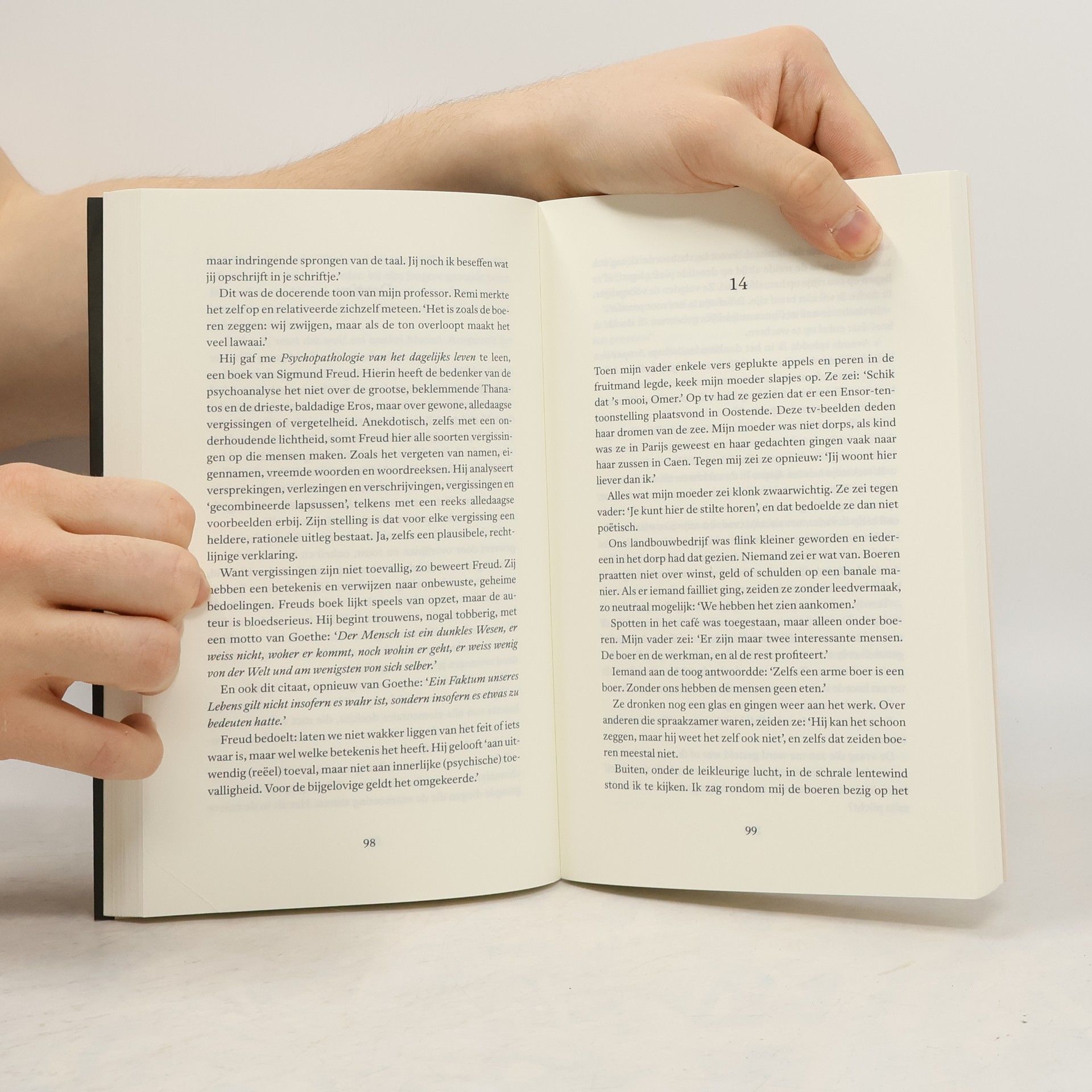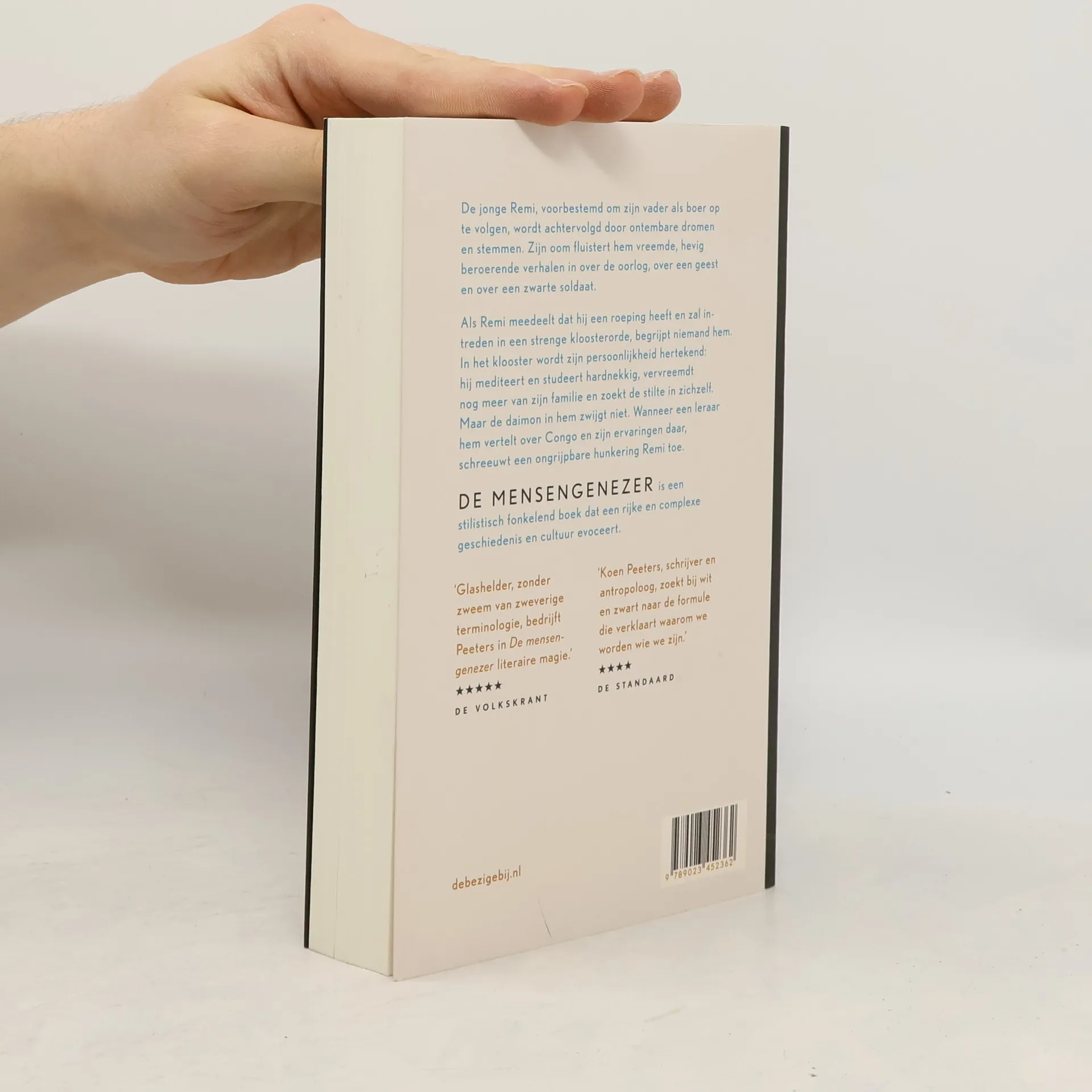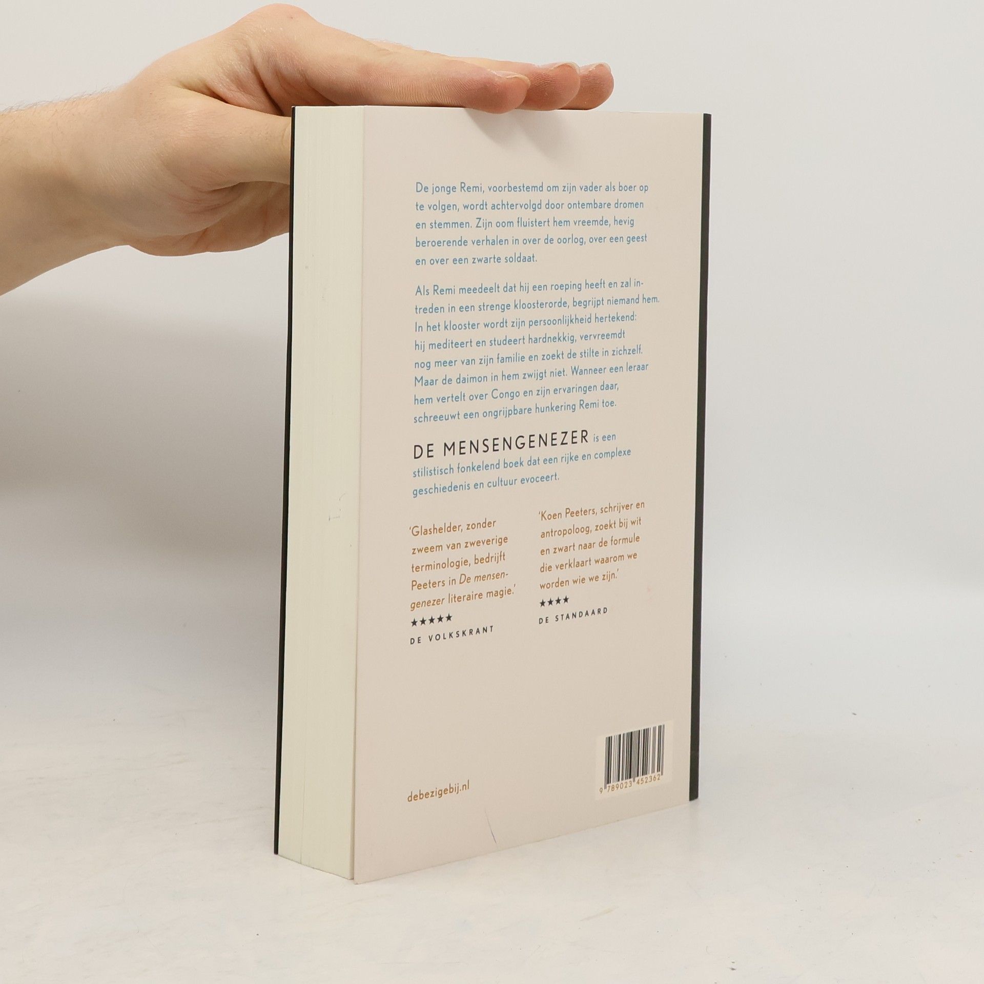 Een verdwijnend boerenbestaan, een koloniaal en schuldbeladen verleden en in het menselijk hart een rusteloos verlangen naar het onbekende De jonge Remi, voorbestemd om zijn vader als boer op te volgen, wordt achtervolgd door ontembare dromen en stemmen. Zijn oom fluistert hem vreemde, hevig beroerende verhalen in over de oorlog, over een geest en over een zwarte soldaat. Als Remi meedeelt dat hij een roeping heeft en zal intreden in een strenge kloosterorde, begrijpt niemand hem. In het klooster wordt zijn persoonlijkheid hertekend: hij mediteert en studeert hardnekkig, vervreemdt nog meer van zijn familie en zoekt de stilte in zichzelf. Maar de daimon in hem zwijgt niet. Wanneer een leraar hem vertelt over Congo en zijn ervaringen daar, schreeuwt een ongrijpbare hunkering Remi toe. De mensengenezer is een stilistisch fonkelend boek dat een rijke en complexe geschiedenis en cultuur evoceert. Als de braambessen rijp waren zaten die vol zwart bloed, geloofde ik. Alleen al door die zwarte gedachte durfde ik geen braambessen meer te eten. Als het hard waaide over de velden, altijd vanuit het westen, dan dacht ik ook aan de geest.