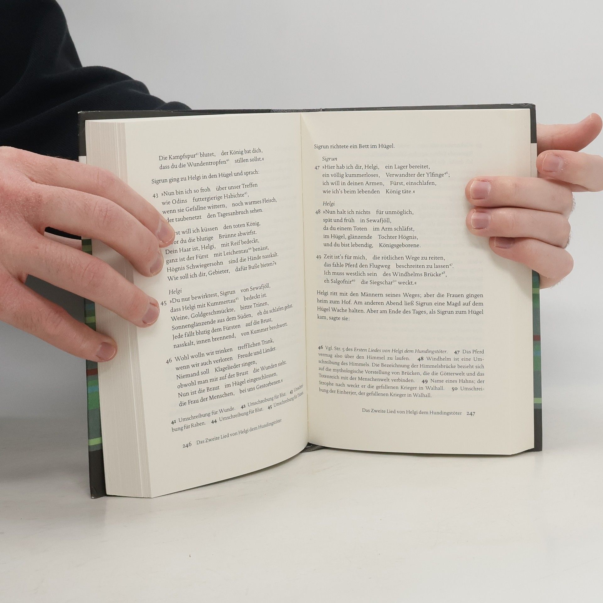 Eine unscheinbare Handschrift aus Island, die von 1662 bis 1971 in der Königlichen Bibliothek Kopenhagen aufbewahrt wurde und deshalb den schon etwas weniger unscheinbaren Namen »Codex Regius« trägt – heute ist sie in ihrer Heimat Island zurück –, enthält die spektakulären und weltberühmten Gedichte und Lieder, die von den altnordischen Göttern und Helden erzählen. Neben Nachrichten über die germanische Götterwelt erhielten sich in ihnen vor allem auch die nordischen Versionen der Nibelungen- und Dietrichsagen, die dank ihrer Popularisierung seit der Romantik tief in die Kulturgeschichte gewirkt haben. Während alte Nachdichtungen eines Karl Simrock oder Felix Genzmer bemüht waren, mittels Nachahmung des eddischen Versmaßes eine archaische Aura zu erzeugen, erzielt Arnulf Krauses ausführlich kommentierte Prosaübersetzung hohe Genauigkeit besonders im Umgang mit der ausgefeilten altisländischen Dichtungstechnik des Umschreibens, der Metaphern- und Synonymfindung.