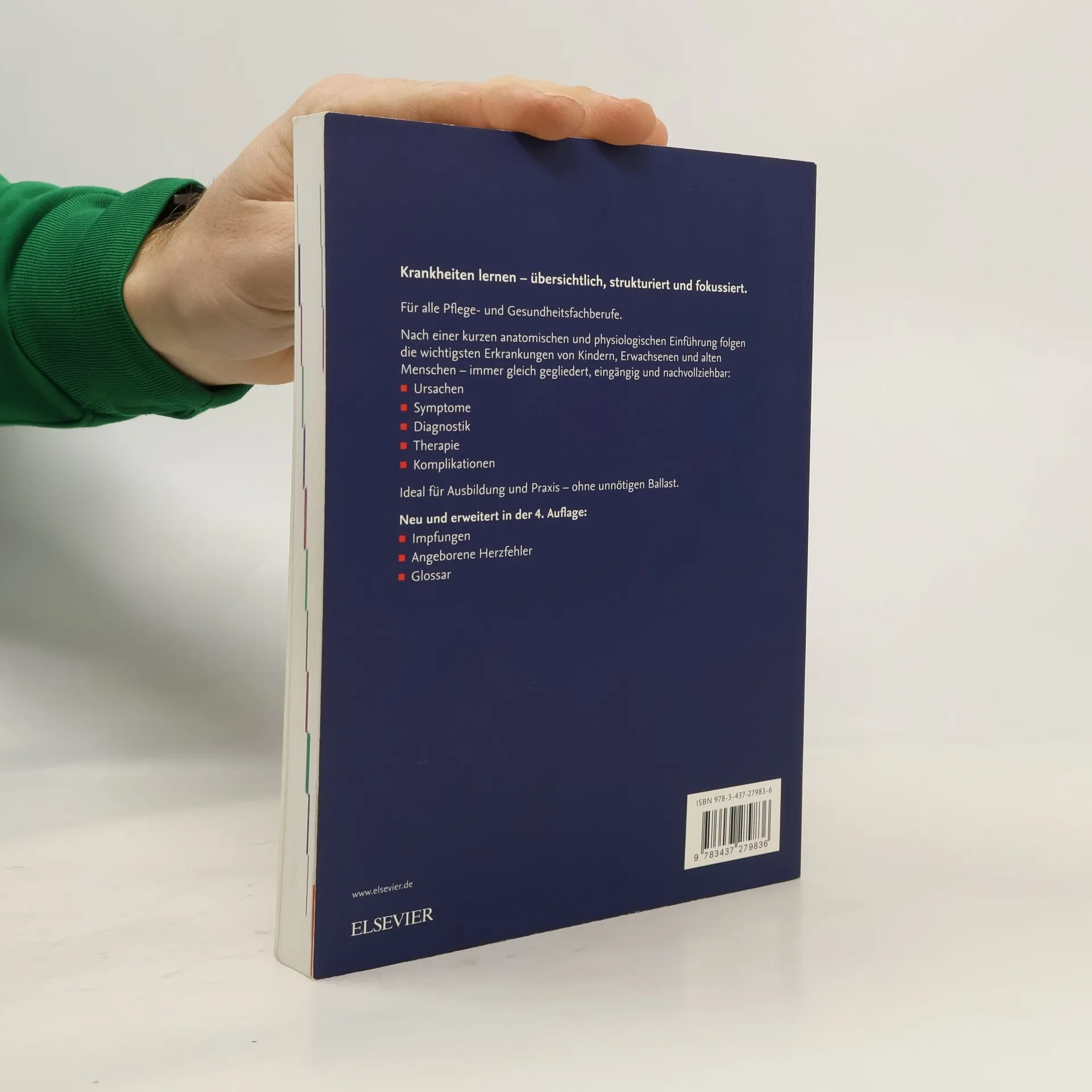 So lernen und verstehen Sie Krankheiten in ihrem gesamten Erscheinungsbild. Ideal für Ausbildung und Praxis. Kompaktes Wissen aus Gesundheits- und Krankheitslehre! Die Weltgesundheitsorganisation (WHO) definiert Gesundheit als den „Zustand völligen körperlichen, seelischen und sozialen Wohlbefindens„. Krankheit ist demnach jeder Zustand, der diesem Begriff nicht entspricht. In „Gesundheits- und Krankheitslehre“ erfahren Sie alles Wichtige zu möglichen körperlichen und psychischen Erkrankungen des Menschen. Dem Prinzip "vom Gesunden zum Kranken'' folgend, ist jedem Kapitel eine übersichtliche Einführung in die Anatomie und Physiologie und den Vorgängen im gesunden menschlichen Körper, vorangestellt. Im Anschluss werden für die wichtigsten Erkrankungen pflegerische Maßnahmen kurz und präzise dargestellt, und zwar in Bezug auf Ursache, Symptome, Diagnostik und Therapie. Das erwartet Sie in „Gesundheits- und Krankheitslehre: für Pflege- und Gesundheitsfachberufe": Einführung in die Allgemeine Krankheitslehre Ursache, Symptome, Diagnostik, Therapie mögliche Komplikationen und Rehabilitation zu jedem Krankheitsbild Viele erklärende und übersichtliche Tabellen und Grafiken Neu in der 4. Auflage: noch attraktiveres Layout, erstmals vierfarbig Abkürzungsverzeichnis und Glossar Impfungen