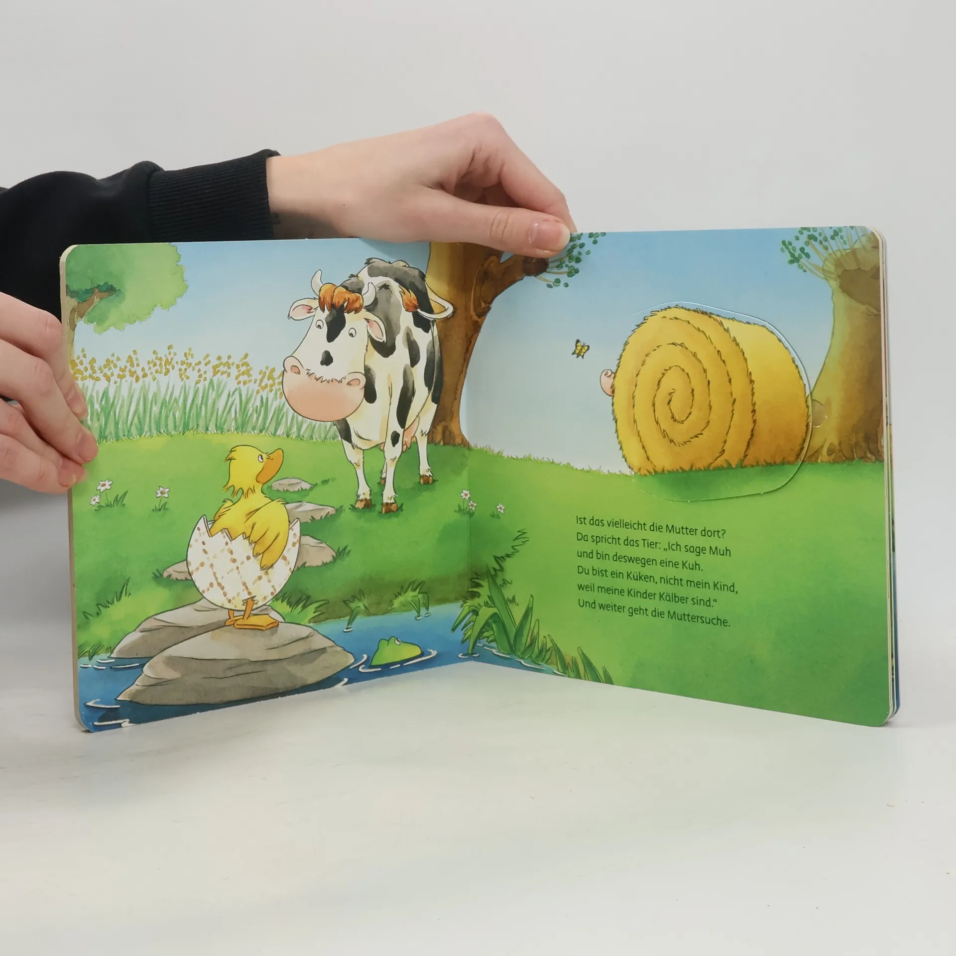 Das Entenkind ist gerade aus dem Ei geschlüpft. Weil es seine Mama nicht sofort finden kann, macht sich die kleine Ente auf die Suche und trifft dabei viele Bauernhoftiere: das Pferd, die Kuh, und das Schwein. Doch wo steckt nur die Entenmama?
