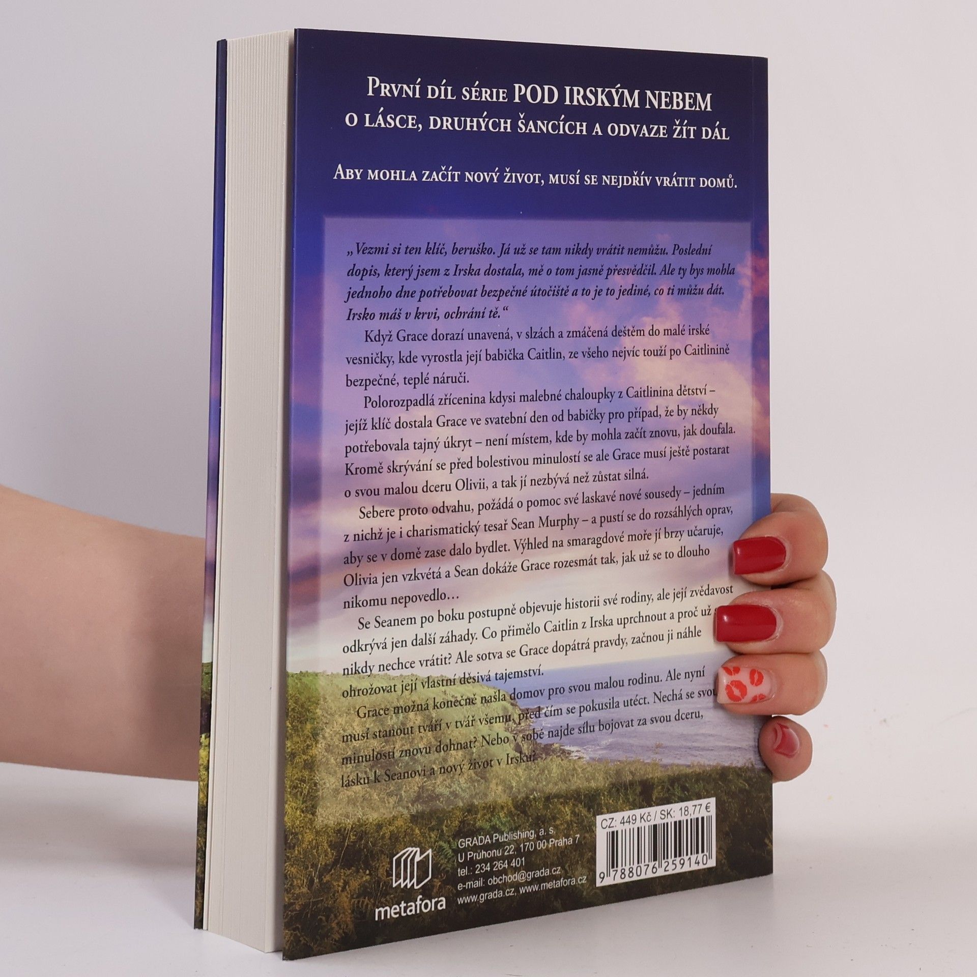 Když Grace dorazí unavená, v slzách a zmáčená deštěm do malé irské vesničky, kde vyrostla její babička Caitlin, ze všeho nejvíc touží po Caitlinině bezpečné, teplé náruči. Polorozpadlá zřícenina kdysi malebné chaloupky z Caitlinina dětství – jejíž klíč dostala Grace ve svatební den od babičky pro případ, že by někdy potřebovala tajný úkryt – není místem, kde by mohla začít znovu, jak doufala. Kromě skrývání se před bolestivou minulostí se ale Grace musí ještě postarat o svou malou dceru Olivii, a tak jí nezbývá než zůstat silná. Sebere proto odvahu, požádá o pomoc své laskavé nové sousedy – jedním z nichž je i charismatický tesař Sean Murphy – a pustí se do rozsáhlých oprav, aby se v domě zase dalo bydlet. Výhled na smaragdové moře jí brzy učaruje, Olivia jen vzkvétá a Sean dokáže Grace rozesmát tak, jak už se to dlouho nikomu nepovedlo… Se Seanem po boku postupně objevuje historii své rodiny, ale její zvědavost odkrývá jen další záhady. Co přimělo Caitlin z Irska uprchnout a proč už se nikdy nechce vrátit? Ale sotva se Grace dopátrá pravdy, začnou ji náhle ohrožovat její vlastní děsivá tajemství. Grace možná konečně našla domov pro svou malou rodinu. Ale nyní musí stanout tváří v tvář všemu, před čím se pokusila utéct. Nechá se svou minulostí znovu dohnat? Nebo v sobě najde sílu bojovat za svou dceru, lásku k Seanovi a nový život v Irsku?