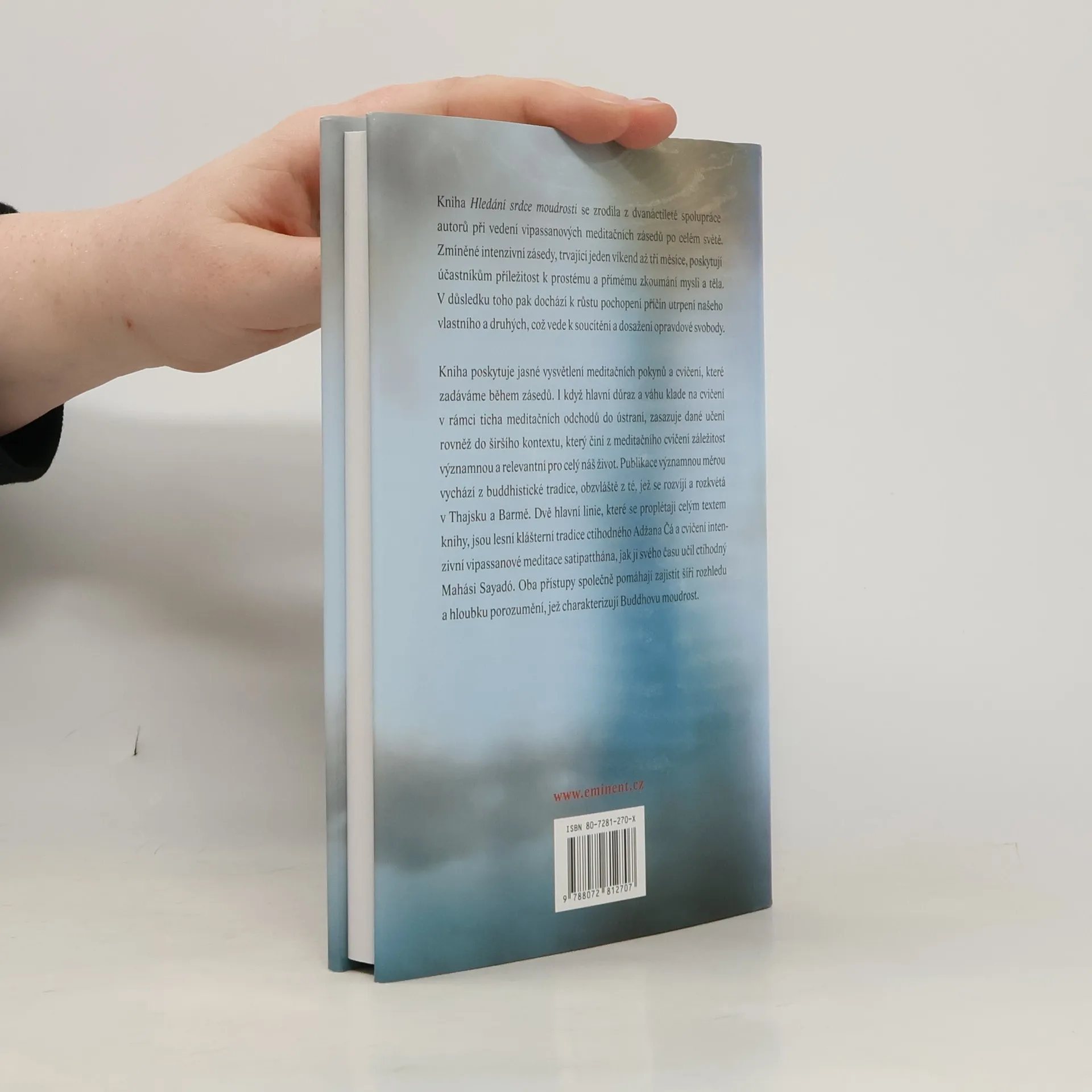 Kniha Hledání srdce moudrosti se zrodila z dvanáctileté spolupráce autorů při vedení vipassanových meditačních zásedů po celém světě. Zmíněné intenzivní zásedy, trvající jeden víkend až tři měsíce, poskytují účastníkům příležitost k prostému a přímému zkoumání mysli a těla. V bezprostředním důsledku přitom dochází k hlubšímu pochopení příčin utrpení našeho vlastního i utrpení druhých, k účinnému soucítění a dosažení opravdové svobody. Kniha poskytuje jasné vysvětlení meditačních pokynů a cvičení, které získávají adepti během zásedů. Hlavní důraz a váhu klade na cvičení v rámci ticha a význam meditačních odchodů do ústraní; celé učení ovšem zasazuje do širšího kontextu, který zásadně mění klasické meditační cvičení na významnou příležitost, provázející celý život. Kniha vychází především z buddhistické tradice v Thajsku a Barmě. Dvě hlavní linie, které se proplétají celým textem, jsou lesní klášterní tradice ctihodného Adžána Čá a cvičení intenzivní vipassanové meditace satipatthána, jak ji svého času učil ctihodný Mahási Sayadó. Oba přístupy společně pomáhají zajistit šíři rozhledu a hloubku porozumění, jež charakterizují moudrost Probuzeného Gauthamy Buddhy.