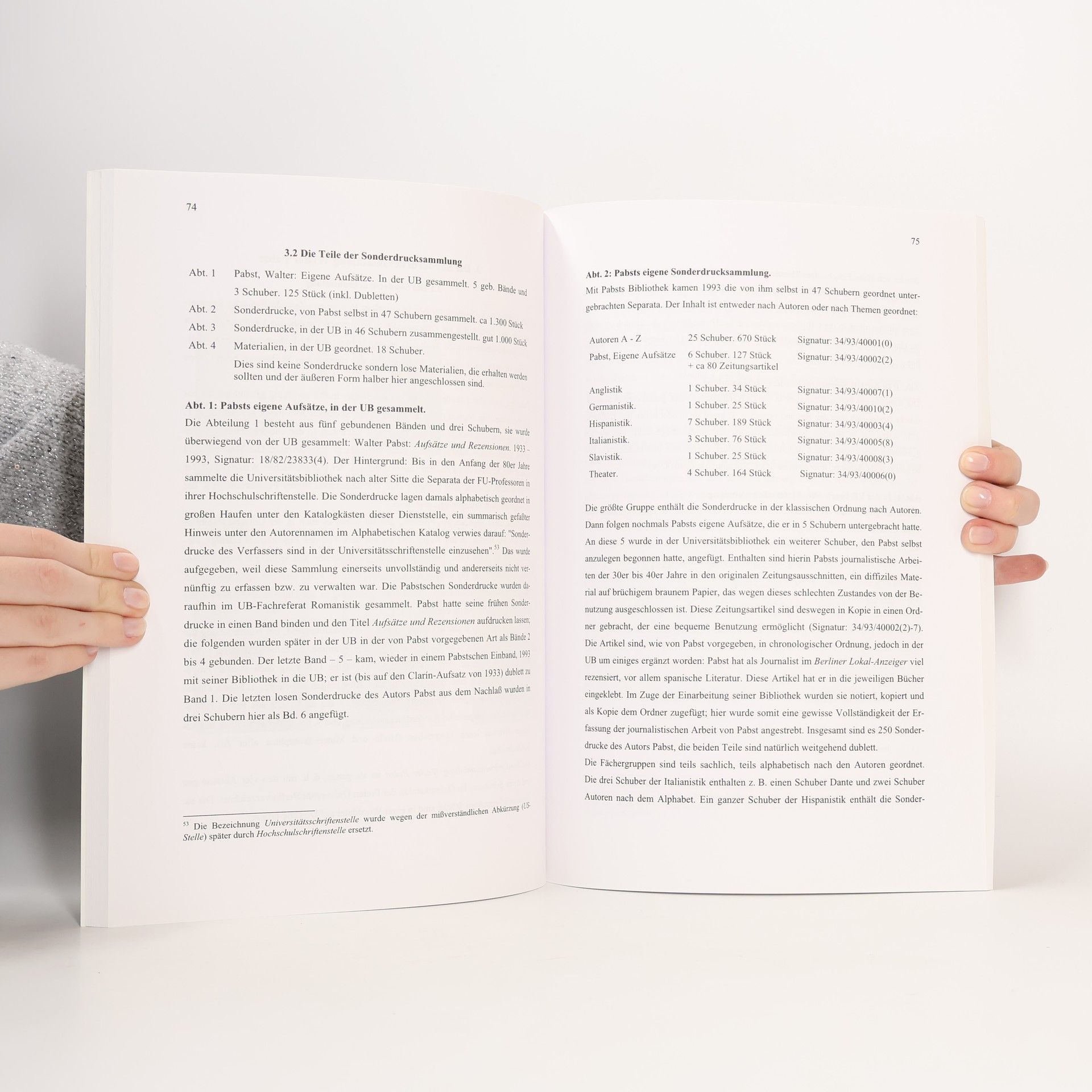 Ausstellungskatalog zur Sammlung Walter Pabst in der Universitätsbibliothek der Freien Universität Berlin. Neben Beiträgen von Titus Heydenreich, Ludwig Schrader und Klaus W. Hempfer zur Persönlichkeit Walter Pabsts wird von Doris Fouquet-Plümacher die Bibliothek von Walter Pabst beschrieben, die er 1993 der Universitätsbibliothek überließ. Ein umfangreicher Anhang stellt Quellen zu spanischen Autoren der frühen 30er Jahre vor und vor allem Dokumente der Studentenrevolte am Romanischen Seminar der FU Berlin vor, in die Walter Pabst hineingezogen wurde.