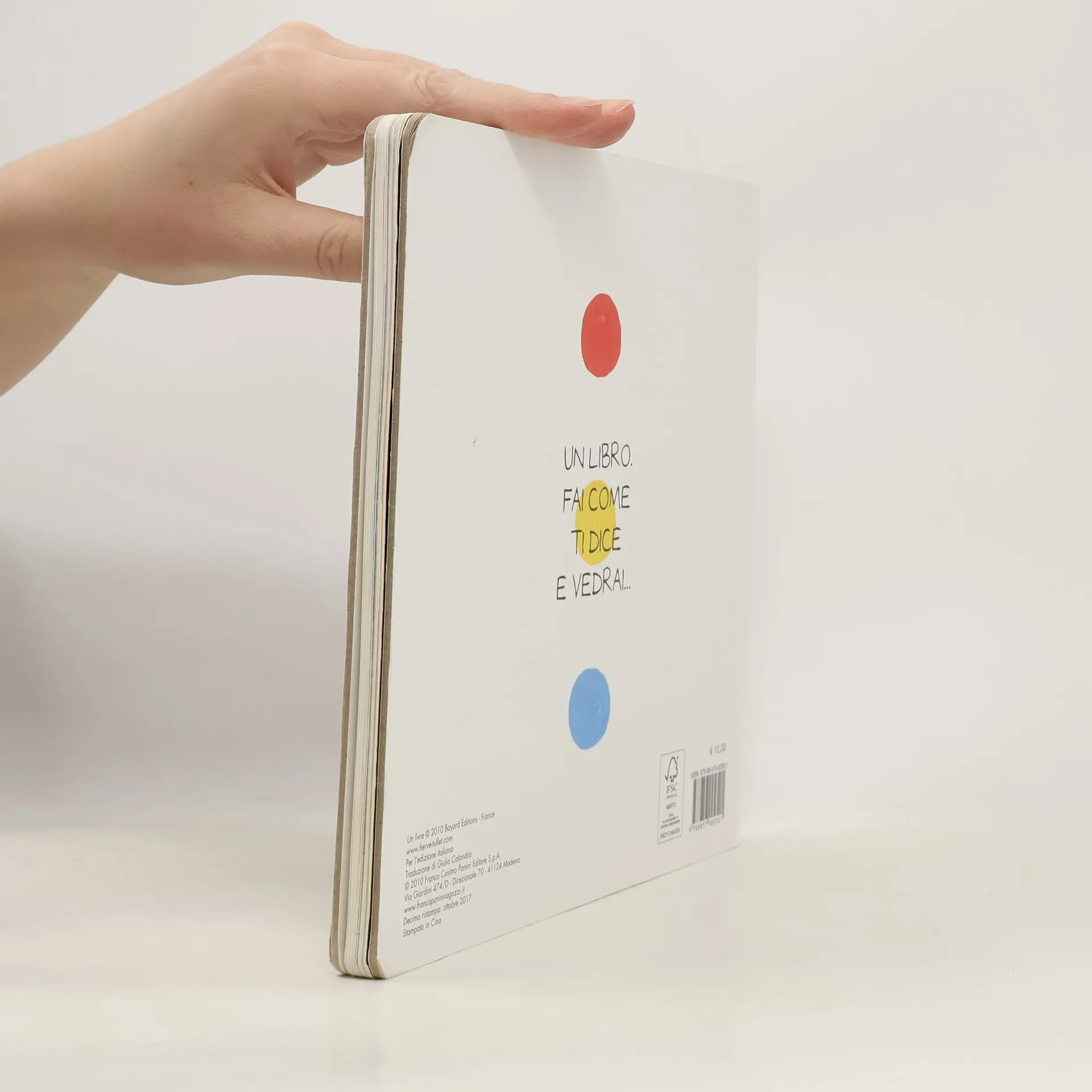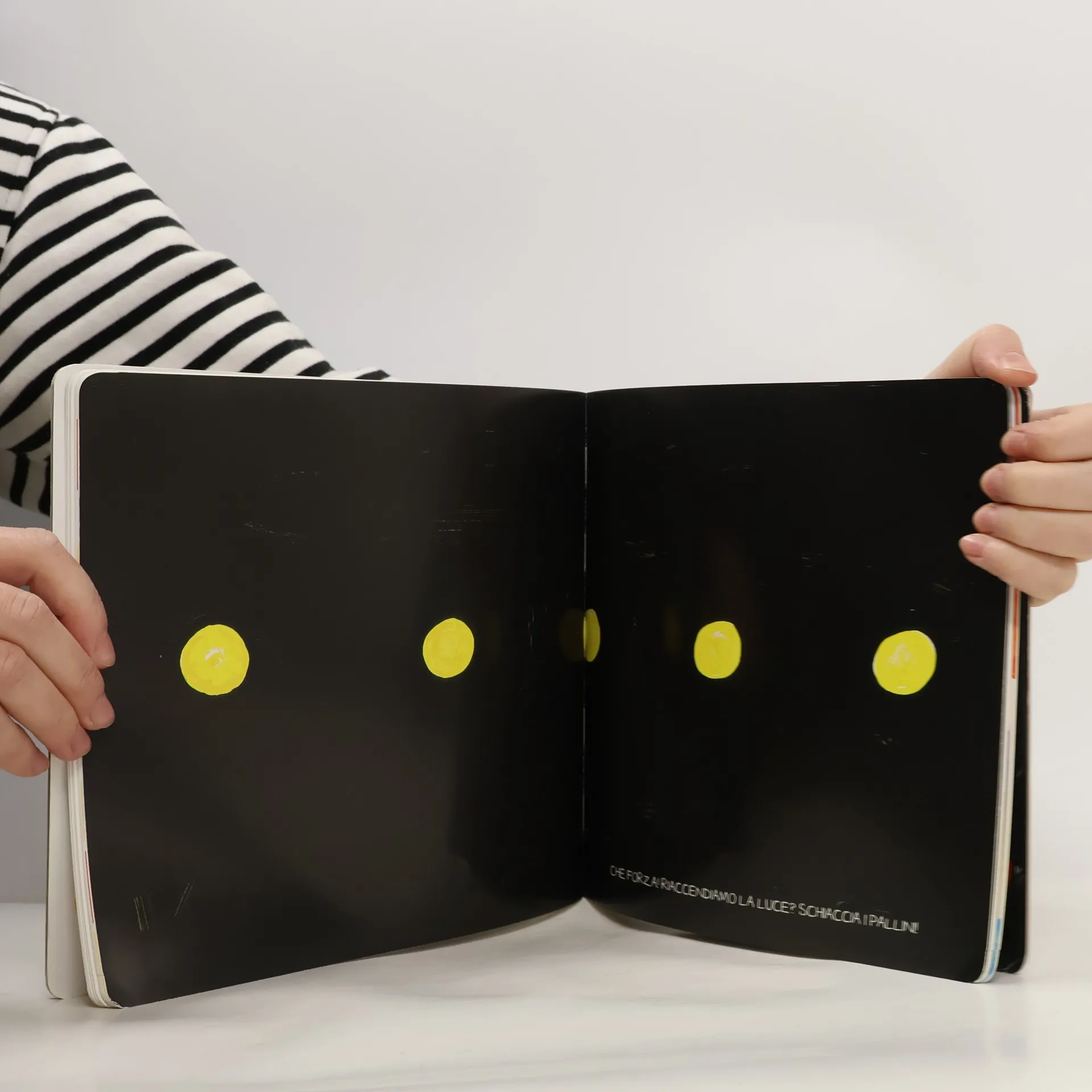 Un libro di Hervé Tullet è geniale, semplice, coinvolgente. Da una pallina gialla nella prima pagina nasce un gioco, il libro dice cosa fare al lettore e si sviluppa così un'interazione divertente tra il libro e il bambino che vede le pagine modificarsi in base ai movimenti che fa. Un libro d’artista bello e ingegnoso che fa giocare genitori e figli.