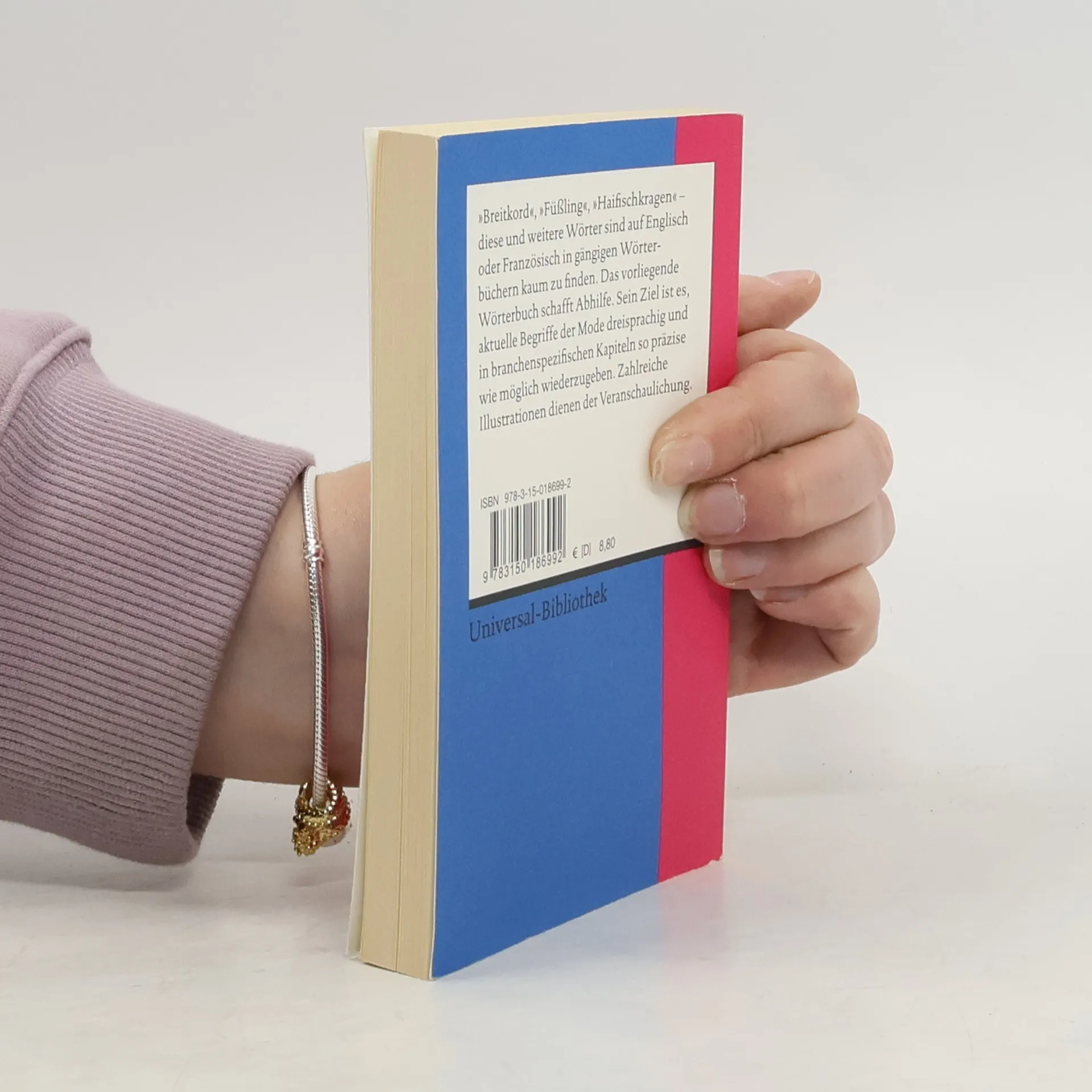 Es gibt viele Details unserer Kleidung, die wir schon in unserer Muttersprache nur schwer benennen können - geschweige denn in einer anderen. 'Breitkord', 'Füßling', 'Haifischkragen' - diese und weitere Wörter sind auf Englisch oder Französisch in gängigen Wörterbüchern kaum zu finden. Dafür aber in diesem, das ca. 2200 aktuelle Begriffe der Mode dreisprachig und in branchenspezifischen Kapiteln so präzise wie möglich wiedergibt, um dem Benutzer eine Hilfe bei der täglichen Arbeit zu bieten. Zahlreiche Illustrationen dienen der Veranschaulichung.