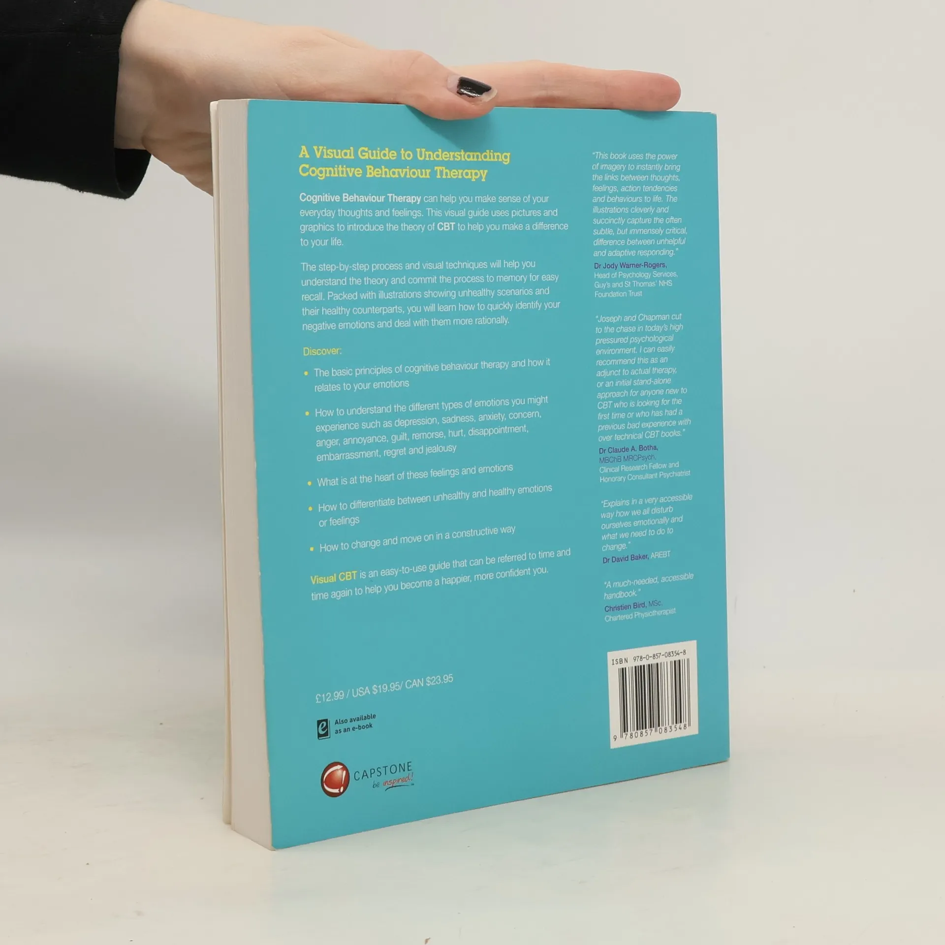 Many people learn best by following a visual approach – retaining information far more successfully if that information is given to them in a visual manner. Visual CBT uses illustrations, graphics and images to help the reader to alter their thought patterns and change behaviours through CBT to become a happier, healthier individual. Uniquely, it highlights the differences between healthy and unhealthy emotional responses – for example Anxiety instead of Concern – to enable the reader to quickly "picture" how they are reacting, and bring it into line with the healthy type of response.