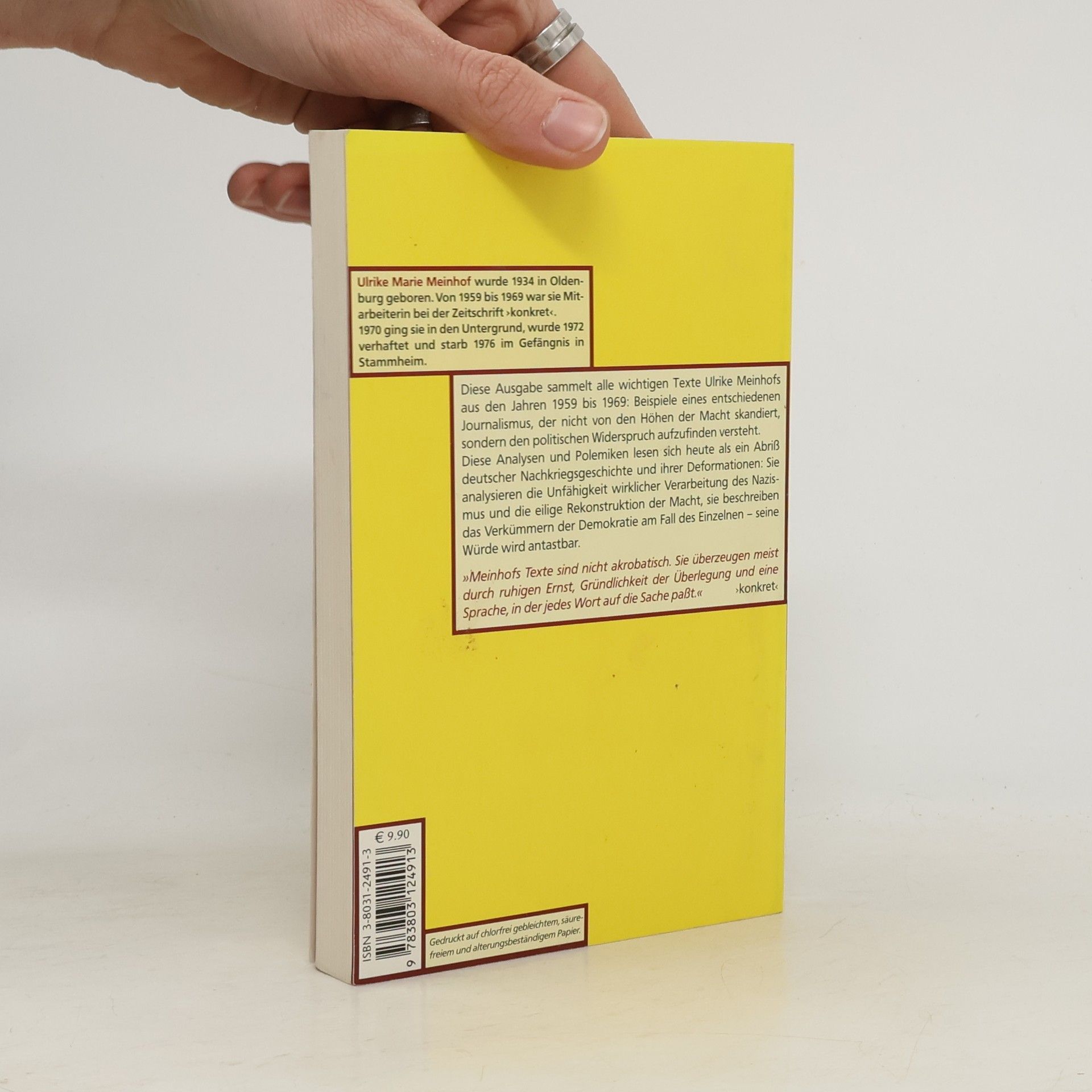Die wichtigsten Texte Ulrike Meinhofs sind ein Beispiel von entschiedenem Journalismus, der nicht vor den Höhen der Macht skandiert, sondern den politischen Widerspruch aufzufinden versteht, und zugleich ein Abriss deutscher Nachkriegsgeschichte: Sie analysieren die Unfähigkeit der Verarbeitung des Nazismus und die eilige Rekonstruktion der Macht, sie beschreiben das Verkümmern der Demokratie am Fall des Einzelnen – seine Würde wird antastbar.