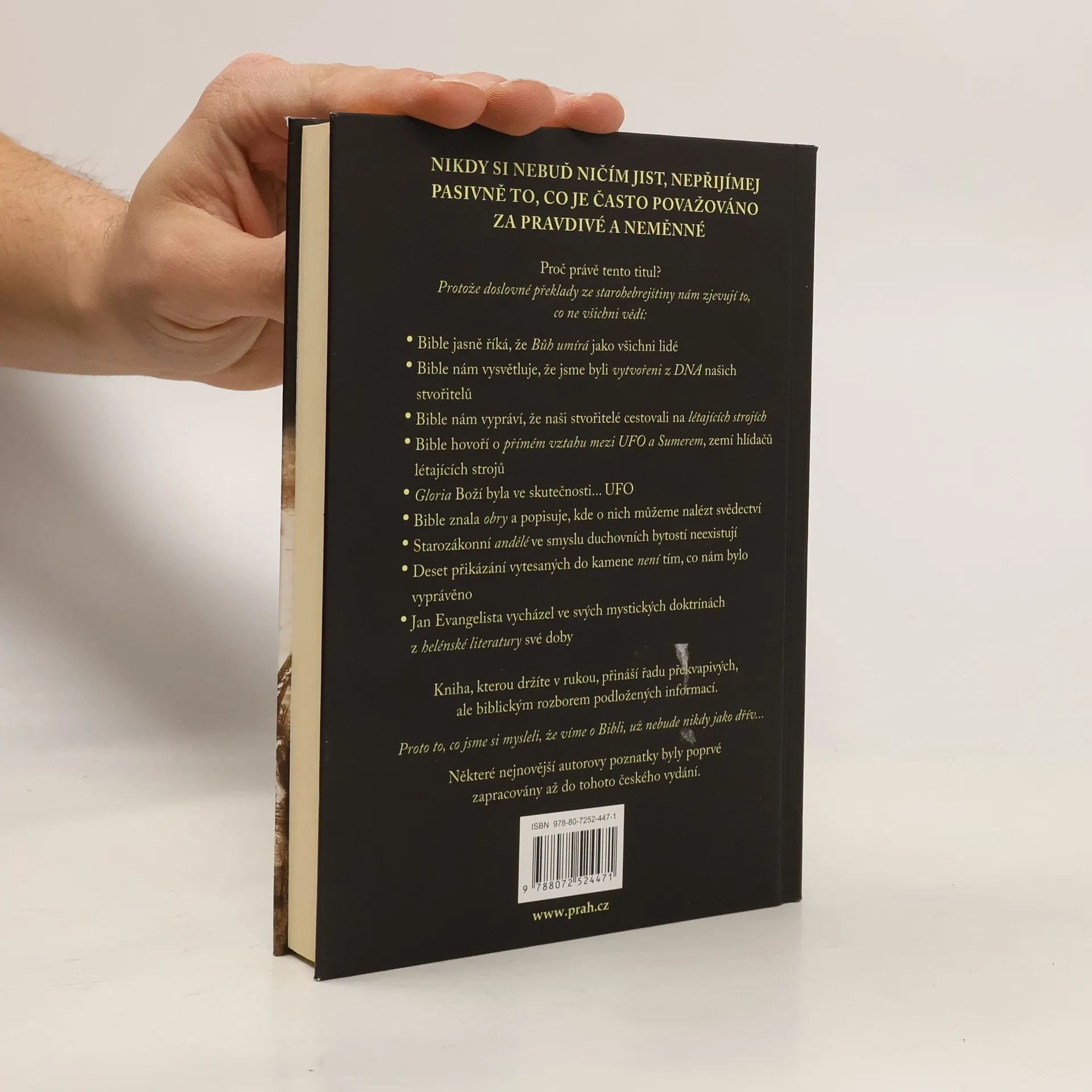 Důkazy jsou přímo v Bibli! Nejpřesvědčivější kniha na toto téma – bestseller v Itálii! Doslovné překlady ze starohebrejštiny nám zjevují to, co ne všichni vědí: Bible jasně říká, že Bůh umírá jako všichni lidé Bible nám vysvětluje, že jsme byli vytvořeni z DNA našich stvořitelů Bible nám vypráví, že naši stvořitelé cestovali na létajících strojích Bible hovoří o přímém vztahu mezi UFO a Sumerem, zemí hlídačů létajících strojů Gloria Boží byla ve skutečnosti... UFO Bible znala obry a popisuje, kde o nich můžeme nalézt svědectví Starozákonní andělé ve smyslu duchovních bytostí neexistují Deset přikázání vytesaných do kamene není tím, co nám bylo vyprávěno Jan Evangelista vycházel ve svých mystických doktrínách z helénské literatury své doby Proto to, co jsme si mysleli, že víme o Bibli, už nebude nikdy jako dřív...