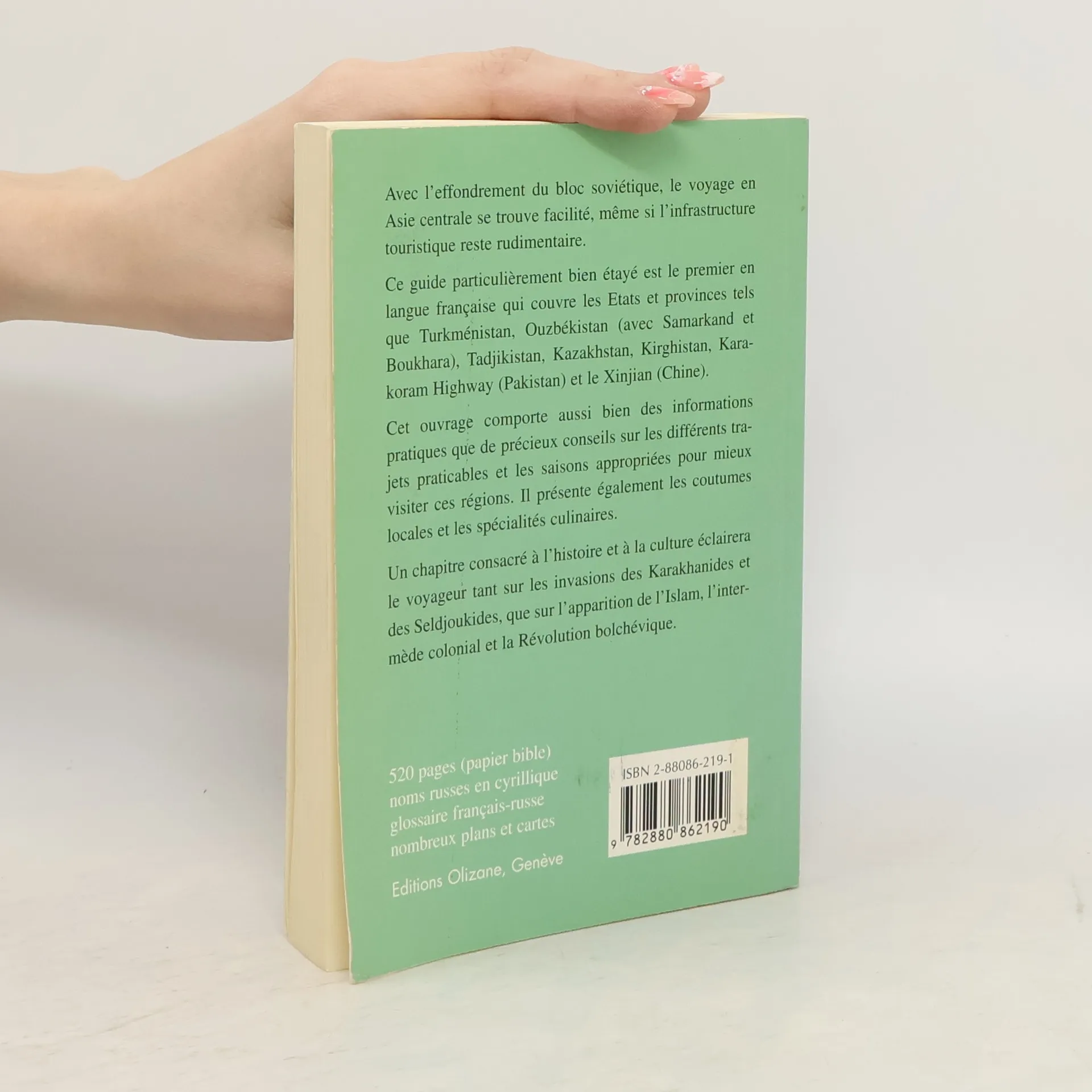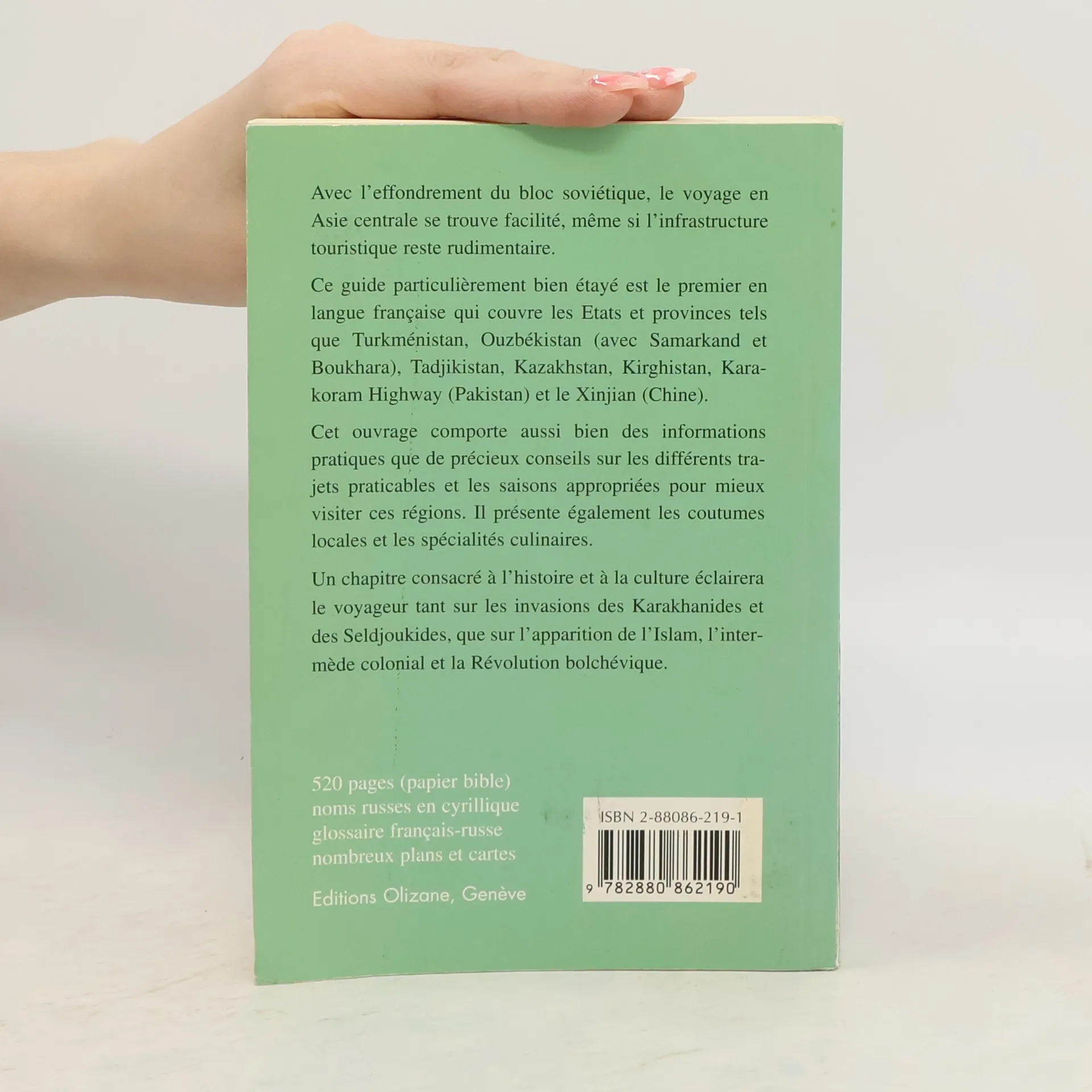 Ce guide particulièrement bien étayé couvre les États et provinces tels que Turkménistan, Ouzbékistan (avec Samarcande et Boukhara), Tadjikistan, Kazakhstan, Kirghizistan, Karakoram Highway (Pakistan) et le Sin-Kiang (Chine). Il propose aussi bien des informations pratiques que des conseils utiles sur les différents trajets praticables et les saisons appropriées pour mieux profiter de ces régions. Il apportera également des éclaircissements sur les différentes sociétés qui composent cette région du monde, avec leur culture, leur histoire ou encore leurs spécialités culinaires.Format : 19 x 13 cm; broché.