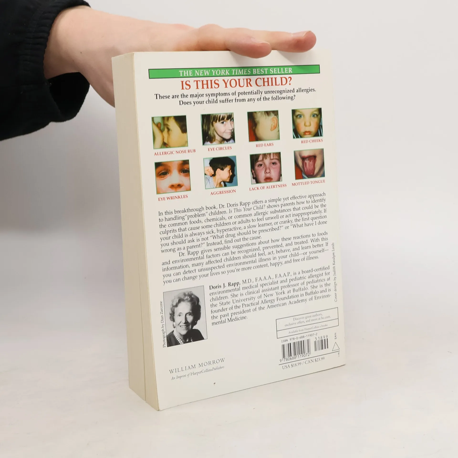 IS THIS YOUR CHILD? These are the major symptoms of potentially unrecognized allergies. Does your child suffer from any of the following? • Allergic Nose Rub • Eye Circles • Red Ears • Red Cheeks • Eye Wrinkles • Aggression • Lack of Alertness • Mottled Tongue • In this breakthrough book, Dr. Doris Rapp offers a simple yet effective approach to handling "problem" children. Is This Your Child? shows parents how to identify the common foods, chemicals, or common allergic substances that could be the culprits that cause some children or adults to feel unwell or act inappropriately. If your child is always sick, hyperactive, a slow learner, or cranky, the first question you should ask is not "What drug should be prescribed?" or "What have I done wrong as a parent?" Instead, find out the cause. Dr. Rapp gives sensible suggestions about how these reactions to foods and environmental factors can be recognized, prevented, and treated. With this information, many affected children should feel, act, behave, and learn better. If you can detect unsuspected environmental illness in your child--or yourself--you can change your lives so you're more content, happy, and free of illness.