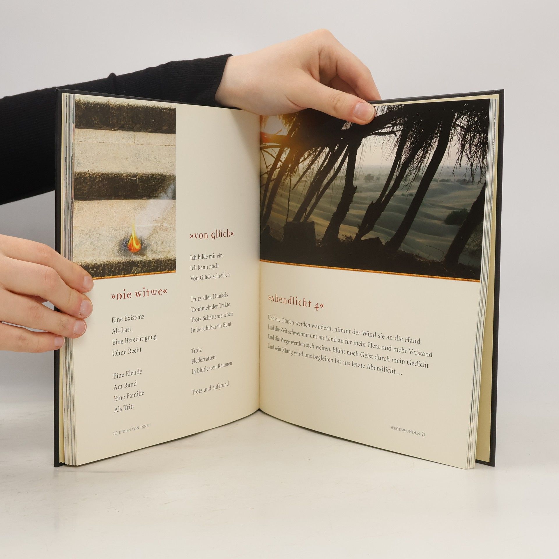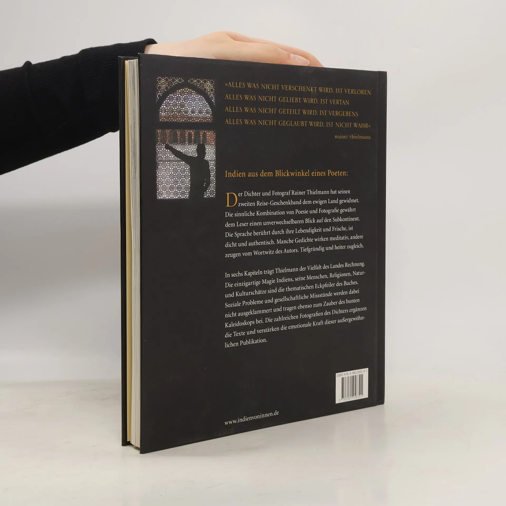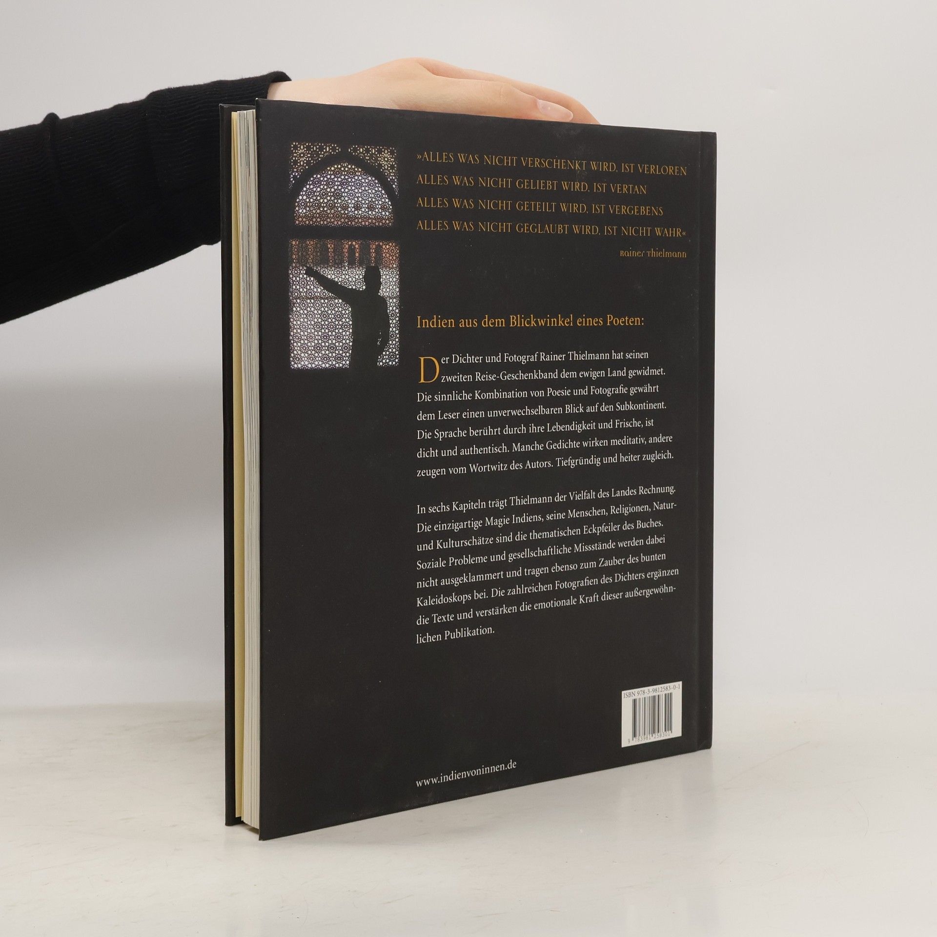 Indien aus dem Blickwinkel eines Poeten: Der Dichter und Fotograf Rainer Thielmann hat seinen zweiten Reise-Geschenkband dem ewigen Land gewidmet. Die sinnliche Kombination von Poesie und Fotografie gewährt dem Leser einen unverwechselbaren Blick auf den Subkontinent. Die Sprache berührt durch ihre Lebendigkeit und Frische, ist dicht und authentisch. Manche Gedichte wirken meditativ, andere zeugen vom Wortwitz des Autors. Tiefgründig und heiter zugleich. In sechs Kapiteln trägt Thielmann der Vielfalt des Landes Rechnung. Die einzigartige Magie Indiens, seine Menschen, Religionen, Natur- und Kulturschätze sind die thematischen Eckpfeiler des Buches. Soziale Probleme und gesellschaftliche Missstände werden dabei nicht ausgeklammert und tragen ebenso zum Gelingen des bunten Kaleidoskops bei. Die zahlreichen Fotografien des Dichters ergänzen die Texte und verstärken die emotionale Kraft dieser außergewöhnlichen Publikation.