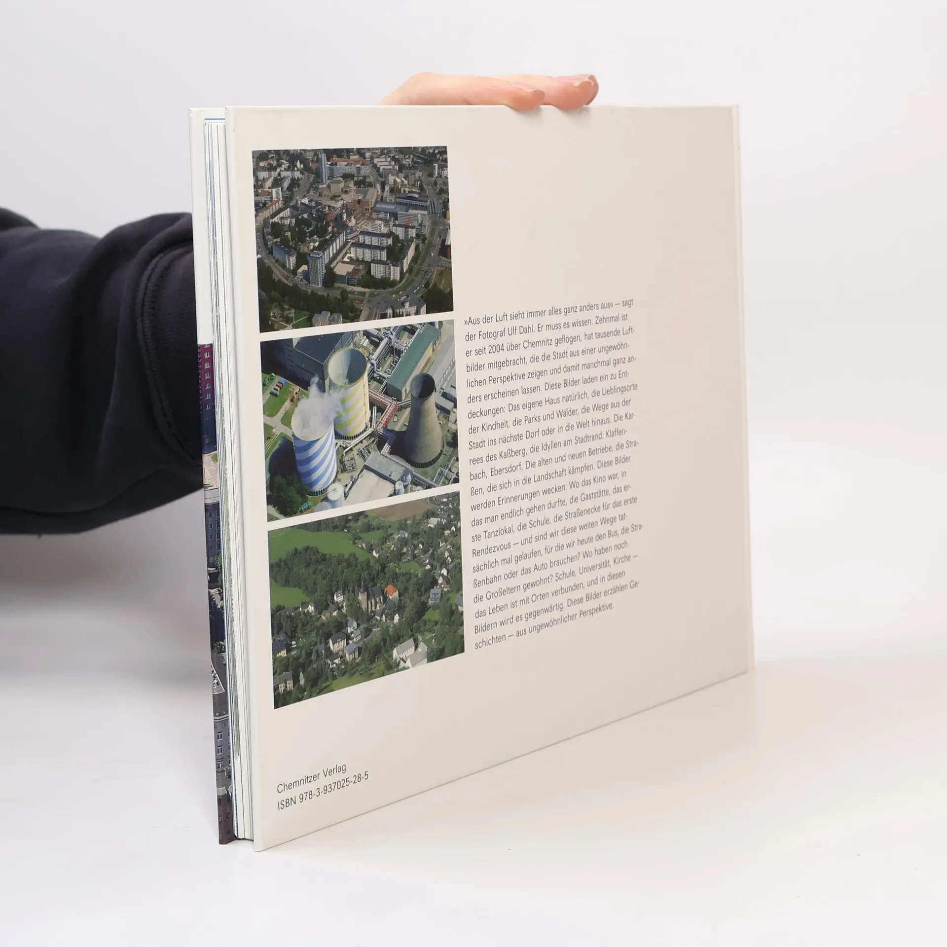 „Aus der Luft sieht immer alles ganz anders aus“ – sagt der Fotograf Ulf Dahl. Er muss es wissen. Zehnmal ist er seit 2004 über Chemnitz geflogen, hat tausende Luftbilder mitgebracht, die die Stadt aus einer ungewöhnlichen Perspektive zeigen und damit manchmal ganz anders erscheinen lassen. Diese Bilder laden ein zu Entdeckungen: Das eigene Haus natürlich, die Lieblingsorte der Kindheit, die Parks und Wälder, die Wege aus der Stadt ins nächste Dorf oder in die Welt hinaus. Die Karrees des Kaßberg, die Idyllen am Stadtrand: Klaffenbach, Ebersdorf. Die alten und neuen Betriebe, die Straßen, die sich in die Landschaft kämpfen. Diese Bilder werden Erinnerungen wecken: Wo das Kino war, in das man endlich gehen durfte, die Gaststätte, das erste Tanzlokal, die Schule, die Straßenecke für das erste Rendezvous – und sind wir diese weiten Wege tatsächlich mal gelaufen, für die wir heute den Bus, die Straßenbahn oder das Auto brauchen? Wo haben noch die Großeltern gewohnt? Schule, Universität, Kirche – das Leben ist mit Orten verbunden, und in diesen Bildern wird es gegenwärtig. Diese Bilder erzählen Geschichten – aus ungewöhnlicher Perspektive.