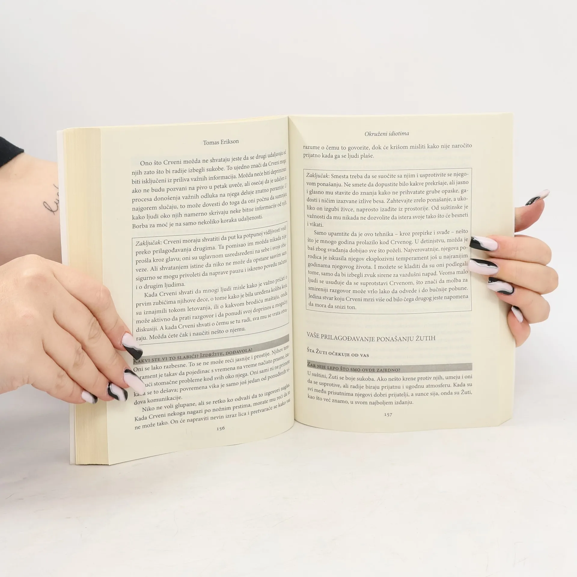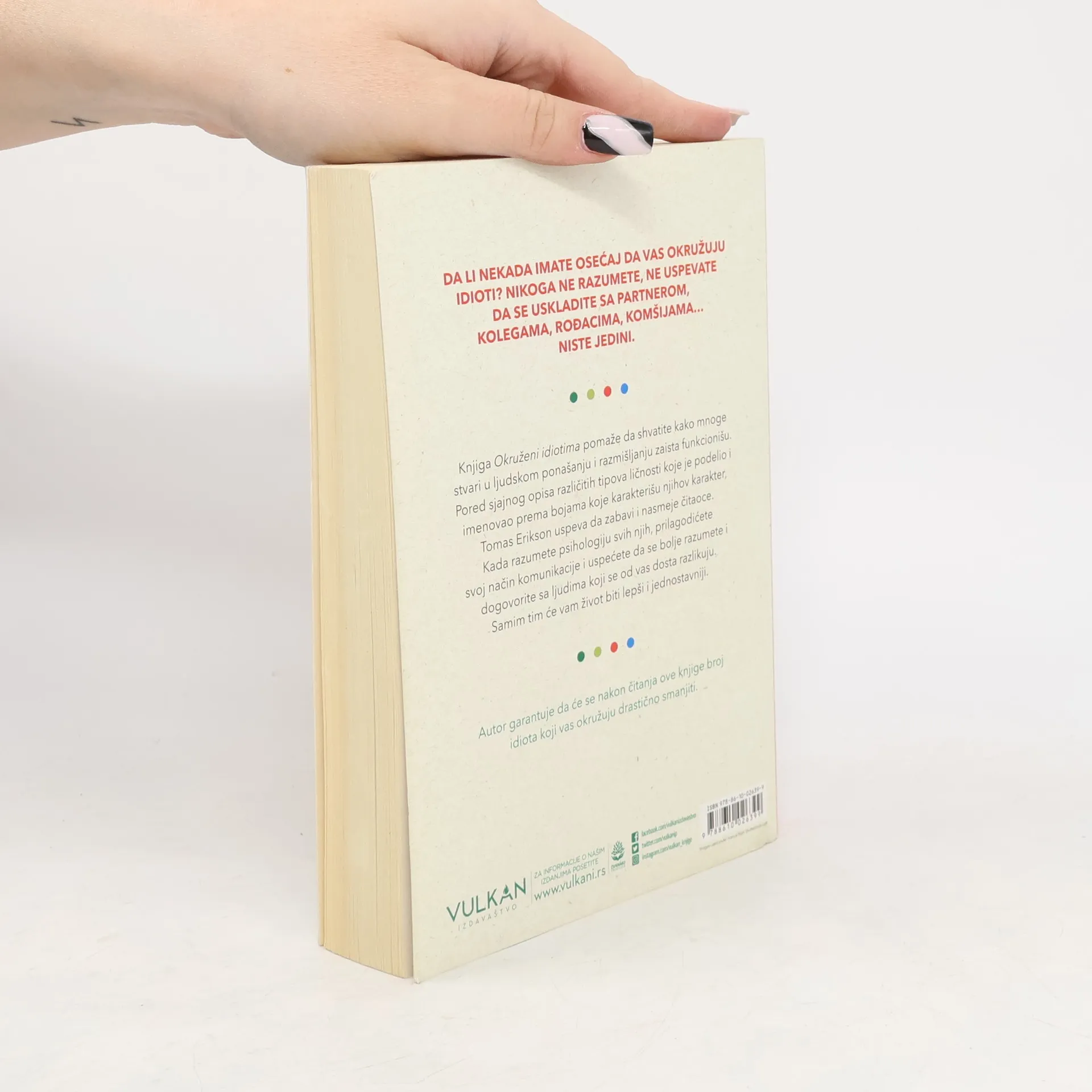 Da li nekada imate osećaj da vas okružuju idioti? Nikoga ne razumete, ne uspevate da se uskladite sa partnerom, kolegama, rođacima, komšijama…<br /><br />Niste jedini. Knjiga Okruženi idiotima pomaže da shvatite kako mnoge stvari u ljudskom ponašanju i razmišljanju zaista funkcionišu. Pored sjajnog opisa različitih tipova ličnosti koje je podelio i imenovao prema bojama koje karakterišu njihov karakter, Tomas Erikson uspeva da zabavi i nasmeje čitaoce.<br /><br />Kada razumete psihologiju svakog tipa ličnosti, lakše ćete prilagoditi svoj način komunikacije sa njima i uspećete da se lakše sporazumete i dogovorite sa ljudima koji se od vas dosta razlikuju. Samim tim će vam život biti lepši i jednostavniji.<br /><br />Autor garantuje da će se nakon čitanja ove knjige broj idiota koji vas okružuje drastično smanjiti.