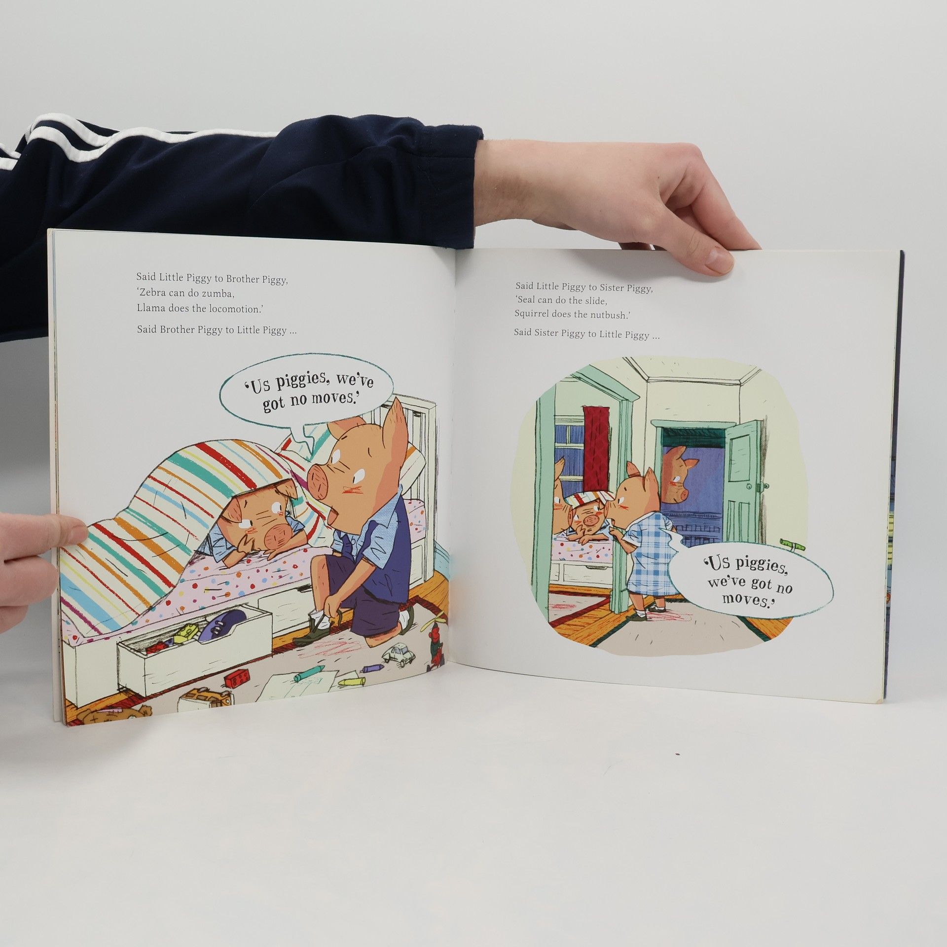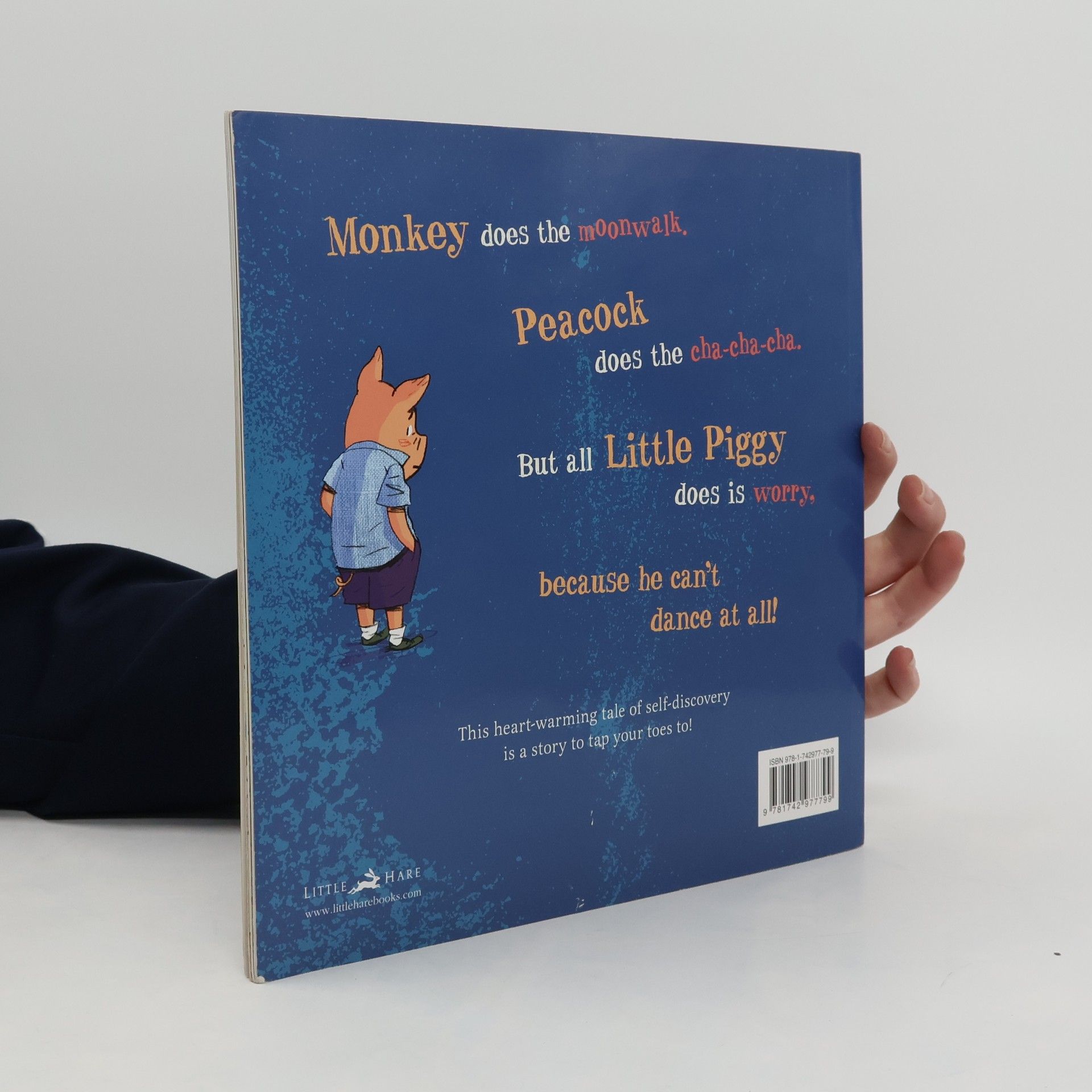 •Monkey does the moonwalk. Peacock does the cha-cha-cha. But all Little Piggy does is worry. •Little Piggy is lead to believe he just can’t dance. He aspires to dance the nut brush like his friend squirrel and the locomotion like Llama but he just lacks self belief. •Until one day his tail begins to twitch and his knees begin to quiver and Little Piggy discovers his own very special style of dance.