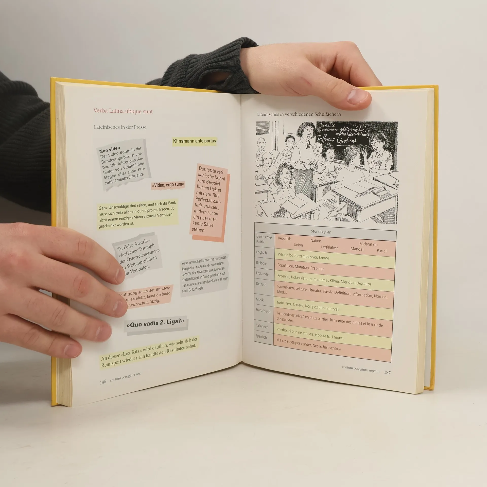 Kennzeichnend für 'Salvete ' sind die Begegnung der Moderne mit der Antike, motivierende Themen und Übungen, die harmonische Gestaltung der A- und B-Texte, eine auf die Lernsituation heutiger Kinder abgestimmte Grammatik- und Wortschatzvermittlung und die optische Attraktivität des Lehrwerks. Begegnung Moderne - Antike Die Welt der Antike wird den Kindern durch zahlreiche Zeichnungen von Alltagsszenen, Abbildungen antiker Monumente und Schülerzeichnungen anschaulich vermittelt. Römische Ausgrabungsstätten und Monumente aus dem deutschsprachigen Raum spielen dabei eine besondere Rolle; die Lektionen geben Anknüpfungspunkte für projektorientierte Arbeitsformen und Exkursionen. Reduktion der Grammatik 'Salvete' bietet eine ausgewogene, der heutigen Lernsituation angemessene Grammatikverteilung: Der Beginn des Sprachlehrgangs (Lektion 1-9) konzentriert sich bewusst auf die a- und o- Deklination und a- und e-Konjugation sowie 'ire,' um das Pensum überschaubar zu halten. Lektürewichtige Grammatikphänomene wie 'AcI' und 'Participium coniunctum' werden früh eingeführt (Lektion 12 bzw. 21) und in nachfolgenden Lektionen ausführlich wiederholt. 'Oratio obliqua' , 'Supine' und 'relative Satzverschränkung' wurden in die Lektürephase verlagert. Vielfältige Übungsformen Vielfältige, auf verschiedene Lerntypen abgestimmte Übungen festigen die Kenntnisse in den Bereichen Formenlehre und Syntax, Wortkunde und Sprachvergleich. Zusätzliche zusammenfassende Übungen wiederholen die Grammatik mehrerer Lektionen. Weiteres umfangreiches Übungsmaterial bieten die Arbeitshefte und die Multimedia-Lernsoftware. Einbeziehung von Originaltexten Eine entsprechend den wachsenden Kenntnissen der Lerngruppe zunehmende Einbeziehung von Originaltexten bereitet auf die Lektürephase vor und stellt lateinische Autoren von Cicero und Sallust bis Jacobus a Voragine (13. Jh.) vor. Erste kurze Originalinschriften sind schon in Lektion 2 und nach Lektion 9 aufgenommen. Ab Lektion 31 enthält jede Themeneinheit einen längeren originalen Textabschnitt. Lektion 60 bietet 2 Doppelseiten originalen bzw. geringfügig bearbeiteten Text. Außerdem werden ab Lektion 19 regelmäßig thematisch nahe stehende Originaltexte zum Vergleich angeboten. Die Textauswahl orientiert sich an der klassischen Latinität. Neben den erzählenden Texten sind u. a. die Gattungen Brief, Anekdote, Inschrift, Fabel, Parabel, Geschichtsschreibung und Komödie vertreten. Latein und die modernen Fremdsprachen Wortschatz- und Grammatikvermittlung nutzen systematisch Vorkenntnisse aus der Fremdsprache Englisch. Die Seiten 'Verba Latina ubique sunt' führen eindrucksvoll vor Augen, wie nützlich Lateinkenntnisse für das Erlernen von Fremdsprachen und das Verständnis deutscher Fremdwörter sind. Die bisherige Ausgabe von 'Salvete' ist bereits seit mehreren Jahren auch ab Klasse 5 erfolgreich im Einsatz. Kennzeichnend für 'Salvete ' sind - die Begegnung der Moderne mit der Antike, - motivierende Themen und Übungen, - eine auf die Lernsituation heutiger Kinder abgestimmte Grammatik- und Wortschatzvermittlung - und die optische Attraktivität. Das Lehrwerk nutzt systematisch die Vorkenntnisse aus der Fremdsprache Englisch. 'Salvete' erleichtert auch das Erlernen anderer Fremdsprachen. So führen die Seiten 'Verba Latina ubique sunt' eindrucksvoll vor Augen, wie nützlich Lateinkenntnisse für den Fremdsprachenerwerb und das Verständnis deutscher Fremdwörter sind. Umfangreiches Übungsmaterial bieten die Arbeitshefte, die Multimedia-Lernsoftware 'disco ' und viele Online-Begleitmaterialien.
