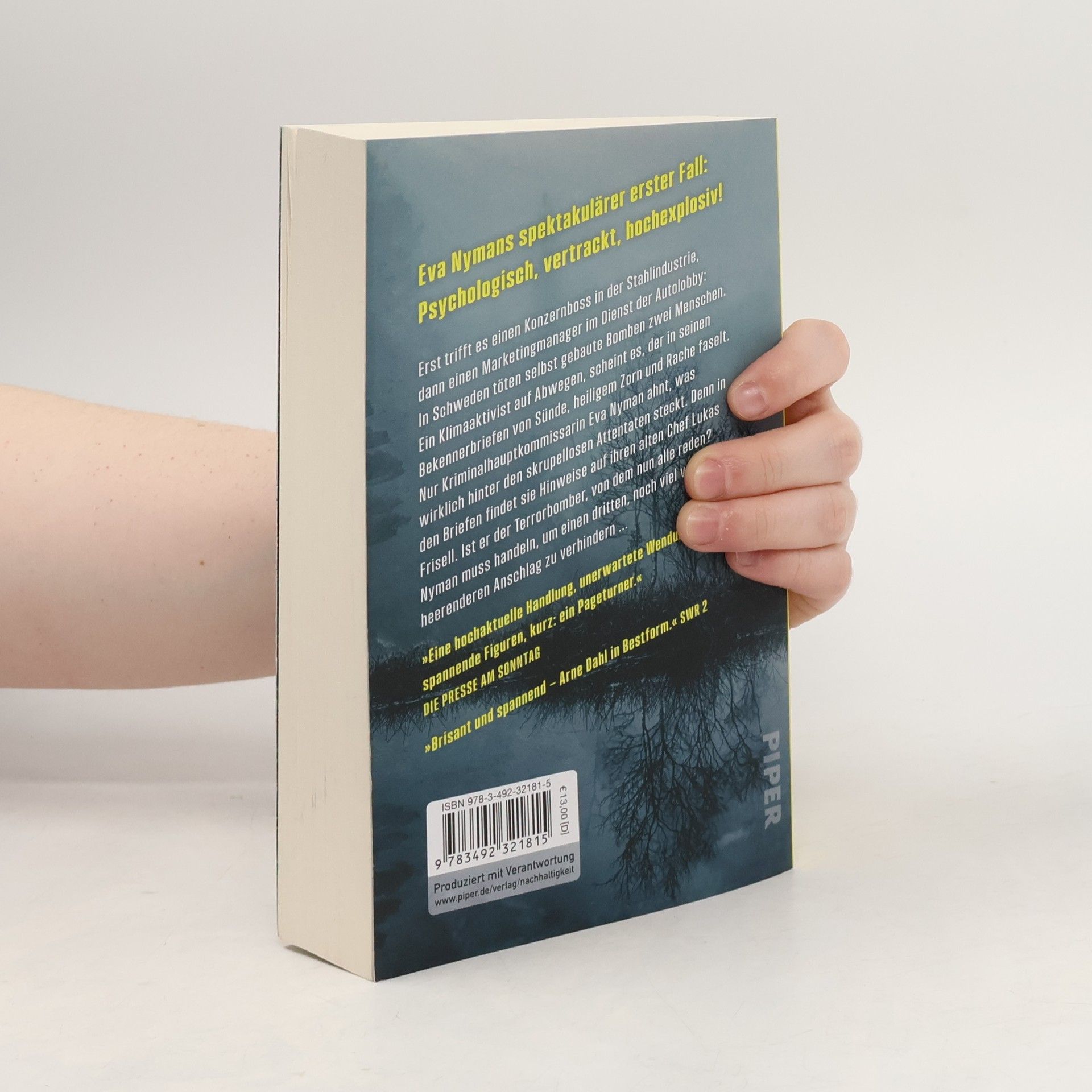 Eva Nymans 1. Fall: Verbrechen im Namen des Klimas Erst trifft es einen Konzernboss in der Stahlindustrie, dann einen Werber im Dienst der Autolobby: In Schweden töten selbst gebaute Bomben zwei Menschen, bevor der Attentäter Kontakt mit der Polizei aufnimmt – und mit mehr droht. Ein Klimaaktivist auf Abwegen, scheint es, der in seinen Briefen von Sünde, heiligem Zorn und Rache faselt. Nur Eva Nyman, Kriminalkommissarin und Chefin eines eingeschweißten kleinen Teams, ahnt, dass mehr hinter den skrupellosen Taten steckt. Was sie verschweigt: In den Briefen finden sich Hinweise auf ihren alten Vorgesetzten Lukas Frisell. Doch ist Frisell wirklich der »Terrorbomber«, von dem nun alle reden? Nyman muss handeln, um einen dritten, noch viel verheerenderen Anschlag zu verhindern ... Der spektakuläre Auftakt zur neuen Reihe: Psychologisch, vertrackt, hochexplosiv! »Von der groß angelegten Sozialkritik zum zutiefst Persönlichen, immer sprachlich brillant, durch die gute Recherche verbürgt und zu hochdramatischer Spannung verdichtet: Arne Dahls Roman überzeugt auf ganzer Linie. Gut möglich, dass dies seine beste Krimireihe werden wird.« Kapprakt »Arne Dahl zeigt einmal mehr, wie gut, glänzend geschrieben, witzig und leidenschaftlich aktuell ein Schwedenkrimi sein kann.« Skånska Dagbladet
