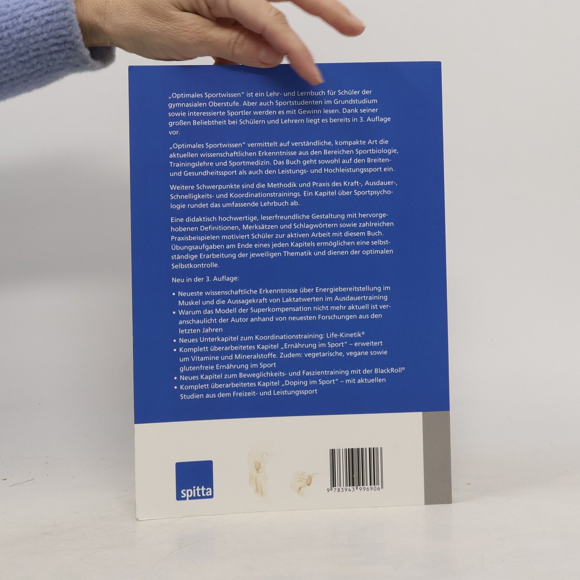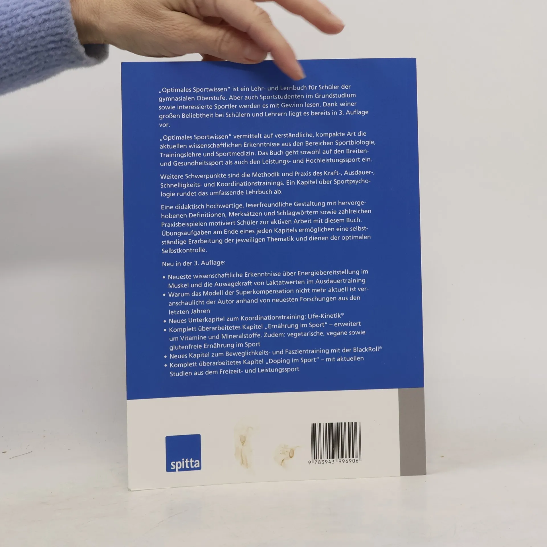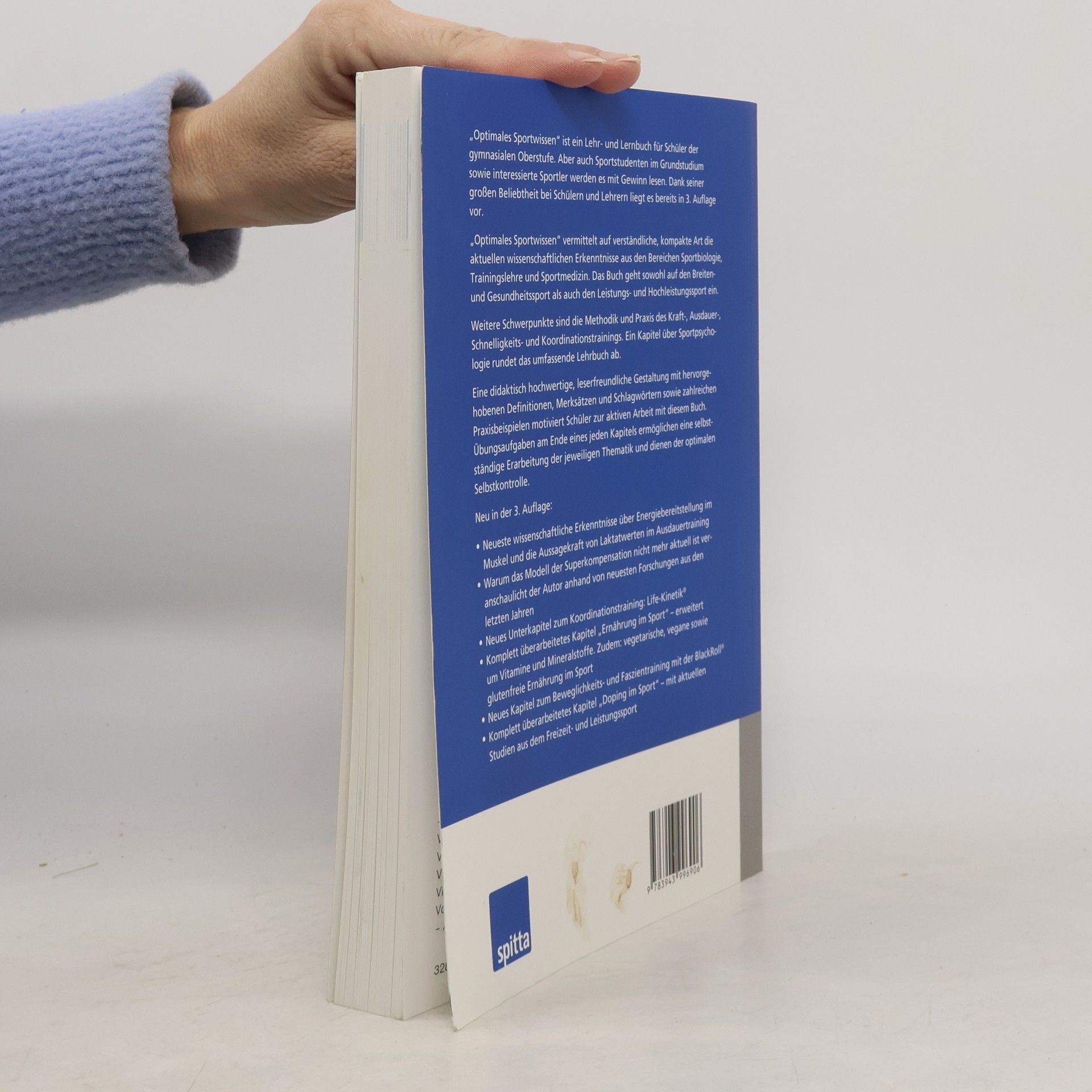„Optimales Sportwissen“ ist ein Lehr- und Lernbuch für Schüler der gymnasialen Oberstufe. Aber auch Sportstudenten im Grundstudium sowie interessierte Sportler werden es mit Gewinn lesen. Dank seiner großen Beliebtheit bei Schülern und Lehrern liegt es bereits in 3. Auflage vor. „Optimales Sportwissen“ vermittelt auf verständliche, kompakte Art die aktuellen wissenschaftlichen Erkenntnisse aus den Bereichen Sportbiologie, Trainingslehre und Sportmedizin. Das Buch geht sowohl auf den Breiten- und Gesundheitssport als auch den Leistungs- und Hochleistungssport ein. Weitere Schwerpunkte sind die Methodik und Praxis des Kraft-, Ausdauer-, Schnelligkeits- und Koordinationstrainings. Ein Kapitel über Sportpsychologie rundet das umfassende Lehrbuch ab. Eine didaktisch hochwertige, leserfreundliche Gestaltung mit hervorgehobenen Definitionen, Merksätzen und Schlagwörtern sowie zahlreichen Praxisbeispielen motiviert Schüler zur aktiven Arbeit mit diesem Buch. Übungsaufgaben am Ende eines jeden Kapitels ermöglichen eine selbständige Erarbeitung der jeweiligen Thematik und dienen der optimalen Selbstkontrolle. Neu in der 3. Auflage: Neueste wissenschaftliche Erkenntnisse über Energiebereitstellung im Muskel und die Aussagekraft von Laktatwerten im Ausdauertraining Warum das Modell der Superkompensation nicht mehr aktuell ist veranschaulicht der Autor anhand von neuesten Forschungen aus den letzten Jahren Neues Unterkapitel zum Koordinationstraining: Life Kinetik® Komplett überarbeitetes Kapitel „Ernährung im Sport“ – erweitert um Vitamine und Mineralstoffe. Zudem: vegetarische, vegane sowie glutenfreie Ernährung im Sport Neues Kapitel zum Beweglichkeits- und Faszientraining mit der BlackRoll® Komplett überarbeitetes Kapitel „Doping im Sport“ – mit aktuellen Studien aus dem Freizeit- und Leistungssport
