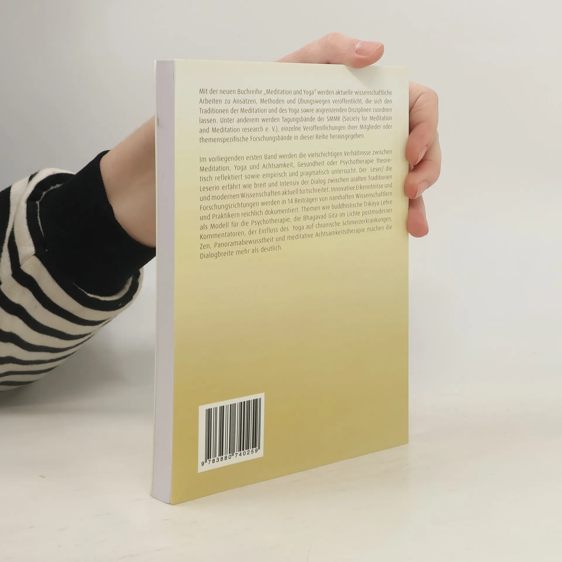Mit der neuen Buchreihe „Meditation und Yoga“ werden aktuelle wissenschaftliche Arbeiten zu Ansätzen, Methoden und Übungswegen veröffentlicht, die sich den Traditionen der Meditation und des Yoga sowie angrenzenden Disziplinen zuordnen lassen. Unter anderem werden Tagungsbände der SMMR (Society for Meditation and Meditation research e. V.), einzelne Veröffentlichungen ihrer Mitglieder oder themenspezifische Forschungsbände in dieser Reihe herausgegeben. Im vorliegenden ersten Band werden die vielschichtigen Verhältnisse zwischen Meditation, Yoga und Achtsamkeit, Gesundheit oder Psychotherapie theoretisch reflektiert sowie empirisch und pragmatisch untersucht. Der Leser/die Leserin erfährt wie breit und Intensiv der Dialog zwischen uralten Traditionen und modernen Wissenschaften aktuell fortschreitet. Innovative Erkenntnisse und Forschungsrichtungen werden in 14 Beiträgen von namhaften Wissenschaftlern und Praktikern reichlich dokumentiert. Themen wie buddhistische Trikaya-Lehre als Modell für die Psychotherapie, die Bhagavad Gita im Lichte postmoderner Kommentatoren, der Einfluss des Yoga auf chronische Schmerzerkrankungen, Zen, Panorama-bewusstheit und meditative Achtsamkeitstherapie machen die Dialogbreite mehr als deutlich.